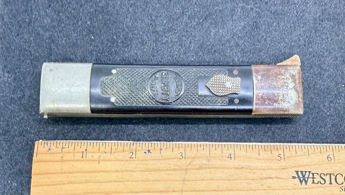 Folding Safety Knife, Style No. 1. Some wear and surface tarnish from handling. Good working condition. Folded length is approx. 5.5" and unfolded length is approx. 9.5".