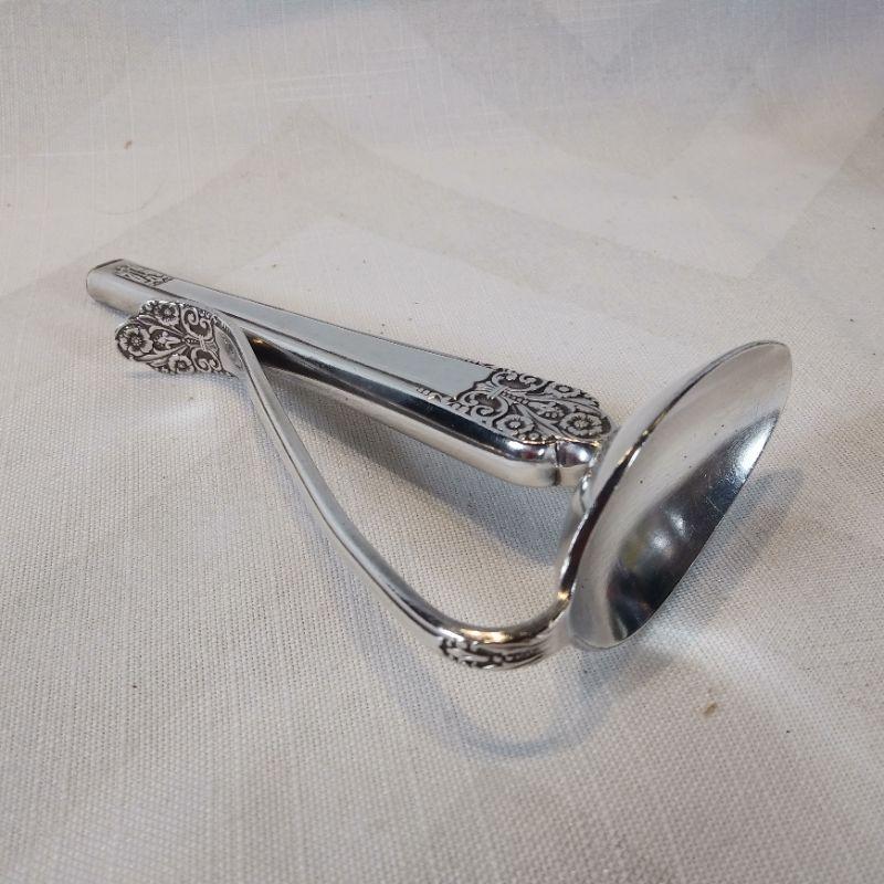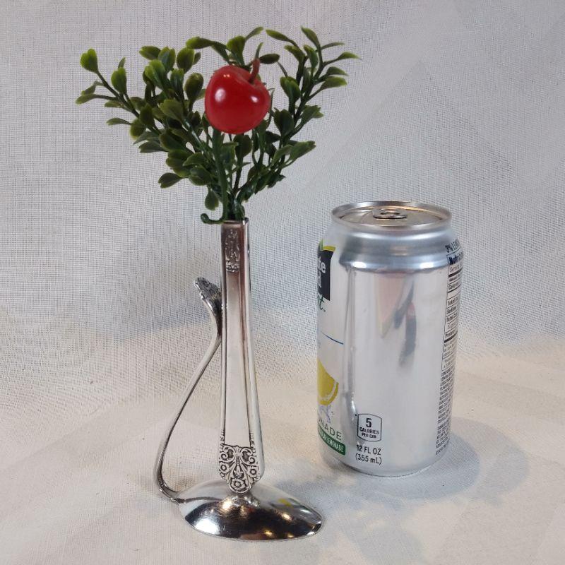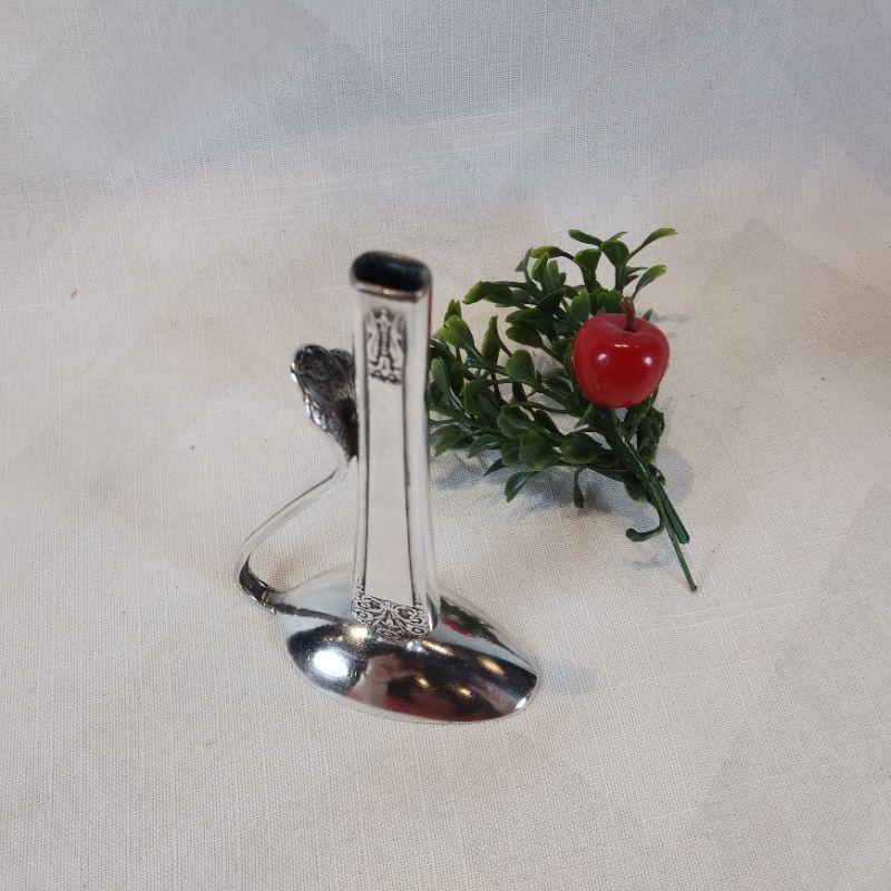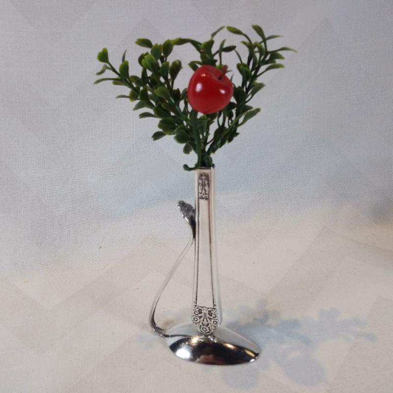 This auction lot is for a very creative Silver Plated Knife and Spoon Vase. The knife handle has been converted into a small vase supported by the spoon. Marked Rogers. It measures about 5 1/4-inches tall and in very good condition. Very unique.