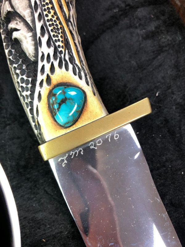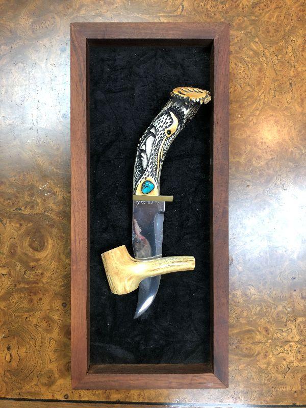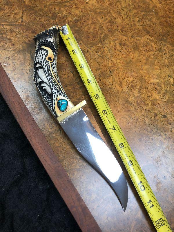 Native American Carved Handle Knife Art Display 16" x 7" ish Carved Stag Hunter is 11" knife by Ted Miller The handle has a brass guard and a carved crown stag grip with turquoise and jasper inlays.
