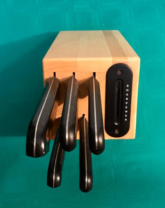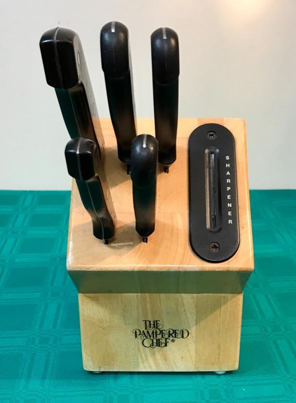 Set of 5 knives with wooden knife block, includes a sharpener slot in the block. Made by The Pampered Chef. Block with knives inserted measures approx 11” tall x 5” wide x 12” deep.