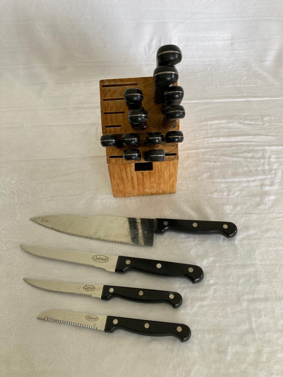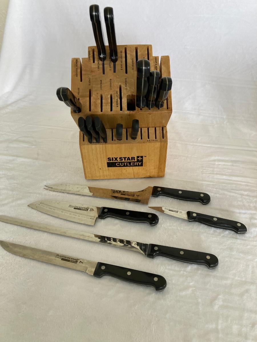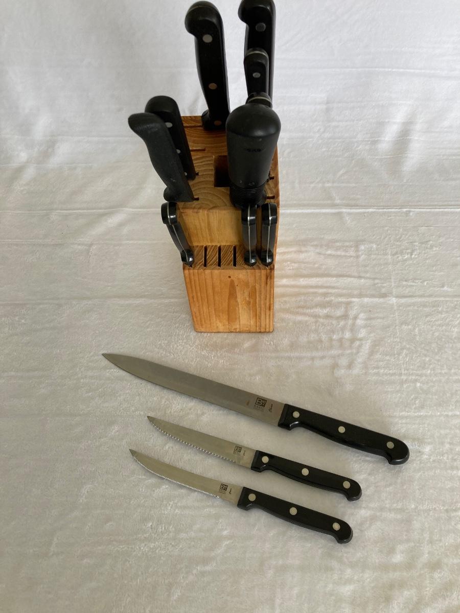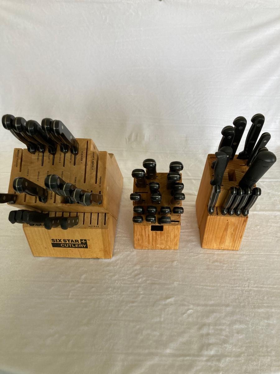 Be Basic Essentials. One Ginsu Chef Knife. Three Wood knife blocks included.