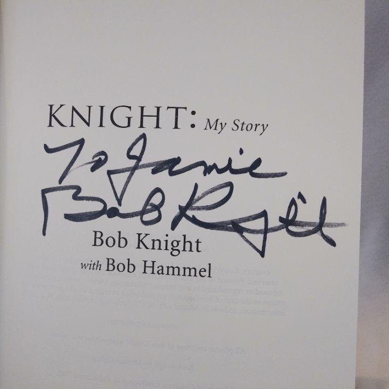 This offering is for a hardbound copy of the memoirs of Indiana University's most famous basketball coach. The book was written by Bob Knight with Bob Hammel. This book is a First Edition and contains a rare Bob Knight autograph. It has 387 pages with intact dust cover. Appears unread. Reserve/Starting Bid is $10.