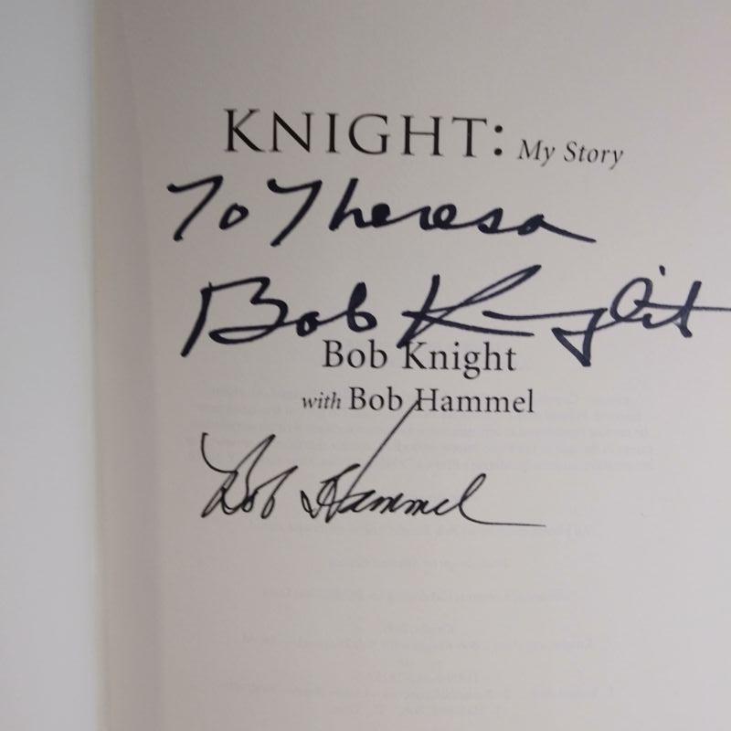 AUTOGRAPHED - First Edition! "Knight My Story" by Bob Knight with Bob Hammel, 2002. Thomas Dunne Books. 387 pages, indexed. Inscribed and signed by both former Indiana coach Bob Knight and Bob Hammel on the title page.. Jacket has bumpy lamination on lower front where a sticker was previously placed. Jacket is VERY GOOD, Book is FINE