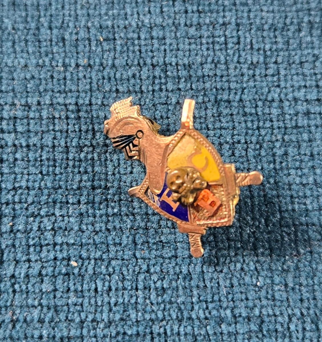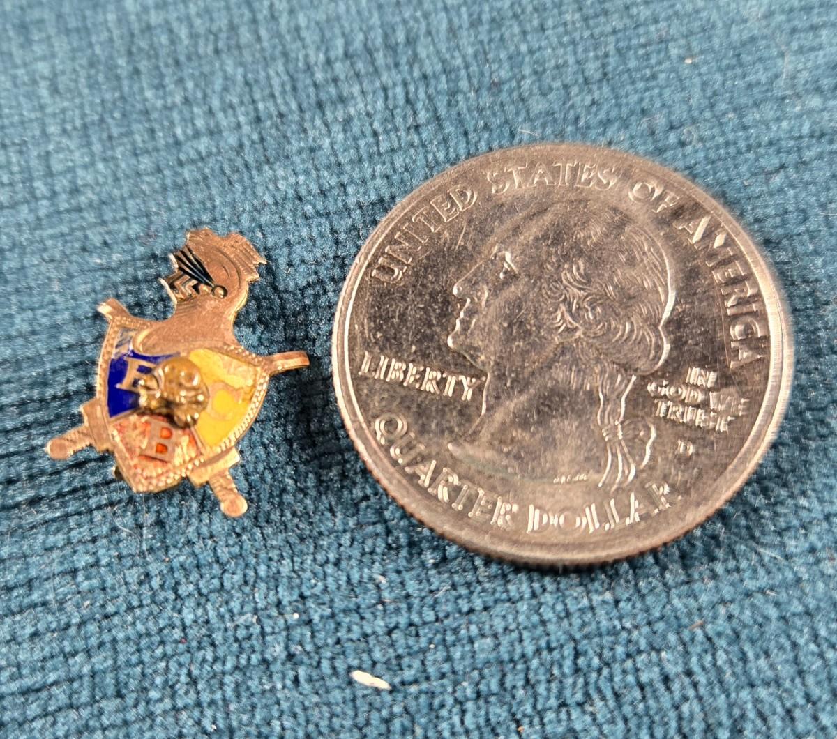 This auction lot is for a Knights of Pythias Circa 1880 Pin. This is a very small Knights of Pythias Pin from 1880. It is Gold and Enamel. It is missing the pin arm in the back. The Knights of Pythias is a fraternal organization and secret society founded in Washington DC on February 19, 1864. It was the first fraternal organization to receive a charter under an act of the United States Congress. Their motto is "Friendship, Charity, Benevolence".