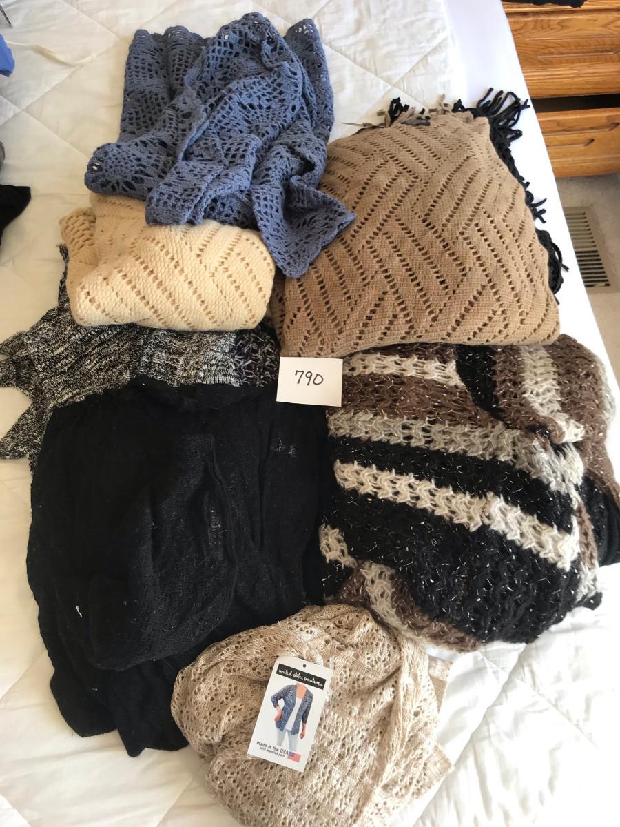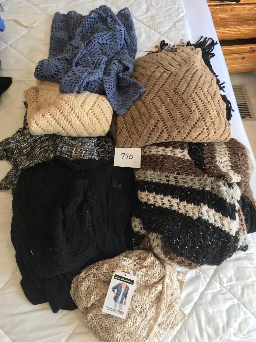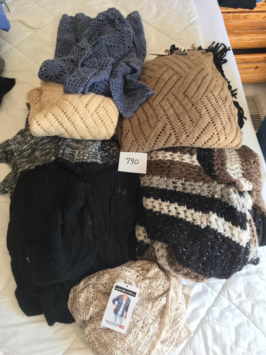 On clothing: New, some with tags! Please see photos for quantity, colors, size, and condition. Please, also most items are Large or XL in women's clothing.