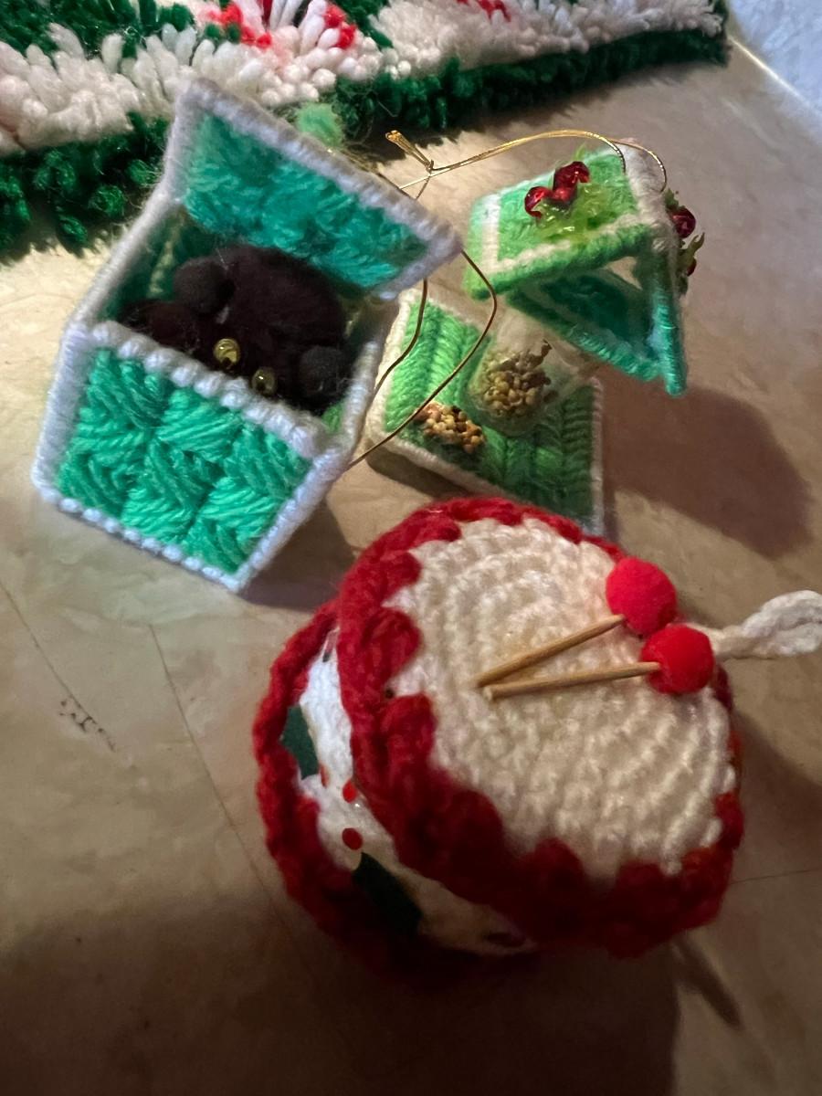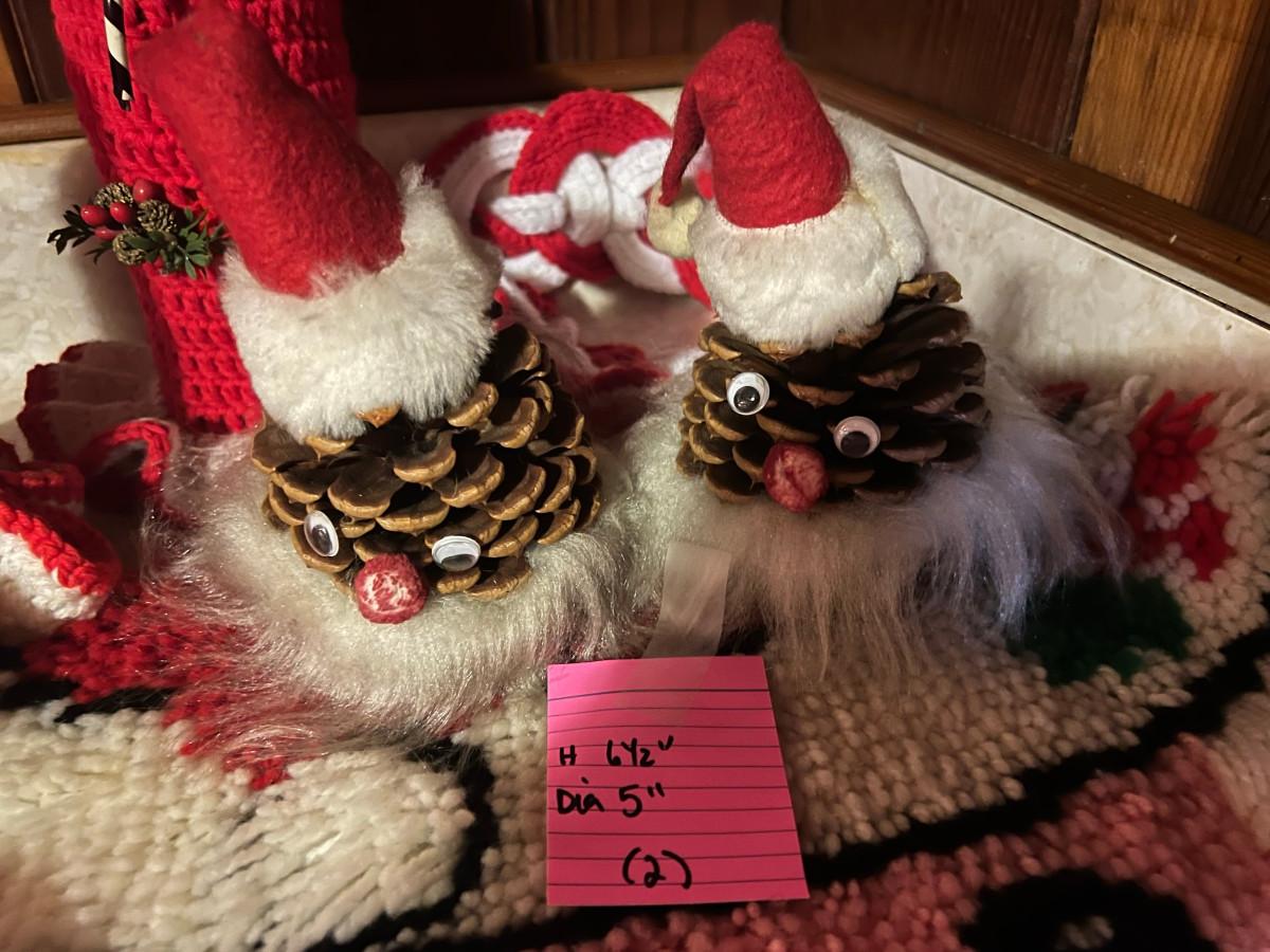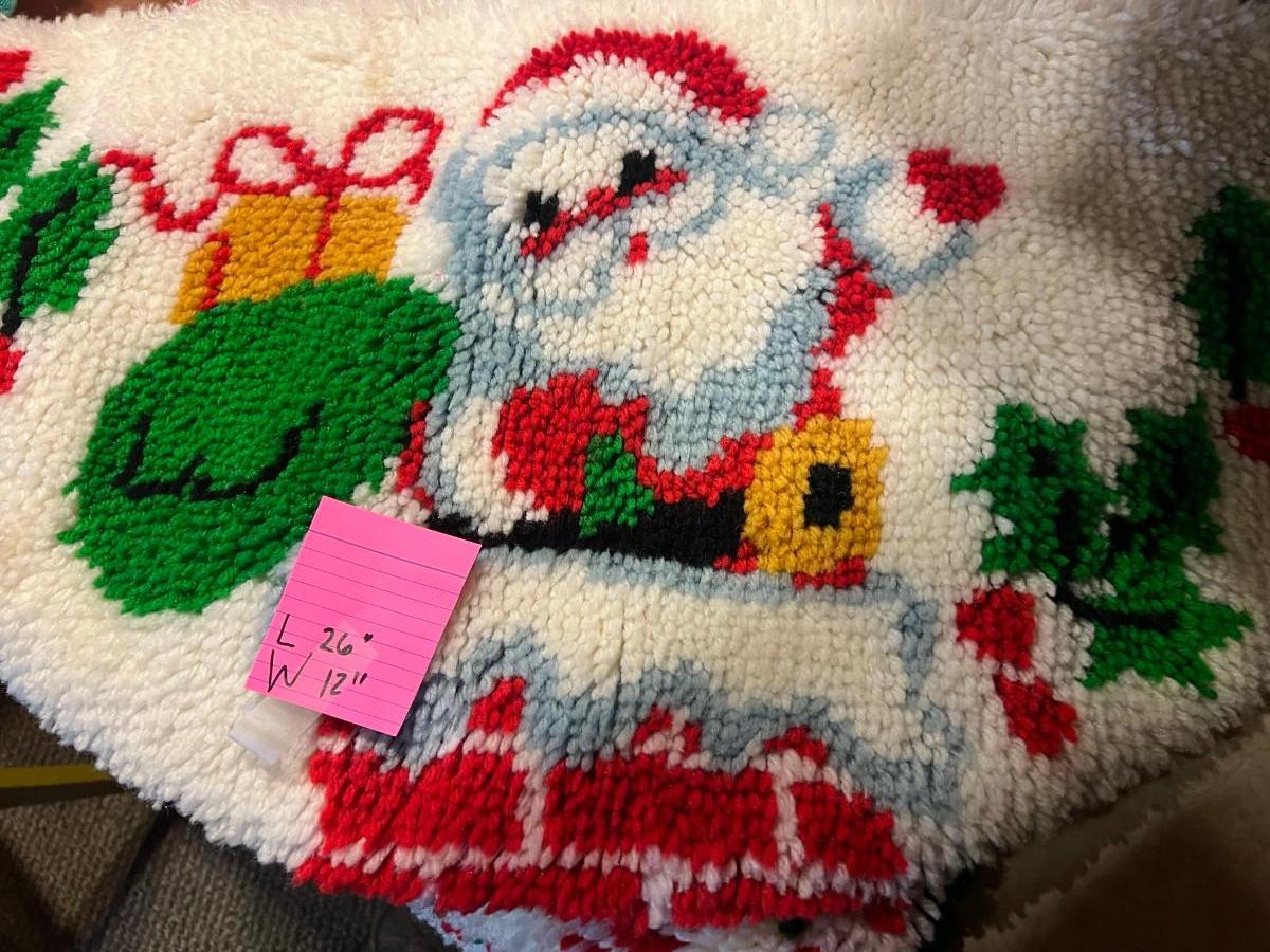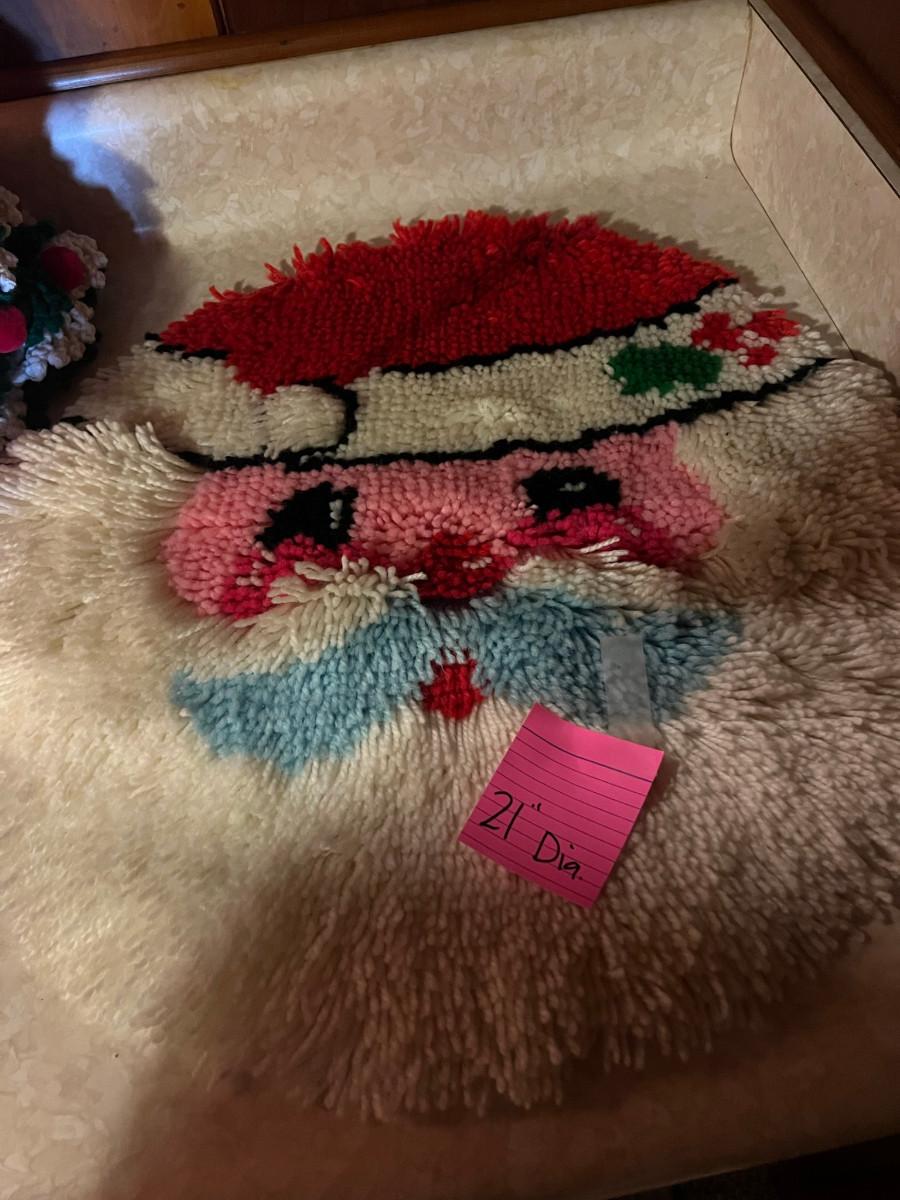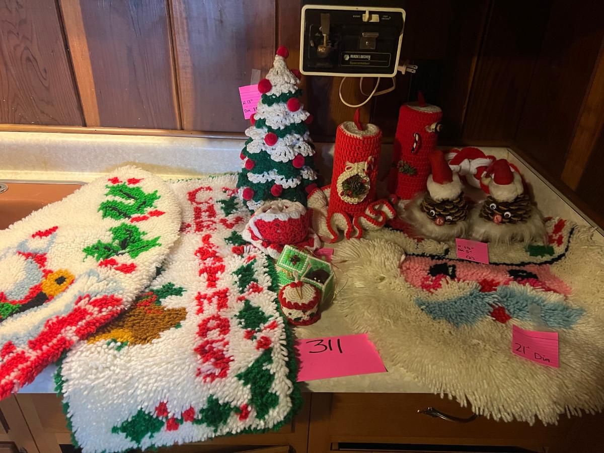 Knitted Christmas items and décor X-mas rugs 1. 21" diameter, 2. 33" x 17", 3. 26" x 12", 2x candles 10.5" x 7", tree 13" x 8.5", Jack in the box, drum, santa pin, bird house, cup holder, trivet, and 2 pinecone people