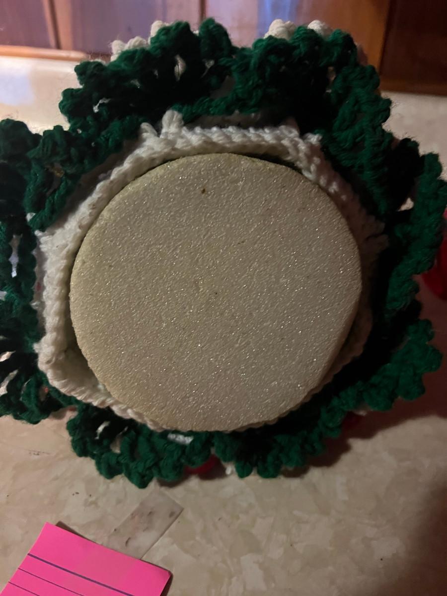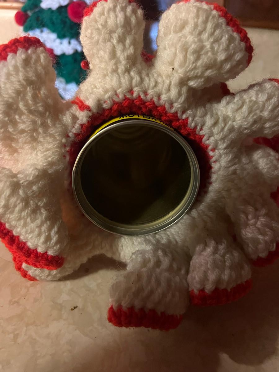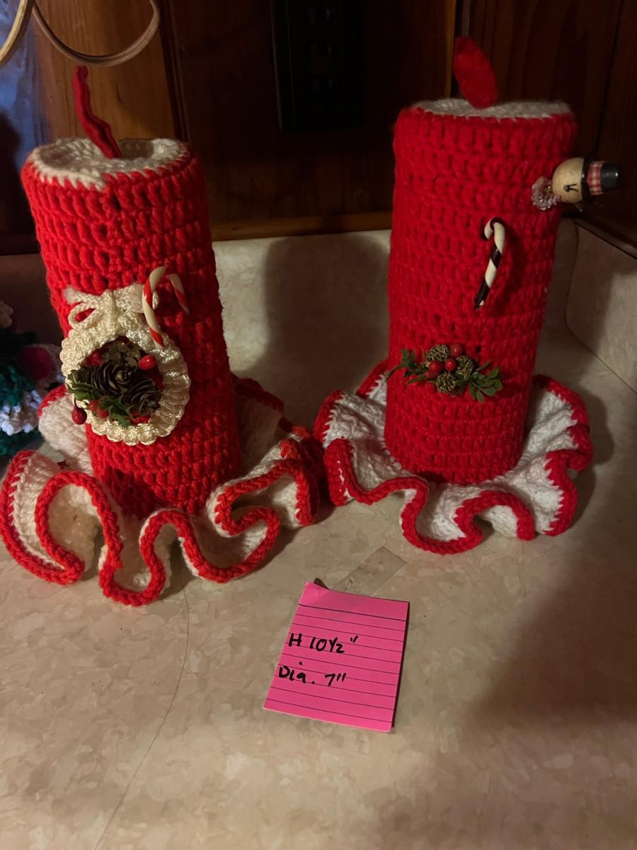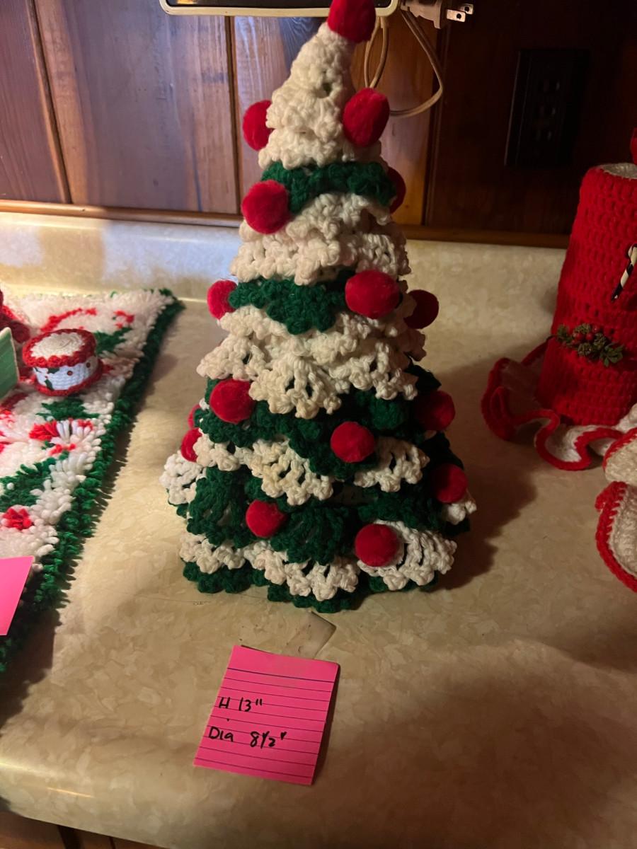 Knitted Christmas items and décor X-mas rugs 1. 21" diameter, 2. 33" x 17", 3. 26" x 12", 2x candles 10.5" x 7", tree 13" x 8.5", Jack in the box, drum, santa pin, bird house, cup holder, trivet, and 2 pinecone people