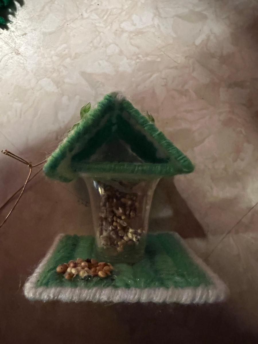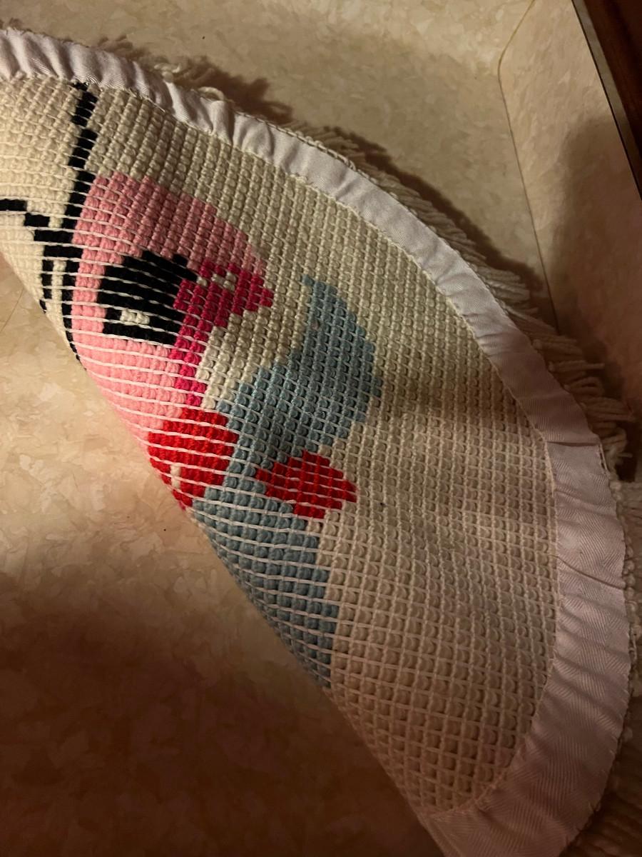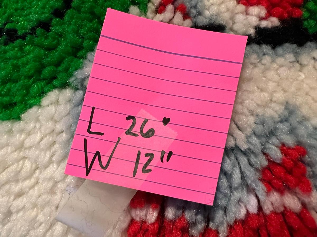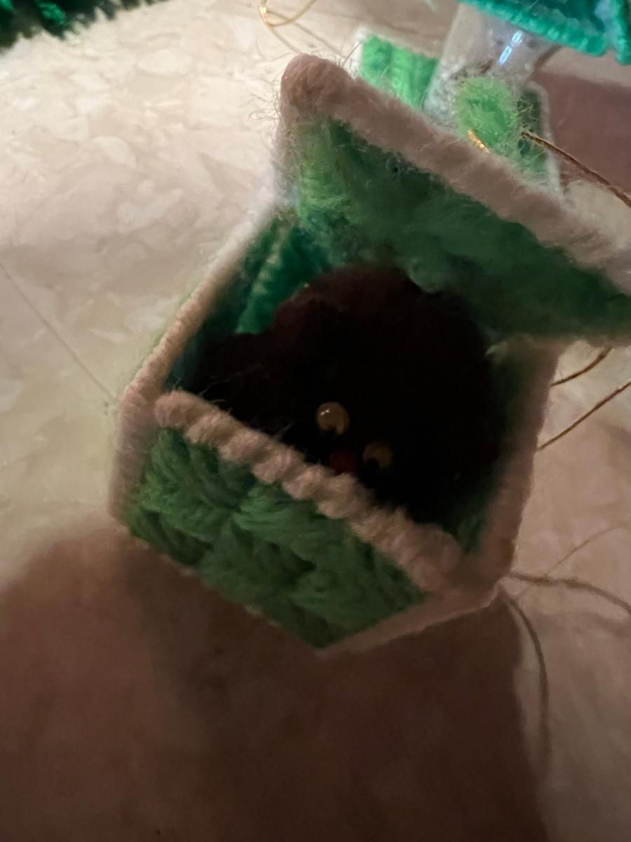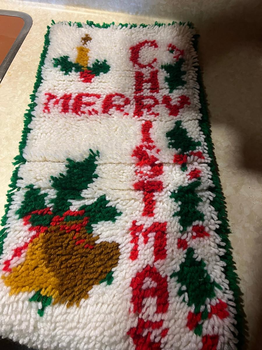 Knitted Christmas items and décor X-mas rugs 1. 21" diameter, 2. 33" x 17", 3. 26" x 12", 2x candles 10.5" x 7", tree 13" x 8.5", Jack in the box, drum, santa pin, bird house, cup holder, trivet, and 2 pinecone people