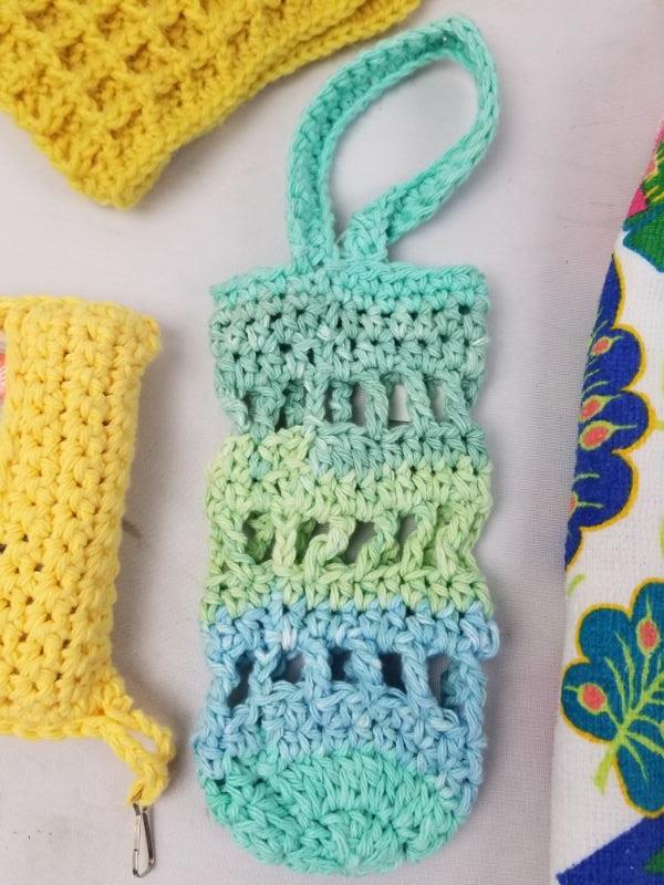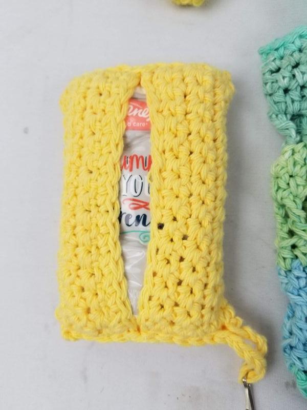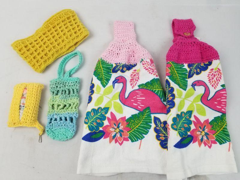 Knitted/Crocheted Goods Lot: 2 Kitchen Towels, Headband, Tissue Holder, etc.