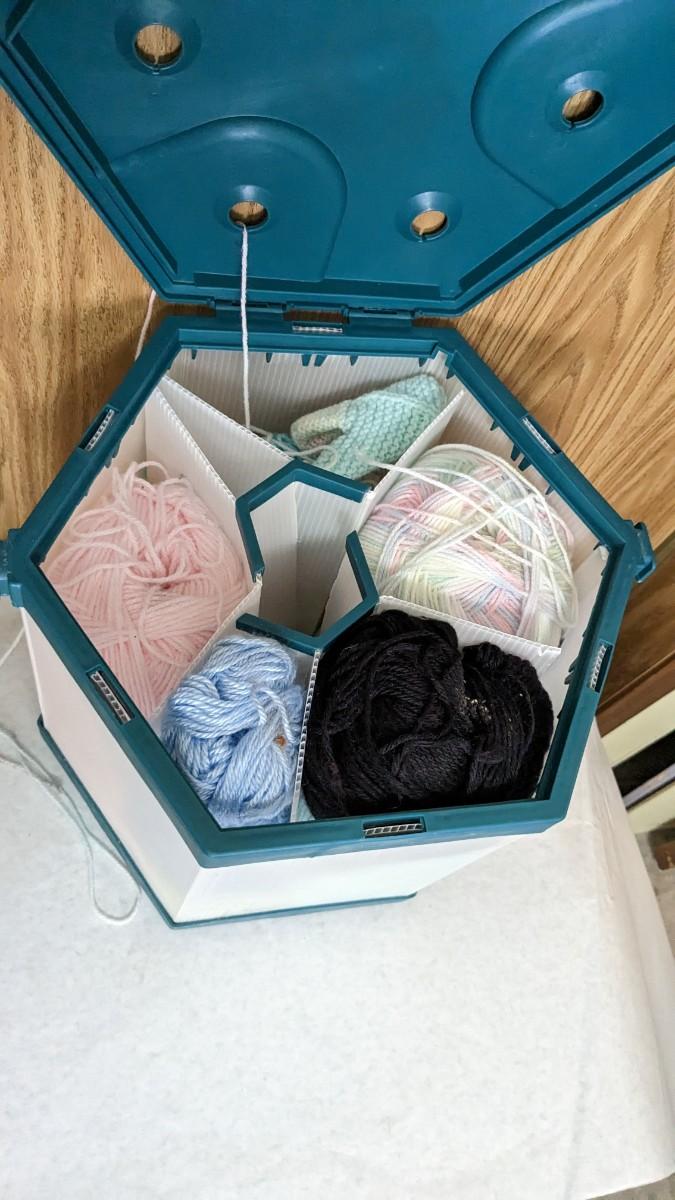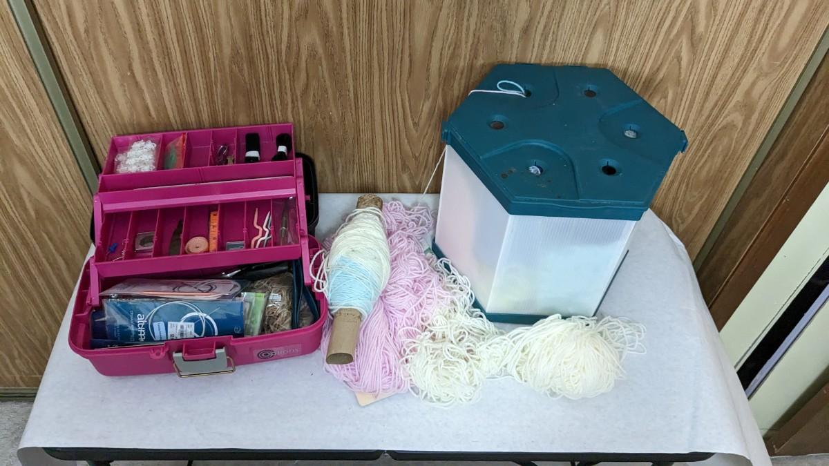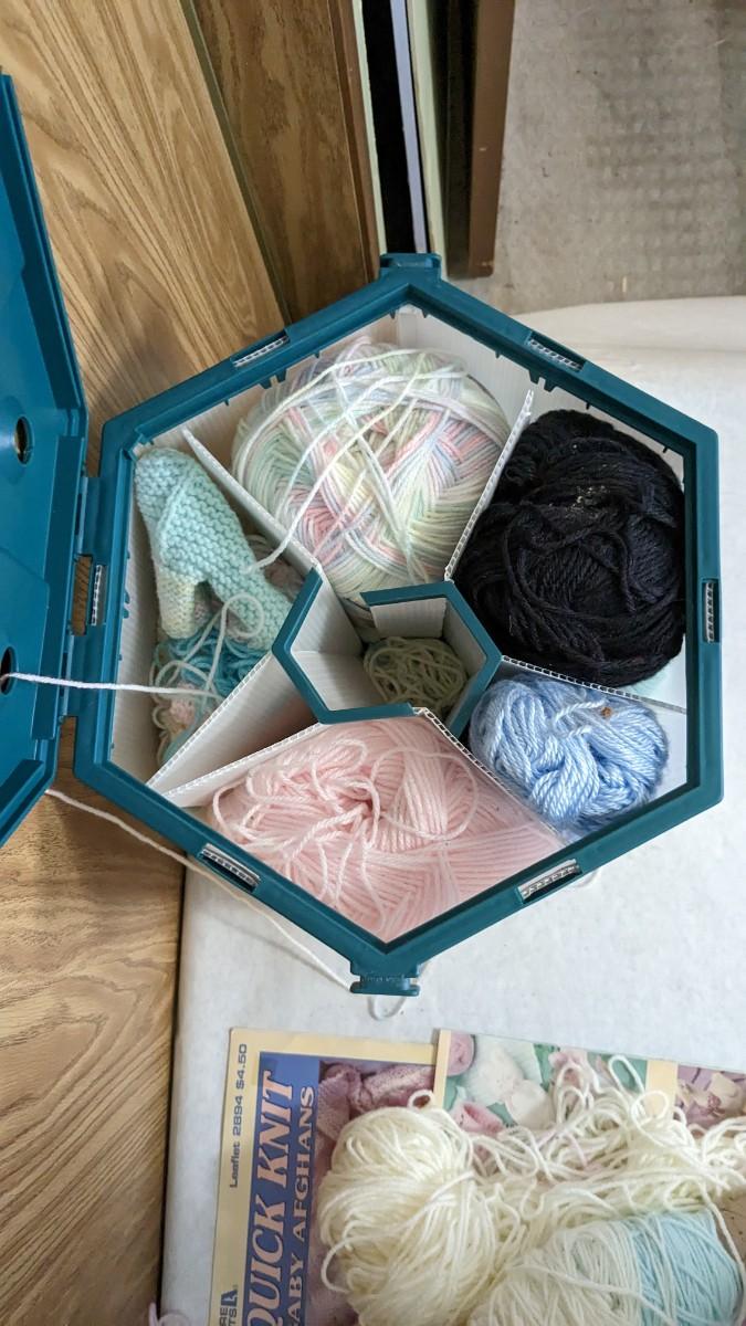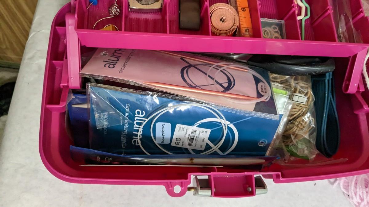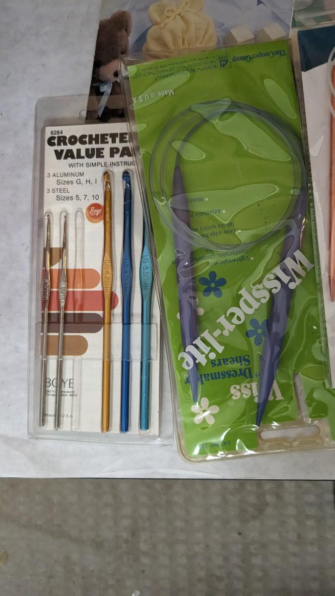 Includes small tackle box full of new in package knitting needles, pocket scissors, and sew-ins. Also includes clever 6 slot yarn container with openings in top for yarn to feed through with 4 almost full skeins. Also comes with a couple of pattern books. bdrm1