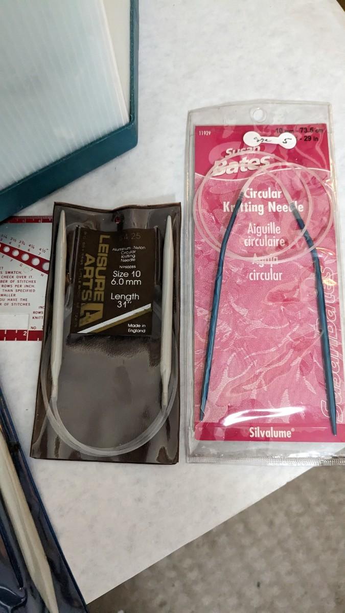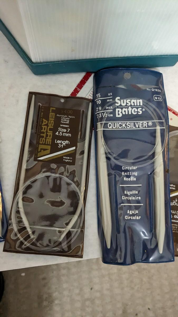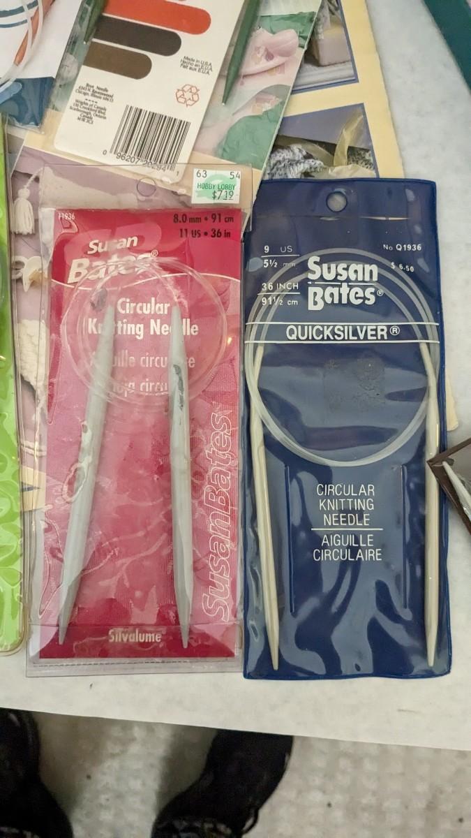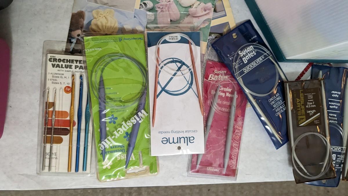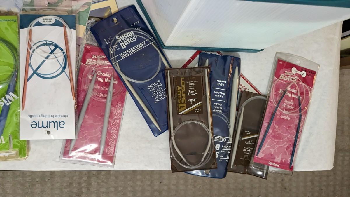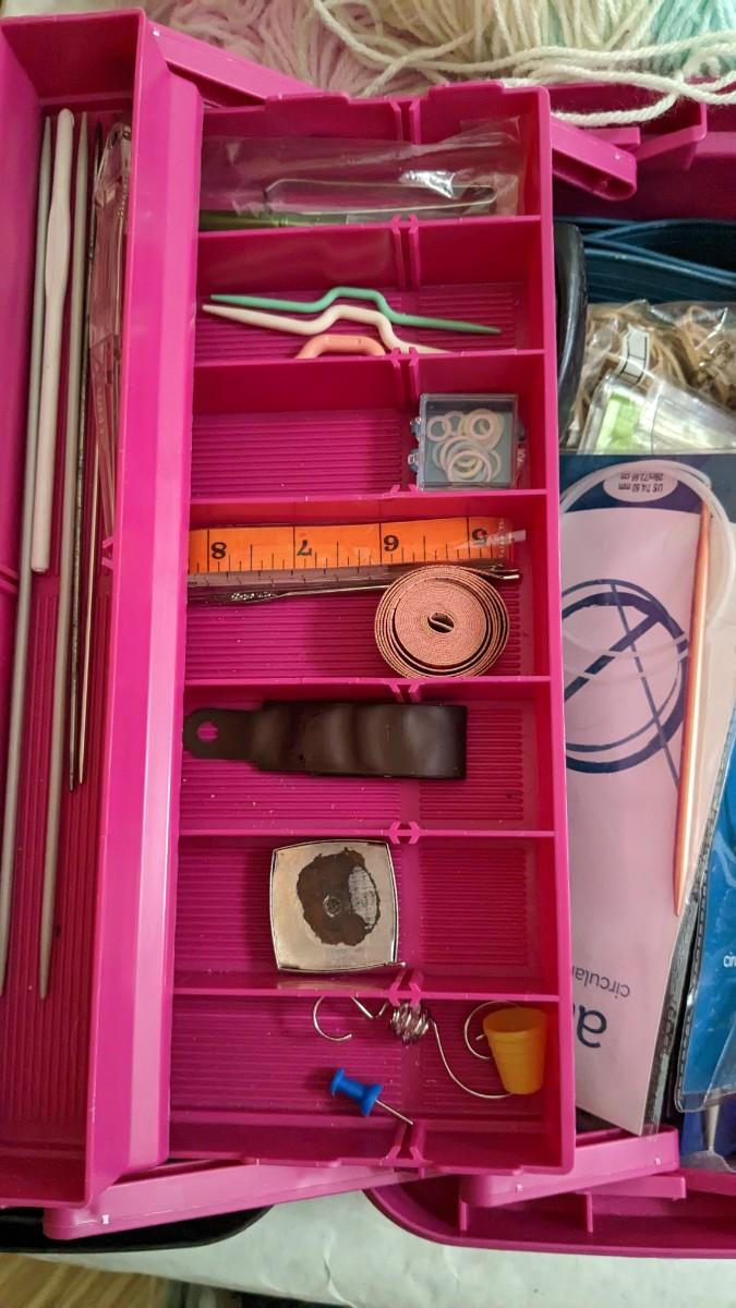 Includes small tackle box full of new in package knitting needles, pocket scissors, and sew-ins. Also includes clever 6 slot yarn container with openings in top for yarn to feed through with 4 almost full skeins. Also comes with a couple of pattern books. bdrm1