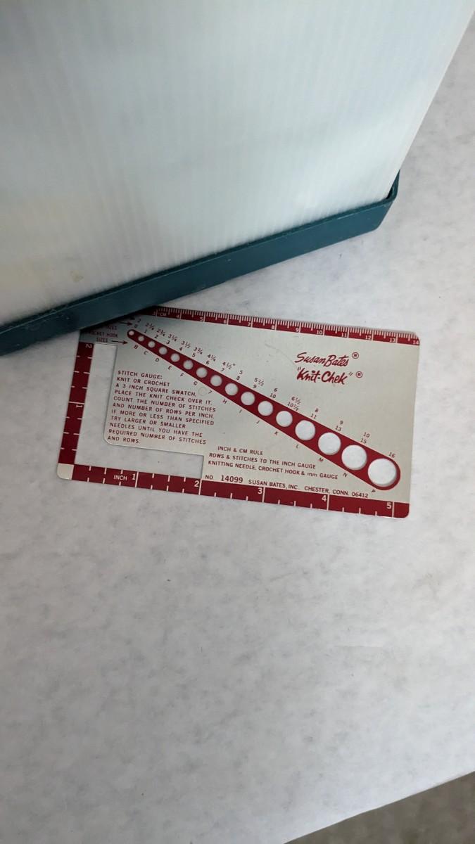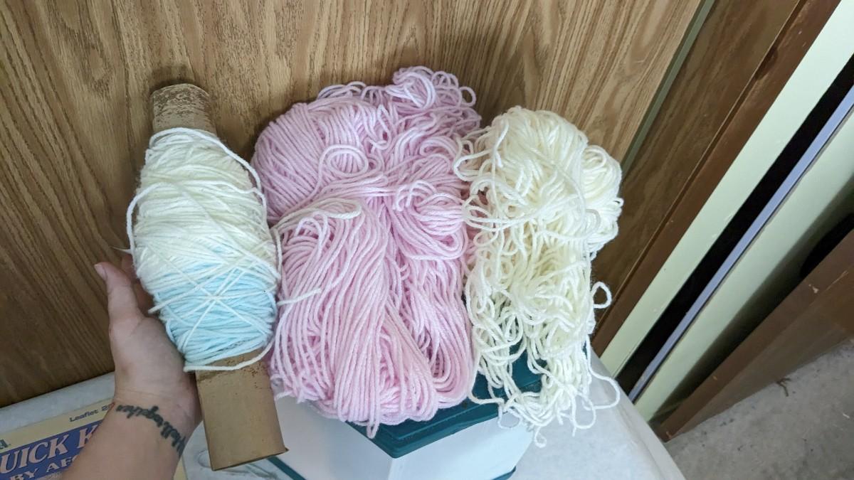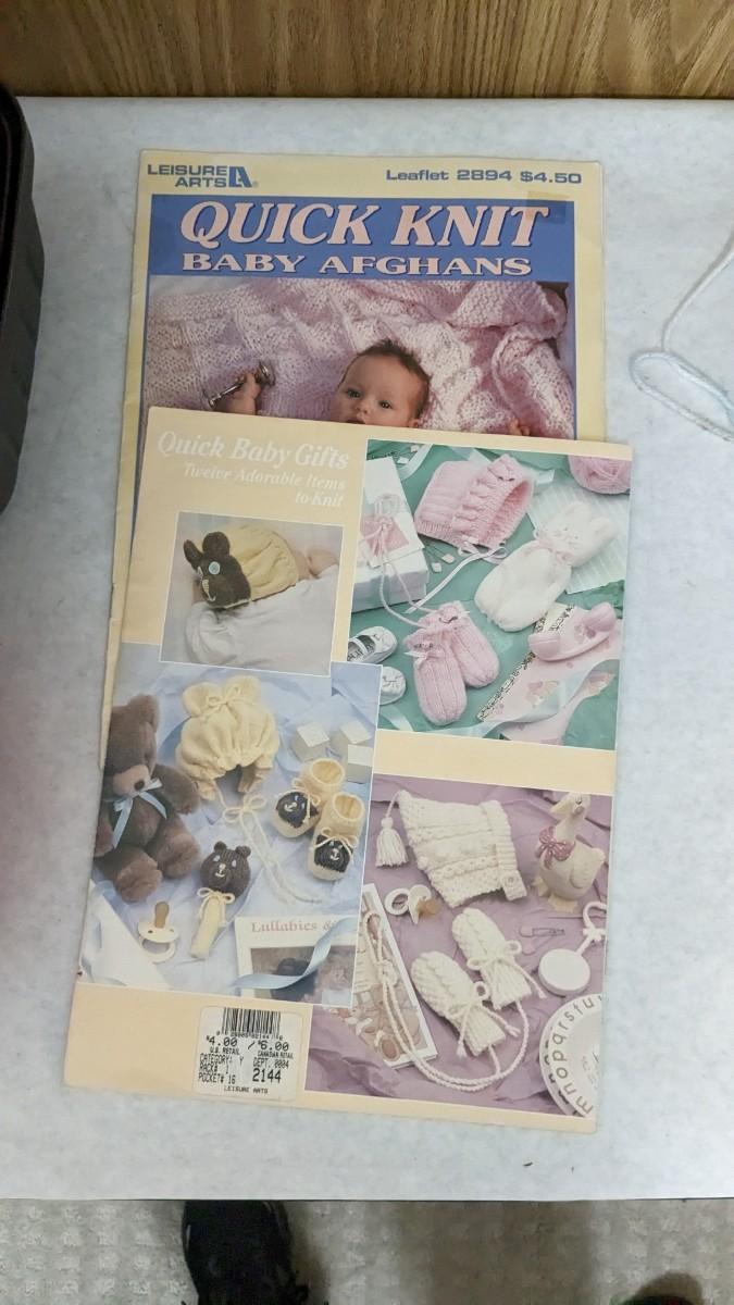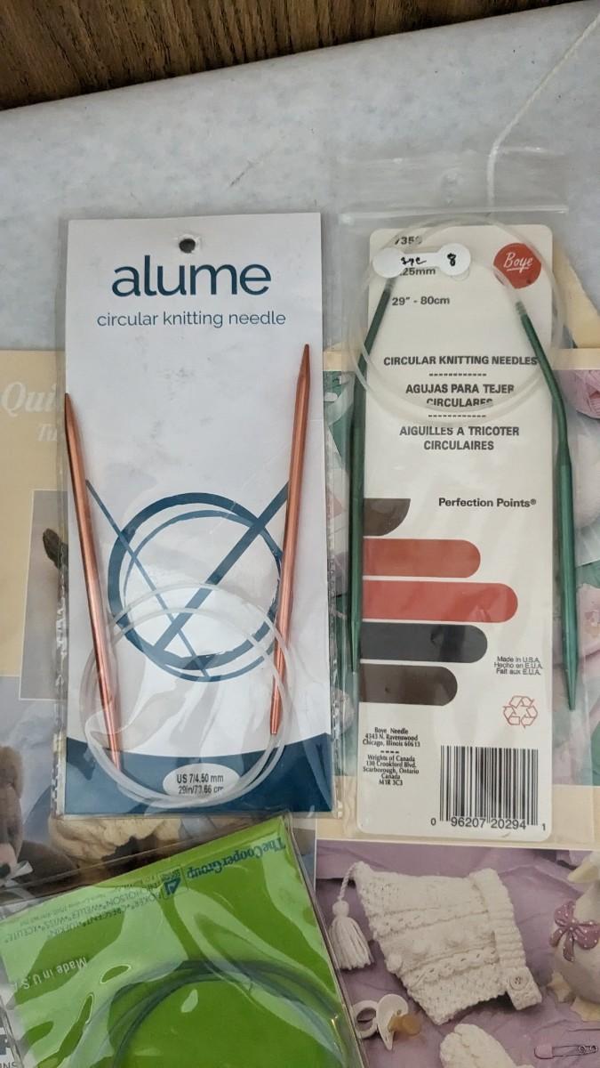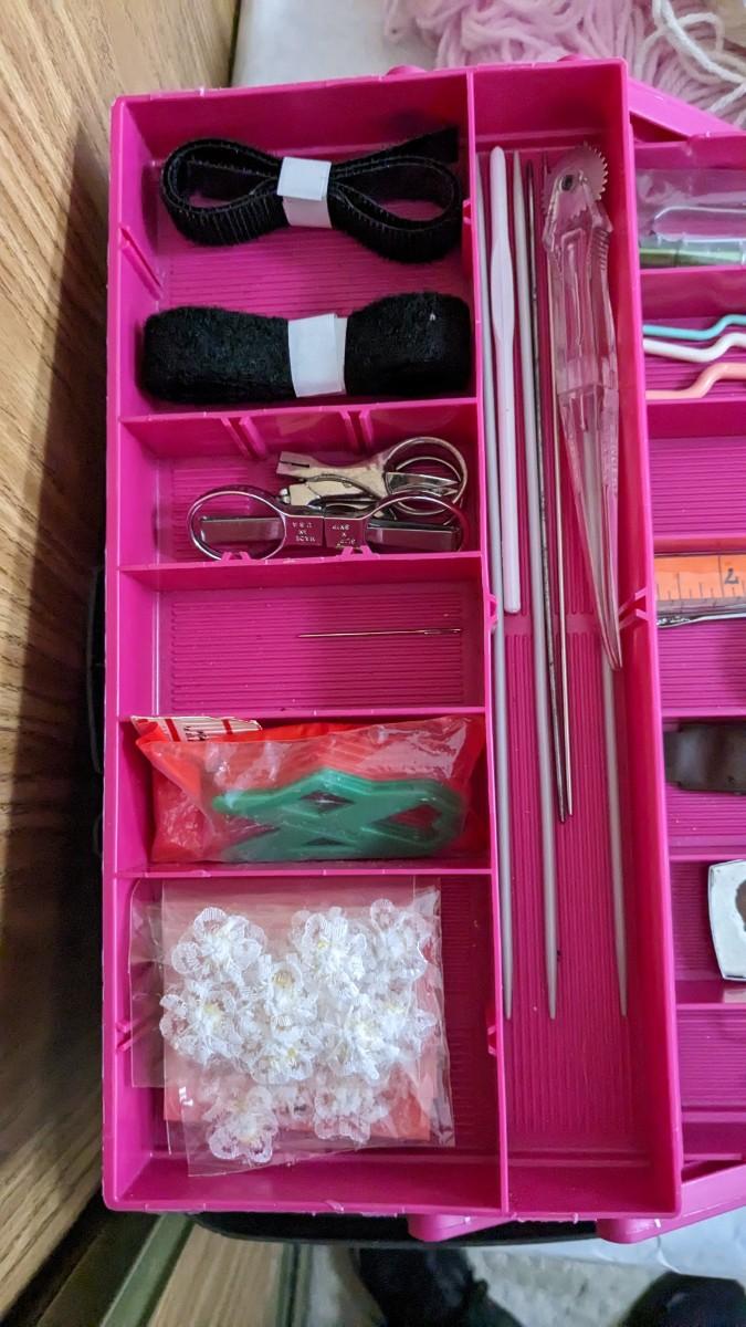 Includes small tackle box full of new in package knitting needles, pocket scissors, and sew-ins. Also includes clever 6 slot yarn container with openings in top for yarn to feed through with 4 almost full skeins. Also comes with a couple of pattern books. bdrm1
