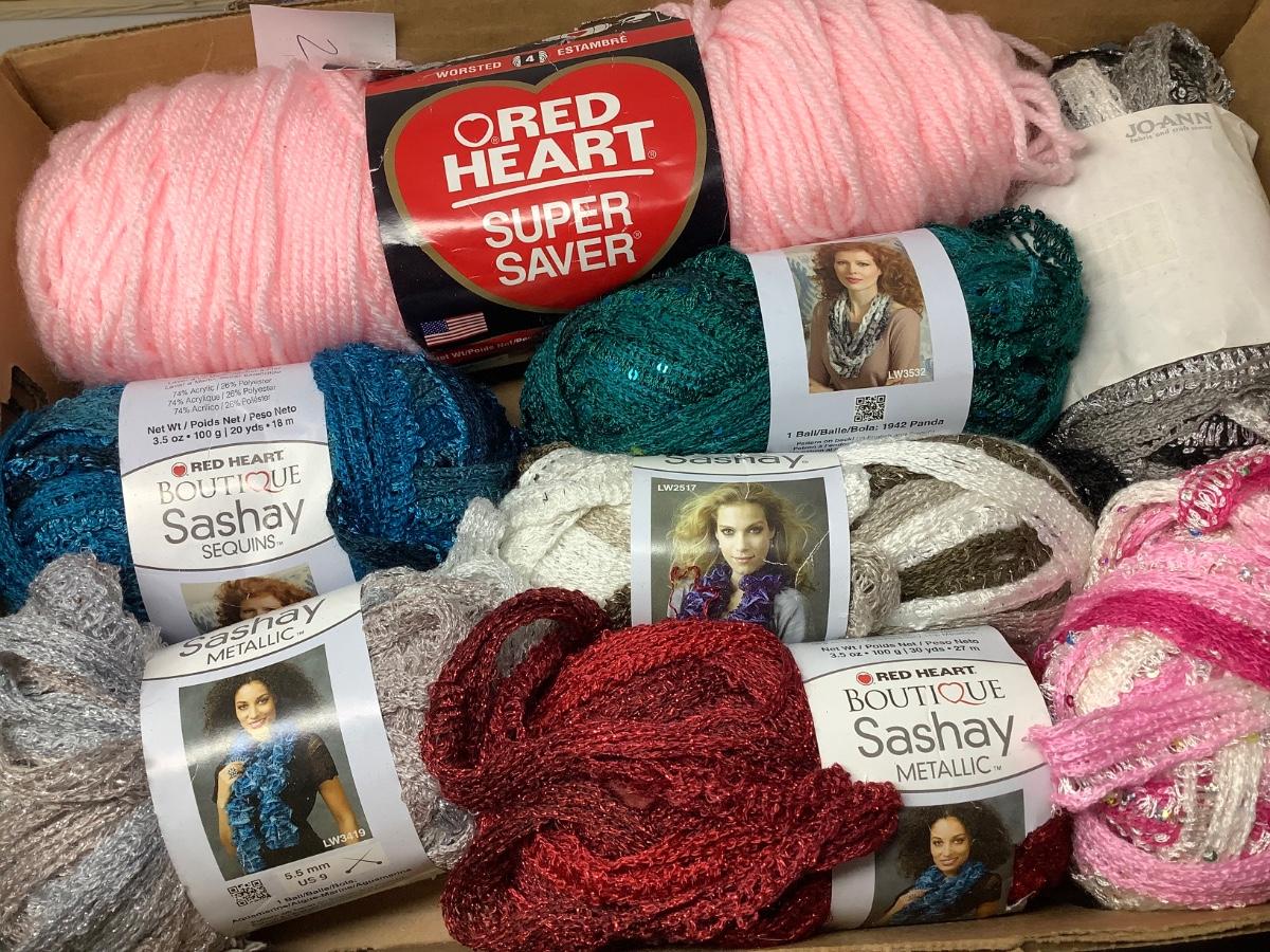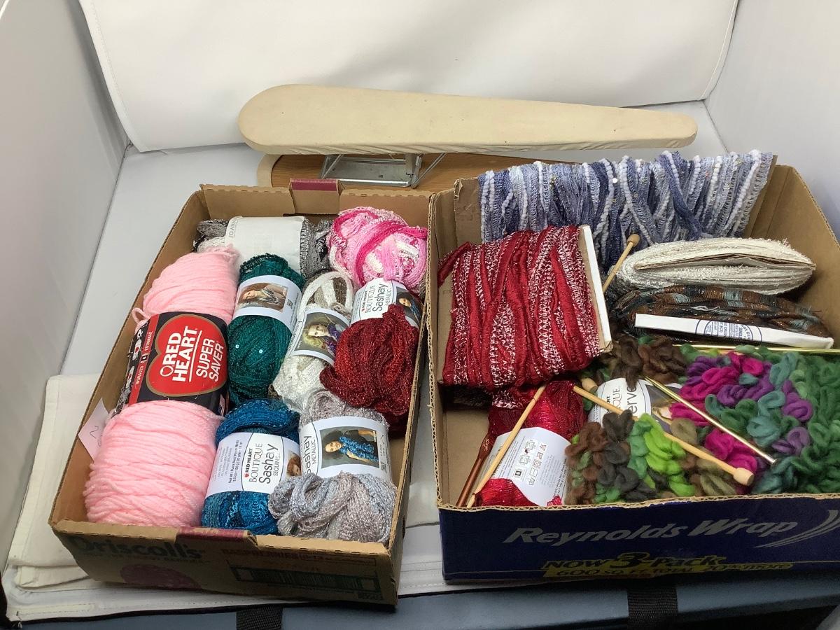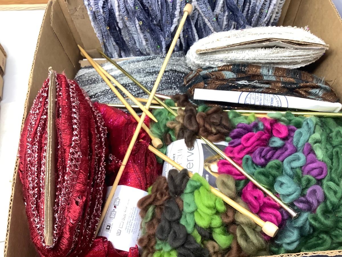 You get 16 scans of yarn and material several knitting needs and a mini ironing board.