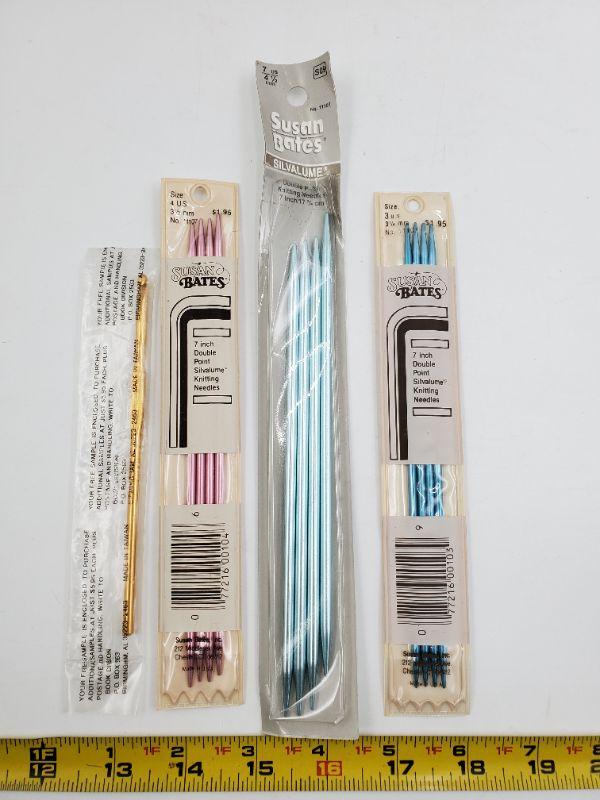 Several packages of knitting needles new in package, this lot also has a few crocheting hooks new in package.