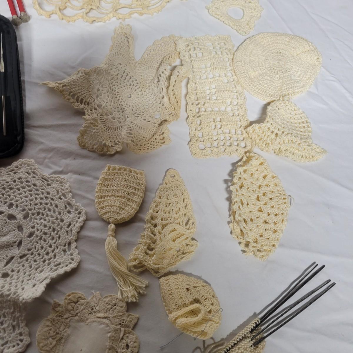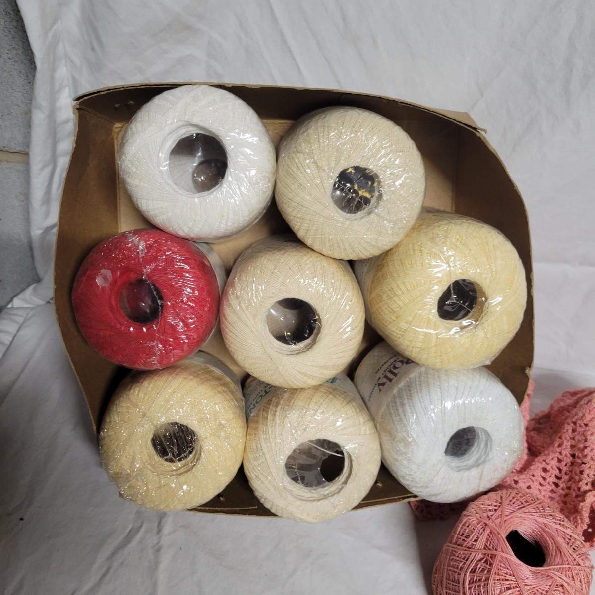 An assortment of knitting tools, yarn, doilies and crochet thread. Yarn and crochet threads include manufacturer ls Lily and Lion brand. Shipping available