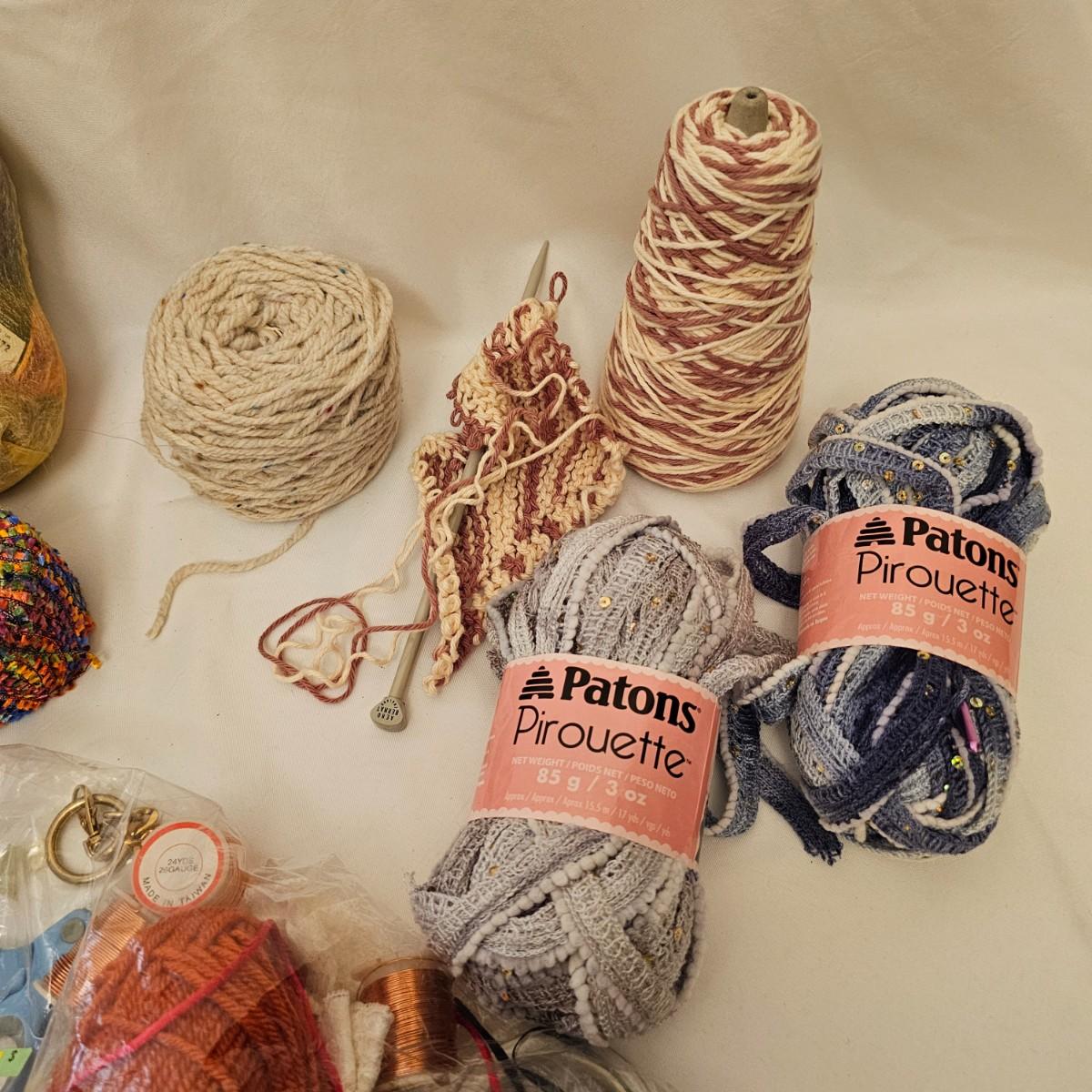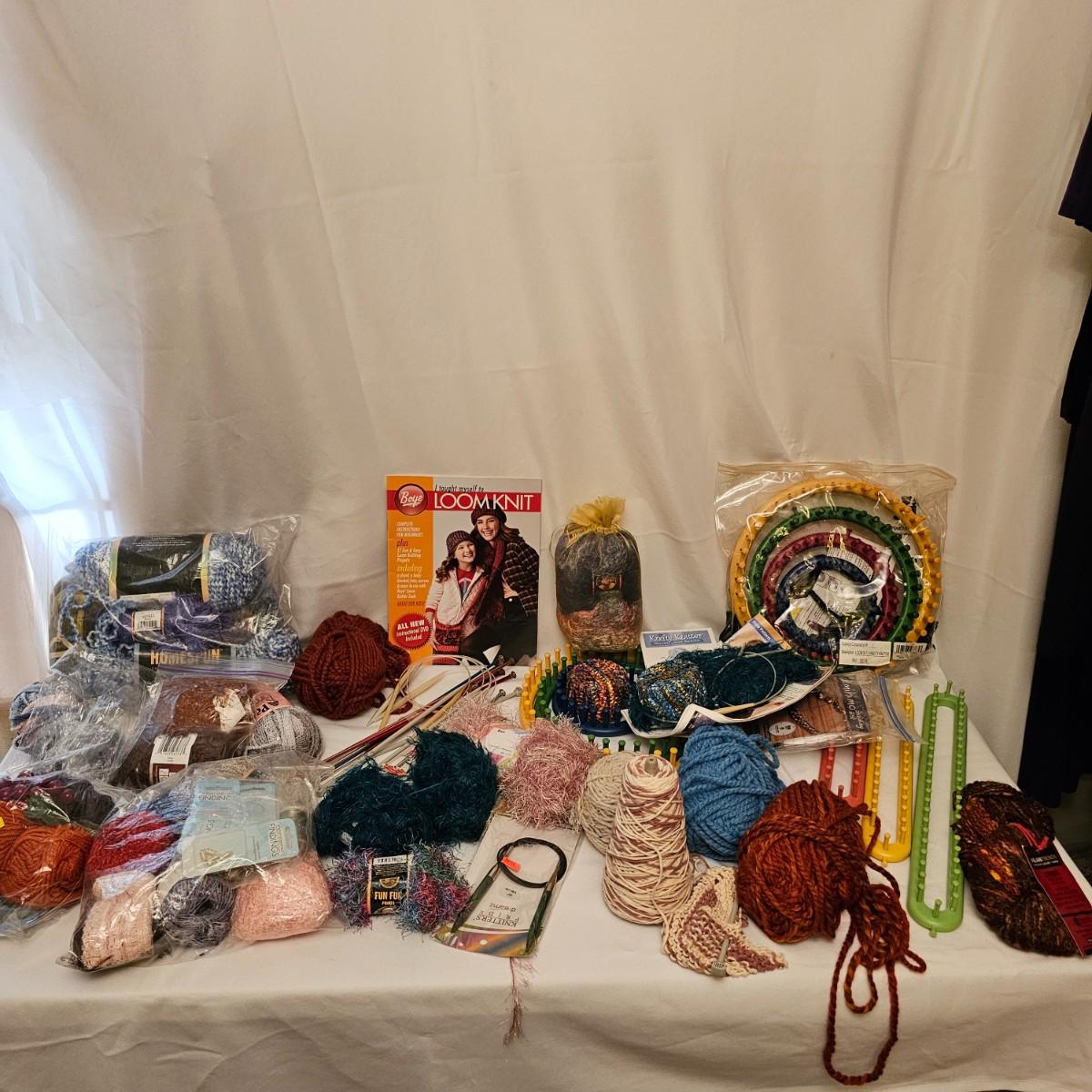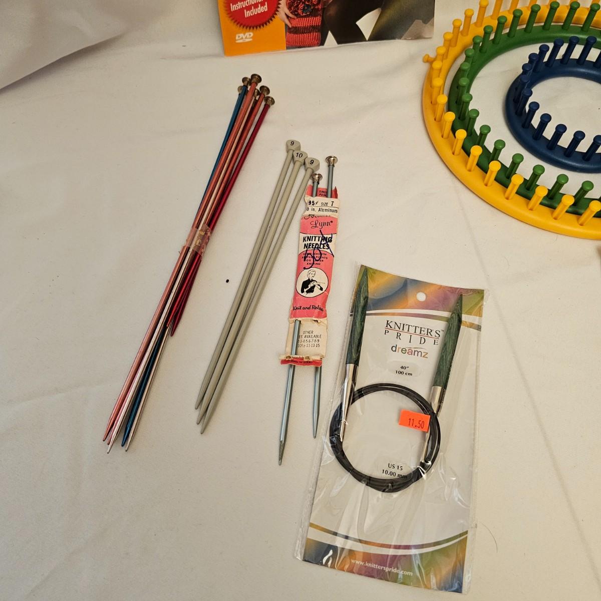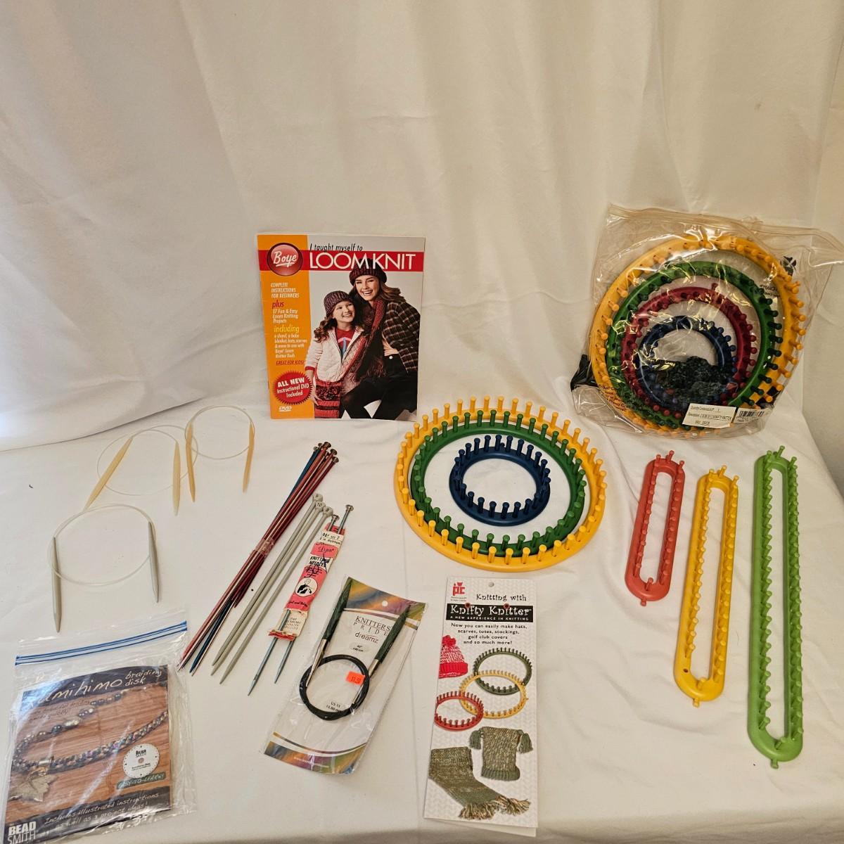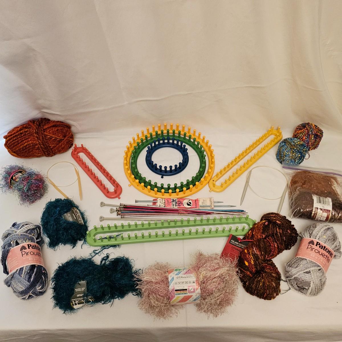 Standard yarn, fancy skeins and more with this lot. Knitting needles both singles and on loops. Two sets of Knifty Knitter looms and instructions. Round looms range from 5"D to 11"D, long looms are 9.5" to 17" and 2"H. A couple of bagged projects in works. See photos for details. Shipping available.