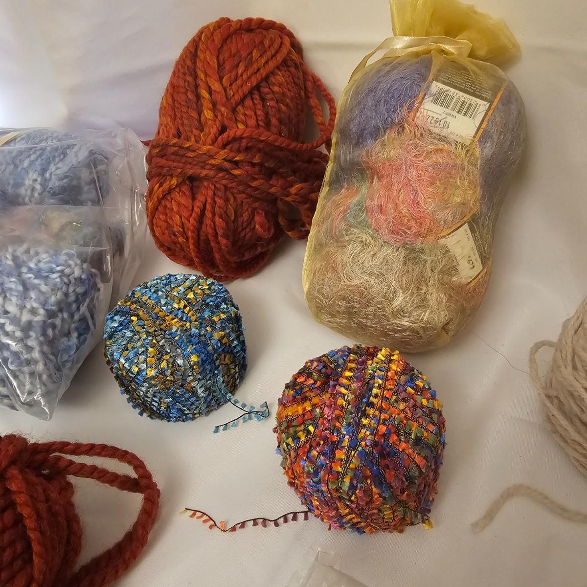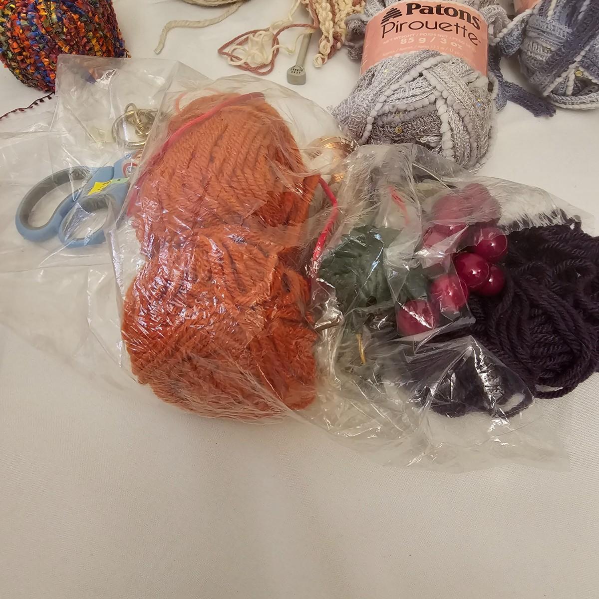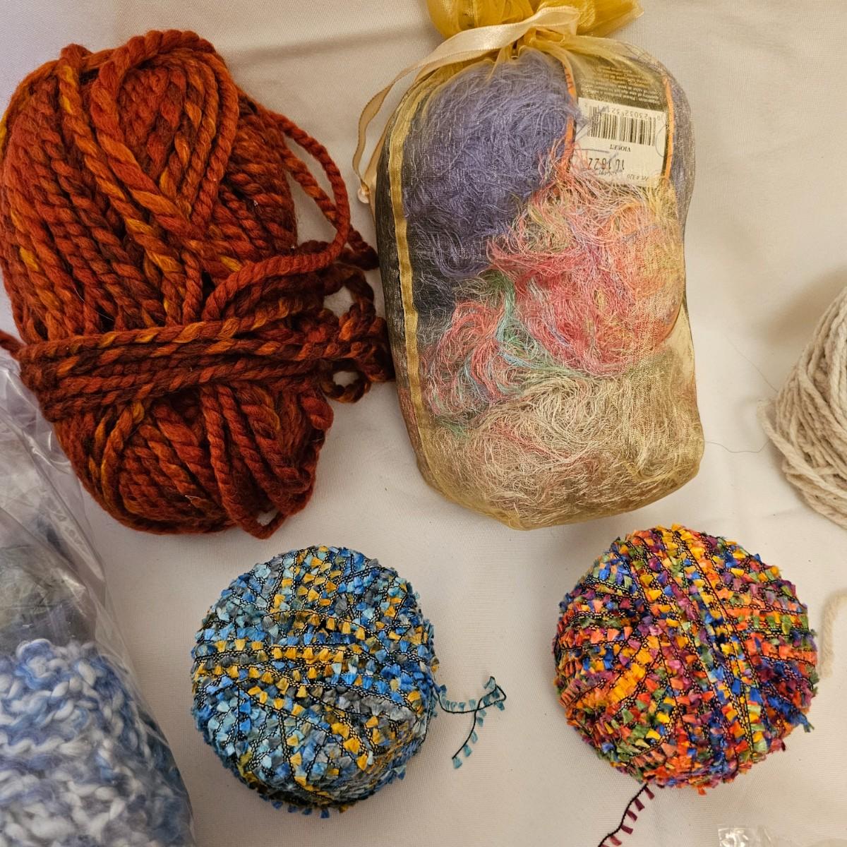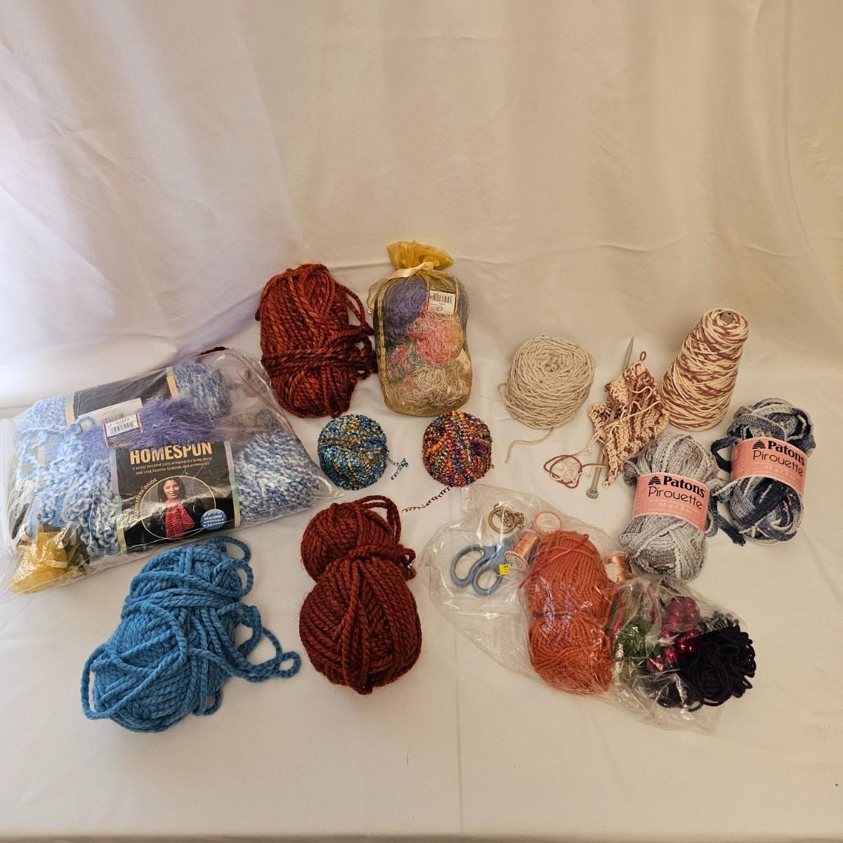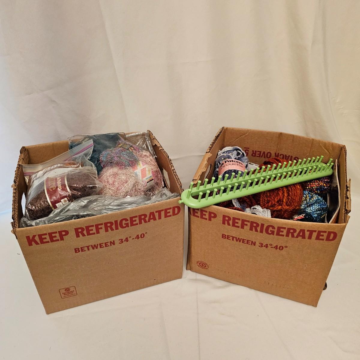 Standard yarn, fancy skeins and more with this lot. Knitting needles both singles and on loops. Two sets of Knifty Knitter looms and instructions. Round looms range from 5"D to 11"D, long looms are 9.5" to 17" and 2"H. A couple of bagged projects in works. See photos for details. Shipping available.