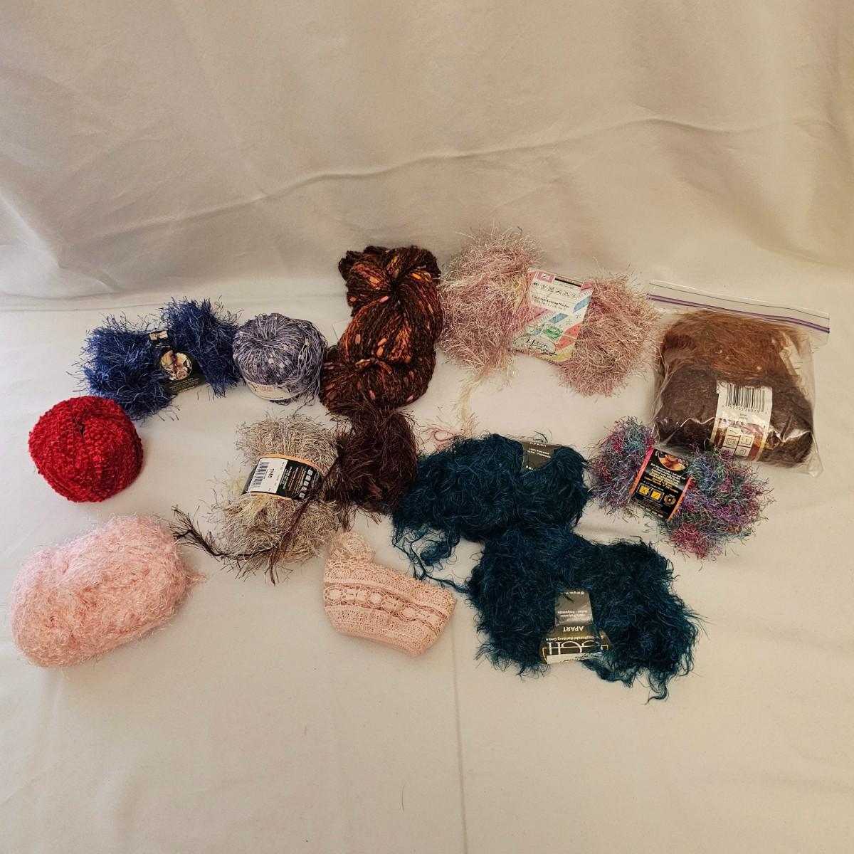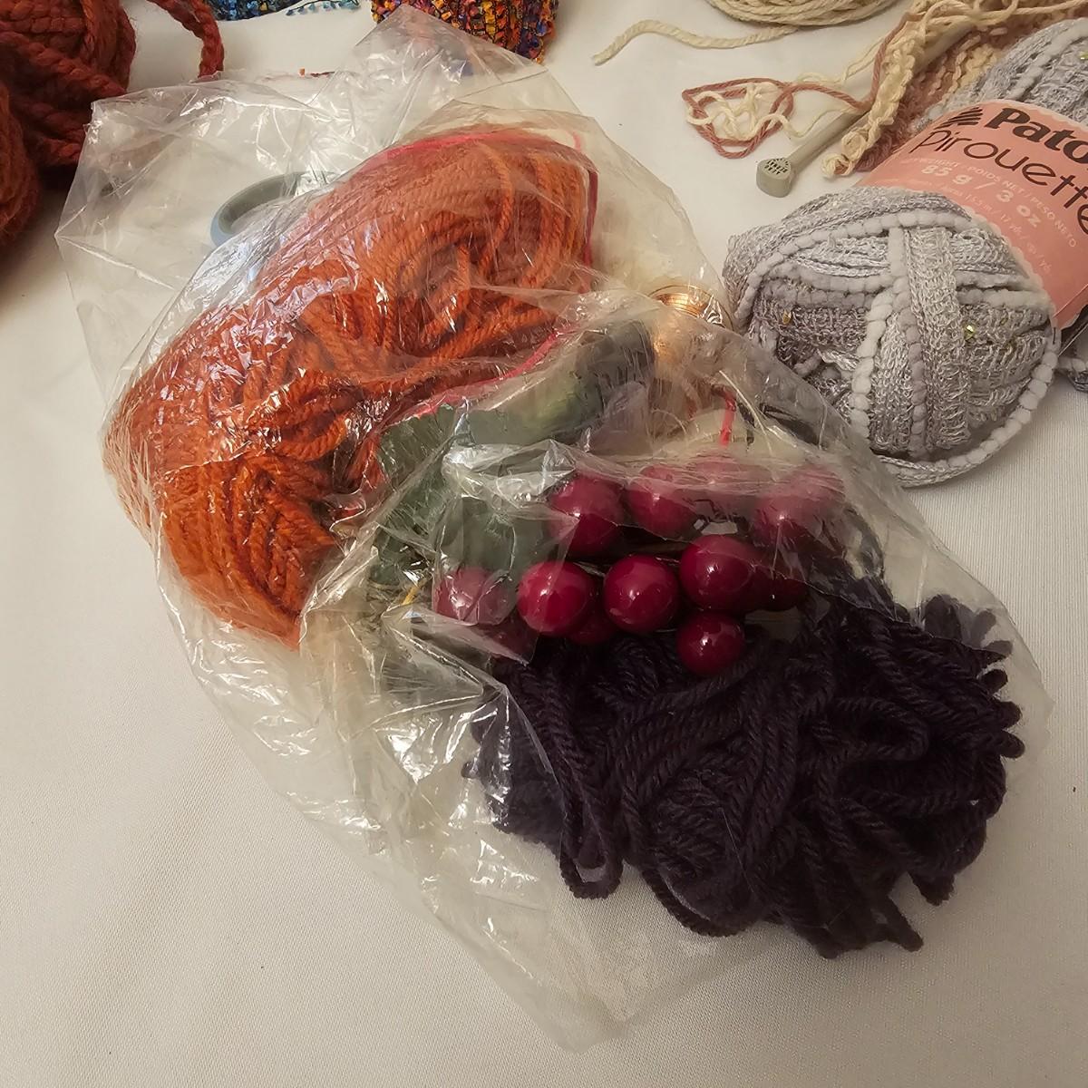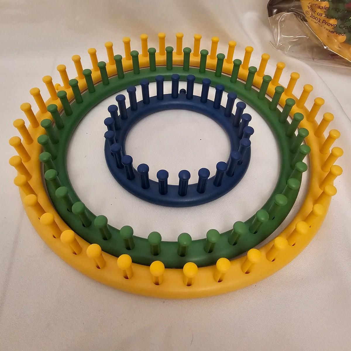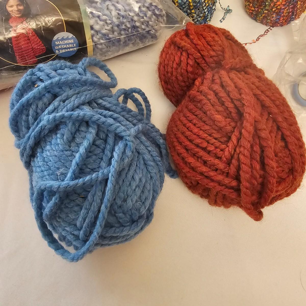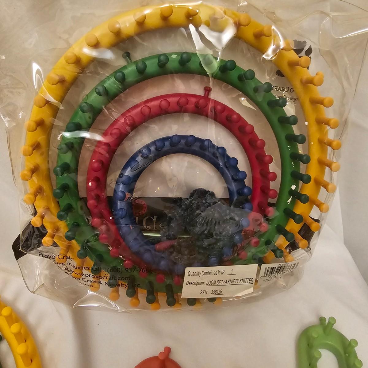 Standard yarn, fancy skeins and more with this lot. Knitting needles both singles and on loops. Two sets of Knifty Knitter looms and instructions. Round looms range from 5"D to 11"D, long looms are 9.5" to 17" and 2"H. A couple of bagged projects in works. See photos for details. Shipping available.