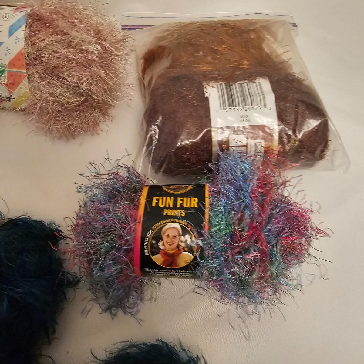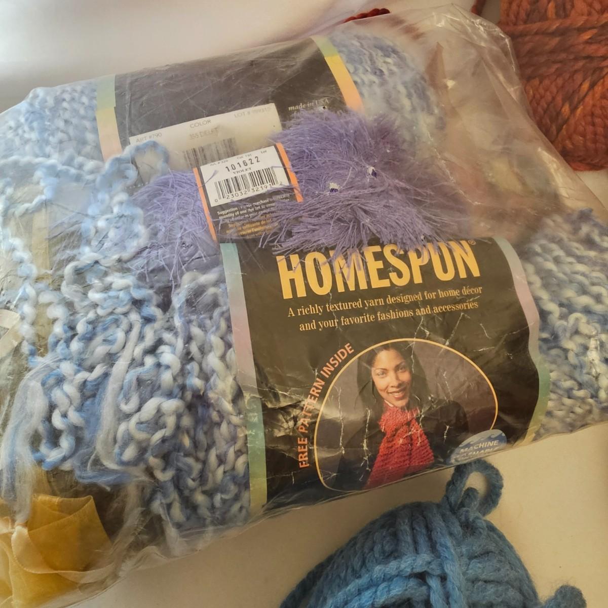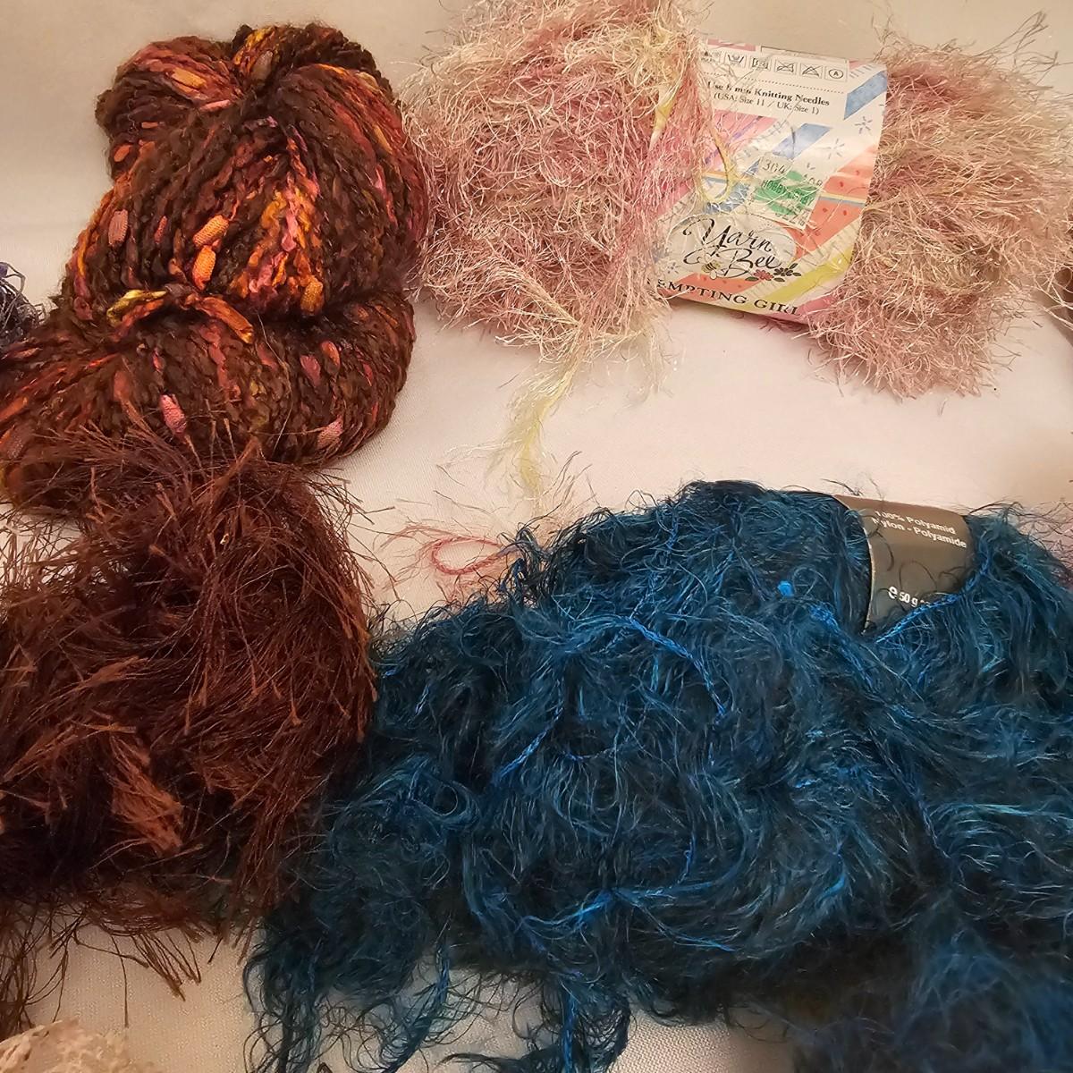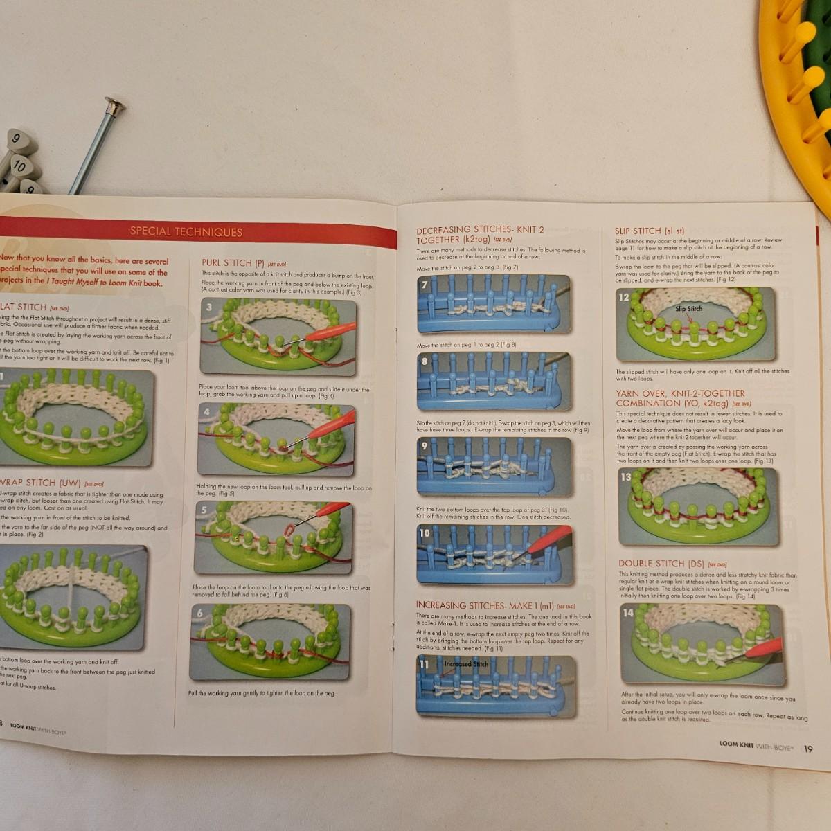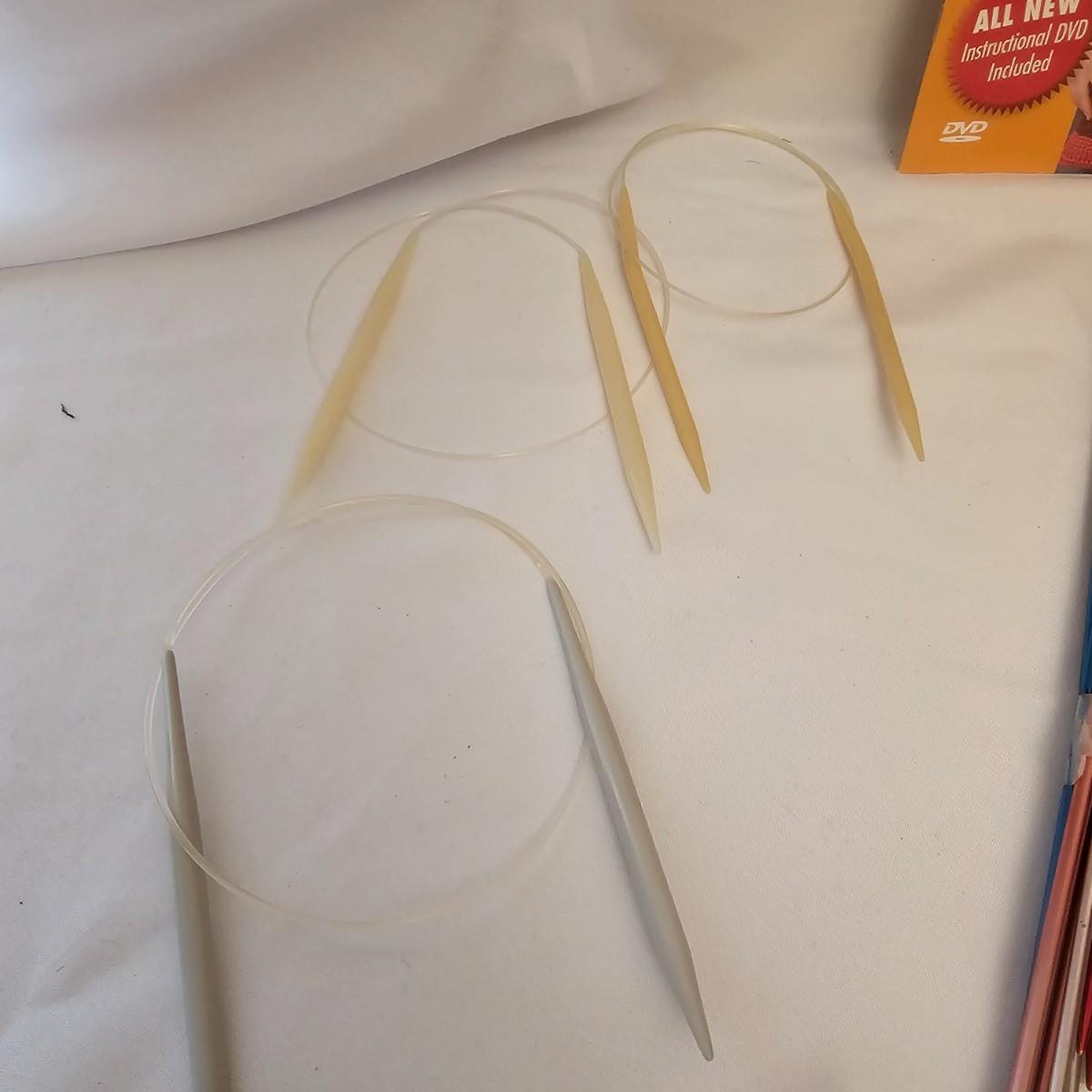 Standard yarn, fancy skeins and more with this lot. Knitting needles both singles and on loops. Two sets of Knifty Knitter looms and instructions. Round looms range from 5"D to 11"D, long looms are 9.5" to 17" and 2"H. A couple of bagged projects in works. See photos for details. Shipping available.