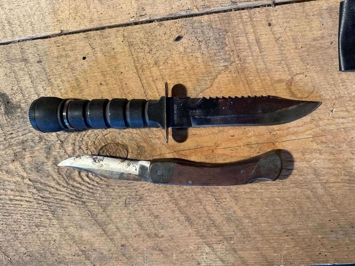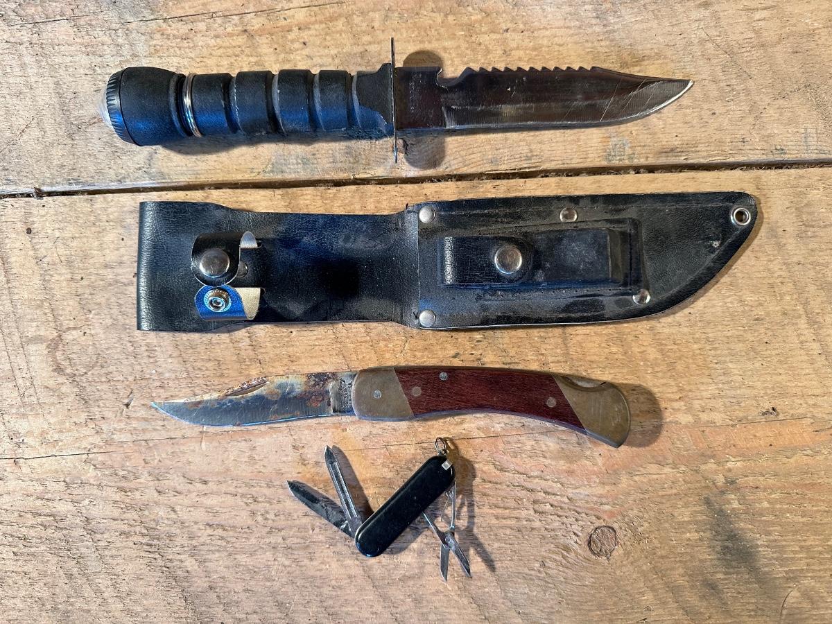 ROSTFREI Survival knife with sheath, the compass does not work, Uncle Henry SCHRADE+ LB7 folding knife and a multi tool knife.