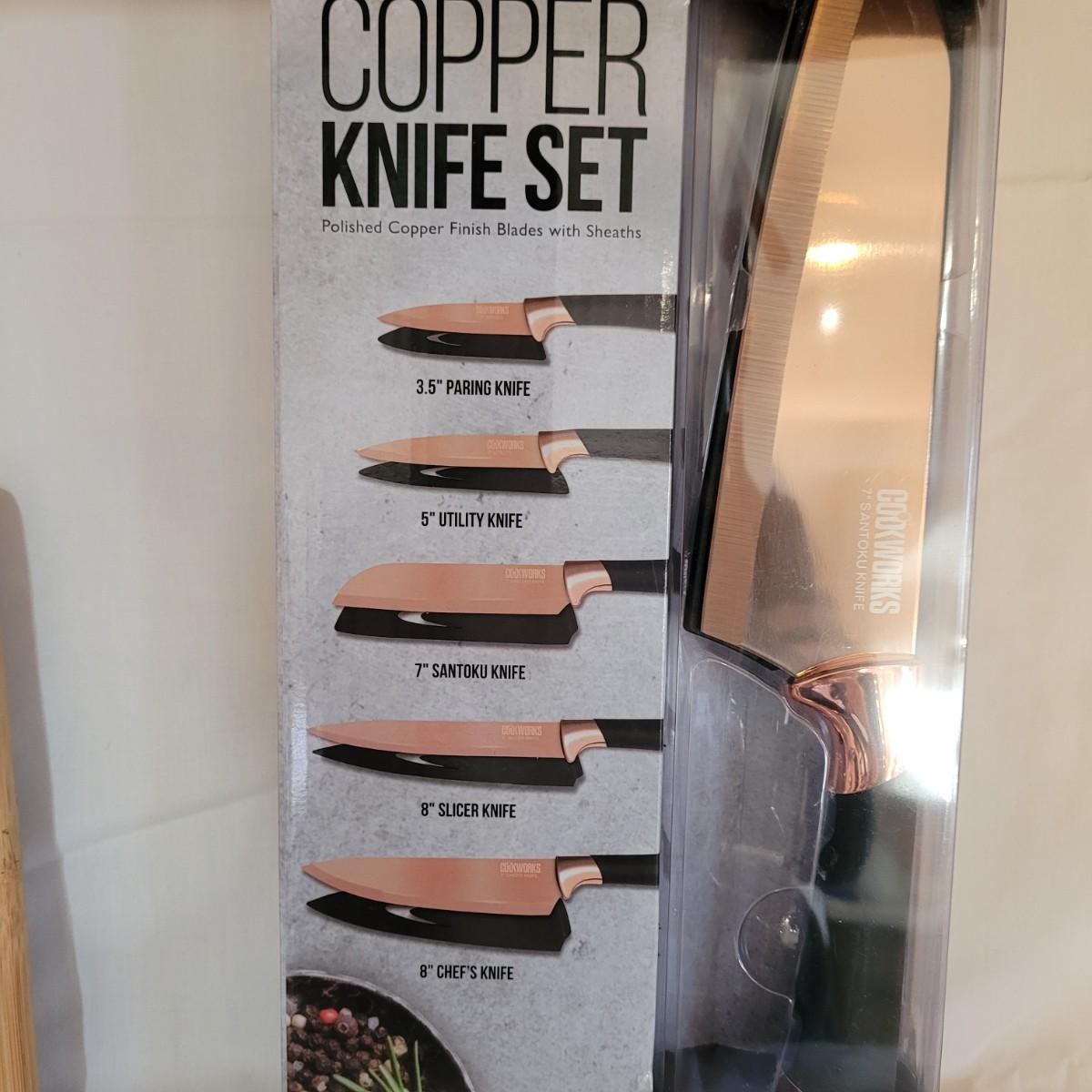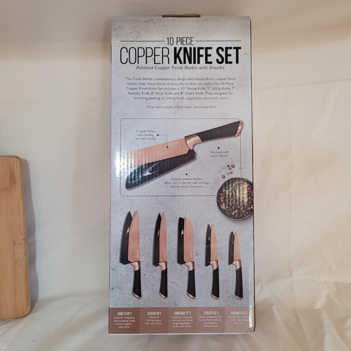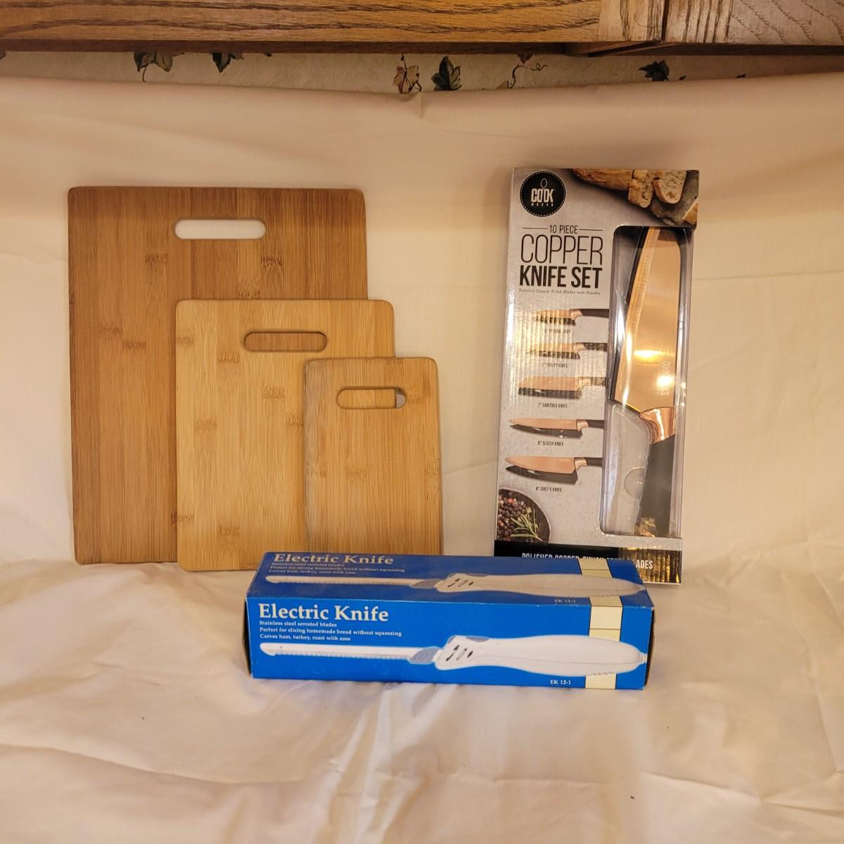 Ten piece copper knife set appears to not have been opened, as well as electric carving knife. Three bamboo cutting boards round off this useful lot. Largest board measures approximately 11" x 14".