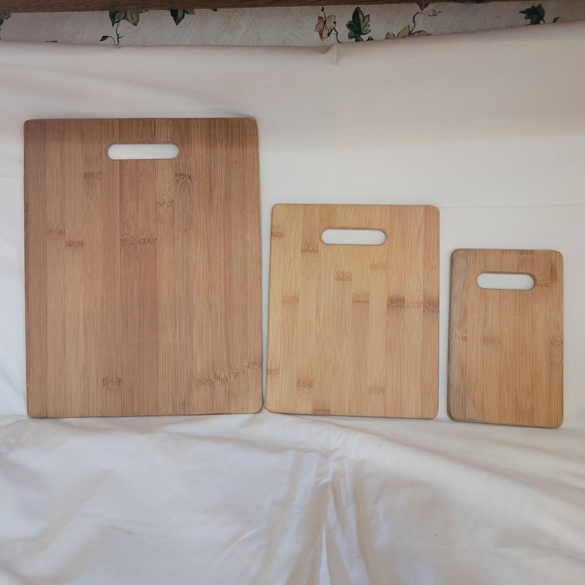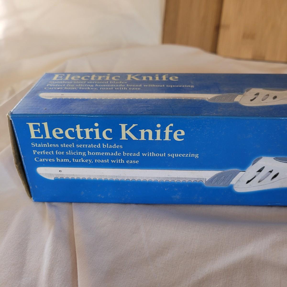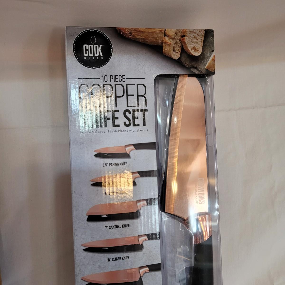 Ten piece copper knife set appears to not have been opened, as well as electric carving knife. Three bamboo cutting boards round off this useful lot. Largest board measures approximately 11" x 14".