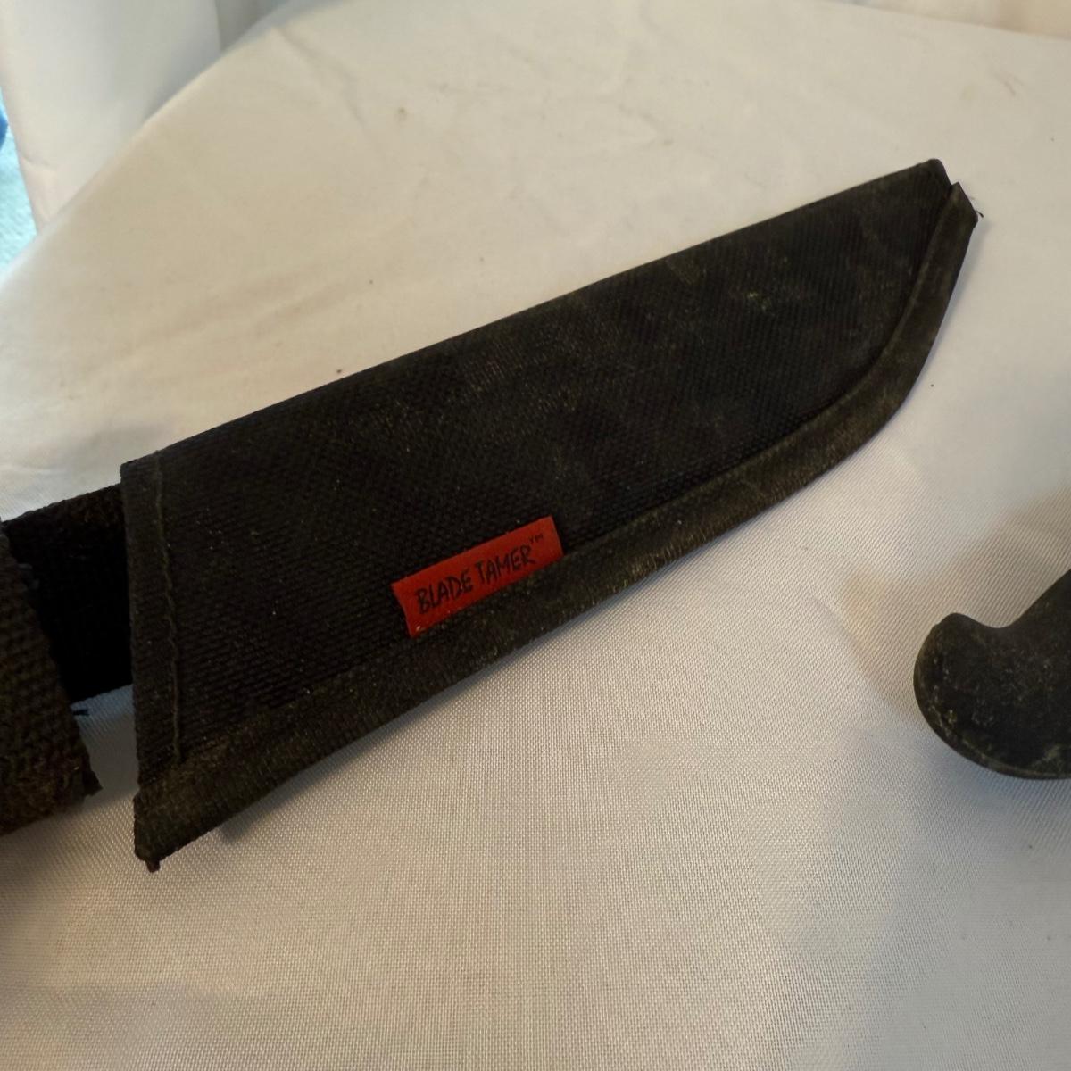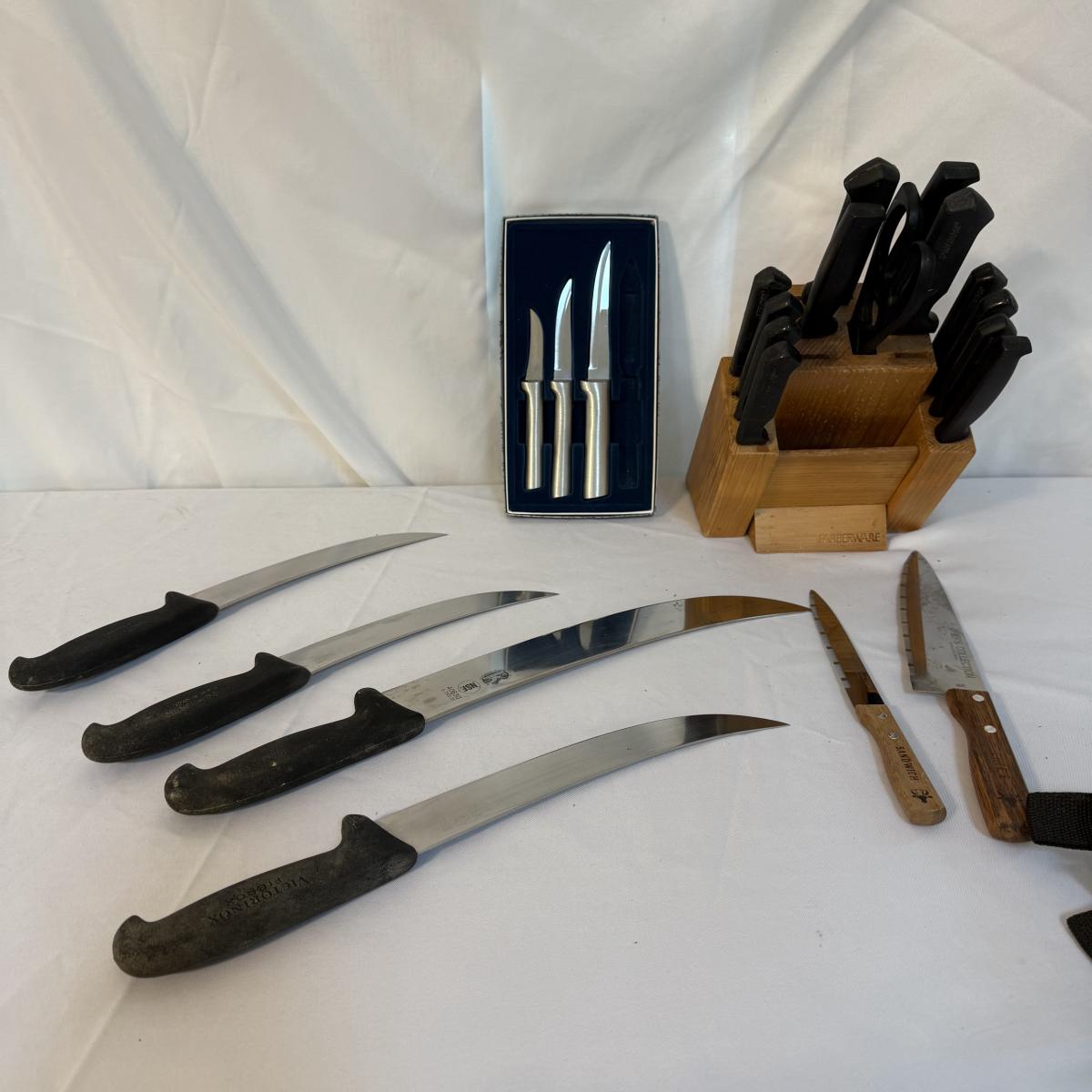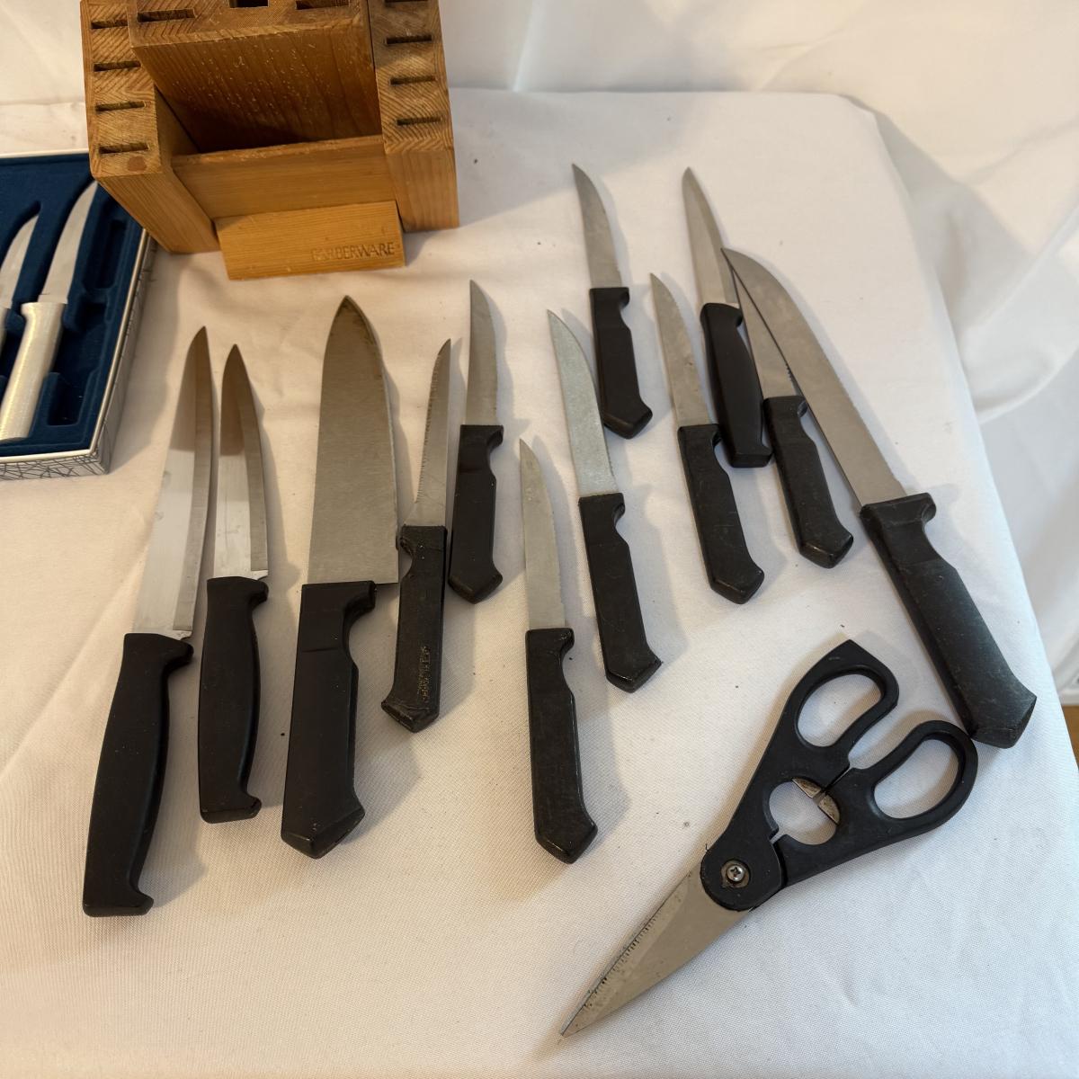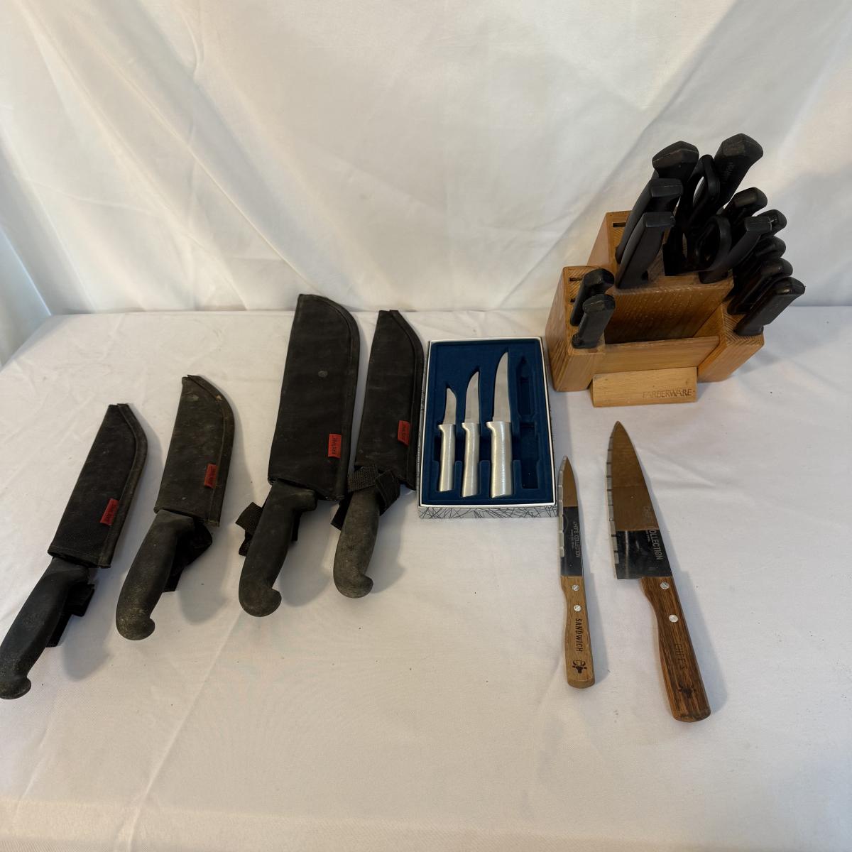 This lot contains over 20 knives. Includes a knife block that measures 7”x 5” x 9”H and comes with 12 knives and some kitchen scissors. Also included are two ‘Chef’s Collection’ knives and three ‘Rada’ knives. Lastly there are four ‘Forschner’ knives with blade covers. The largest measures 17” from the tip of the blade to the handle and the smallest measures 13.5”. These knives and the blade covers could use a cleaning. Shipping available.