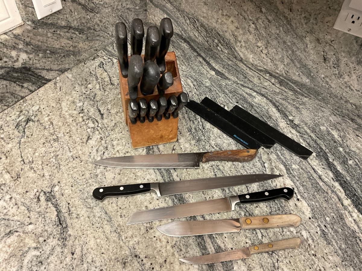 Mixed Lot of Kitchen Knives Cutlery with Wood Block Countertop Holder. In used condition.