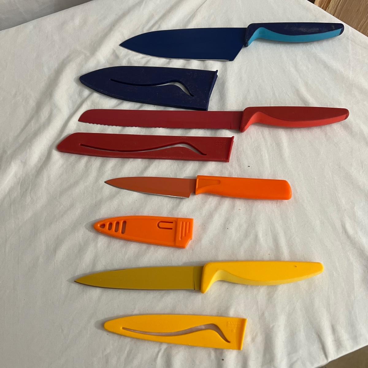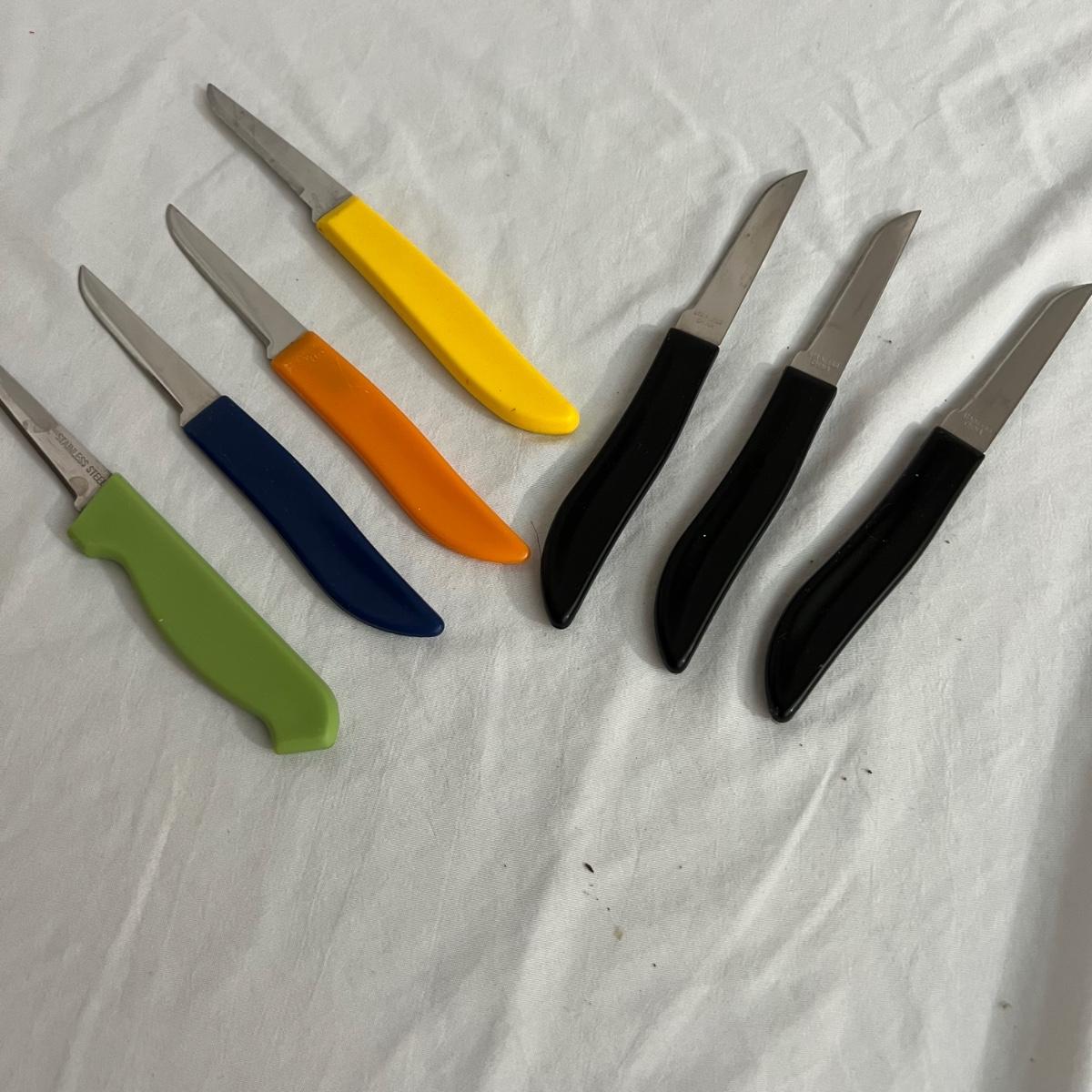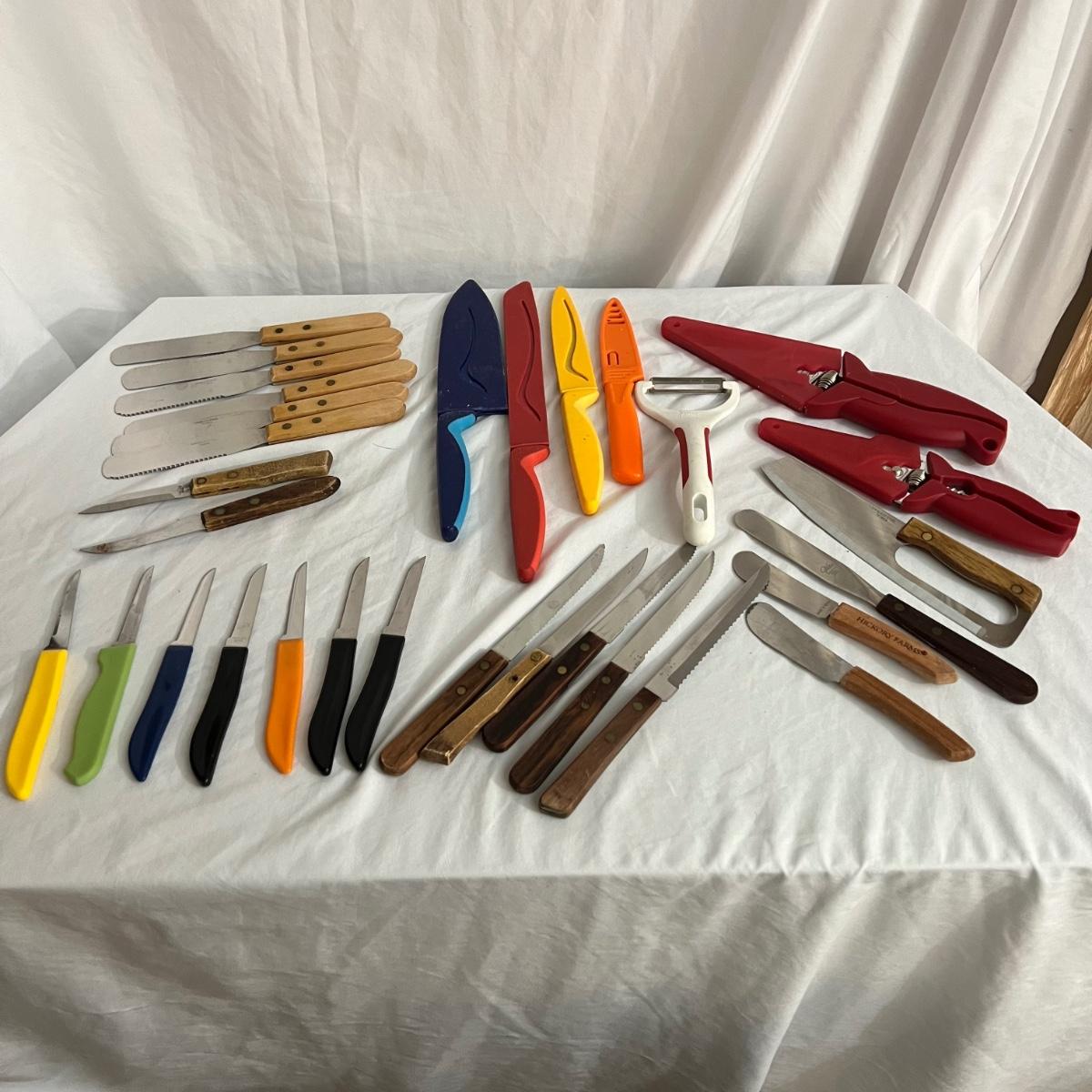 A large assortment of kitchen knives, steak knives, butter, knives and small utility knives. The smallest utility knives measure 6” long. The six matching butter knives measure 8” long. Five steak knives measure approximately 8” long are all are stainless steel. The covered red ceramic bread knife measures 12 inches long and the small covered orange utility knife measures 7.75” long. Several knives have matching storage covers. Shipping available
