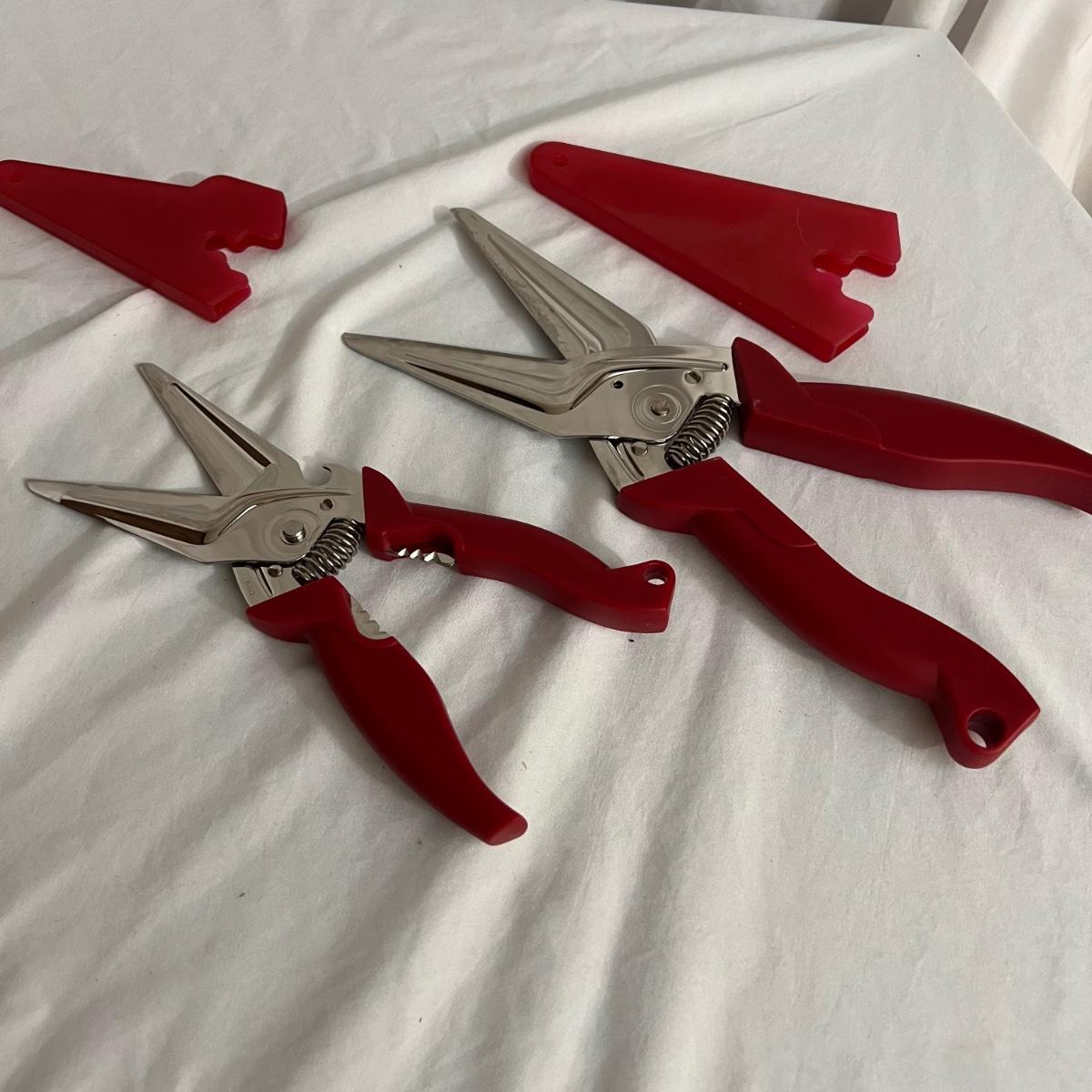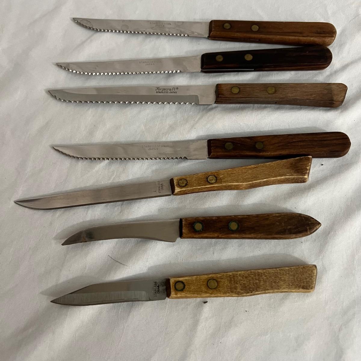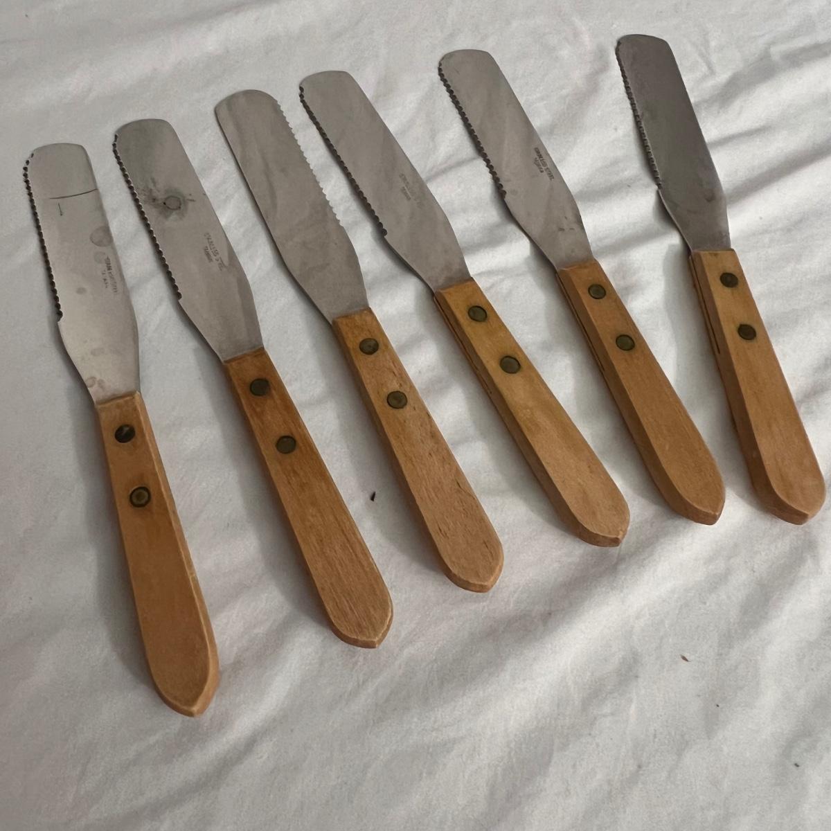 A large assortment of kitchen knives, steak knives, butter, knives and small utility knives. The smallest utility knives measure 6” long. The six matching butter knives measure 8” long. Five steak knives measure approximately 8” long are all are stainless steel. The covered red ceramic bread knife measures 12 inches long and the small covered orange utility knife measures 7.75” long. Several knives have matching storage covers. Shipping available