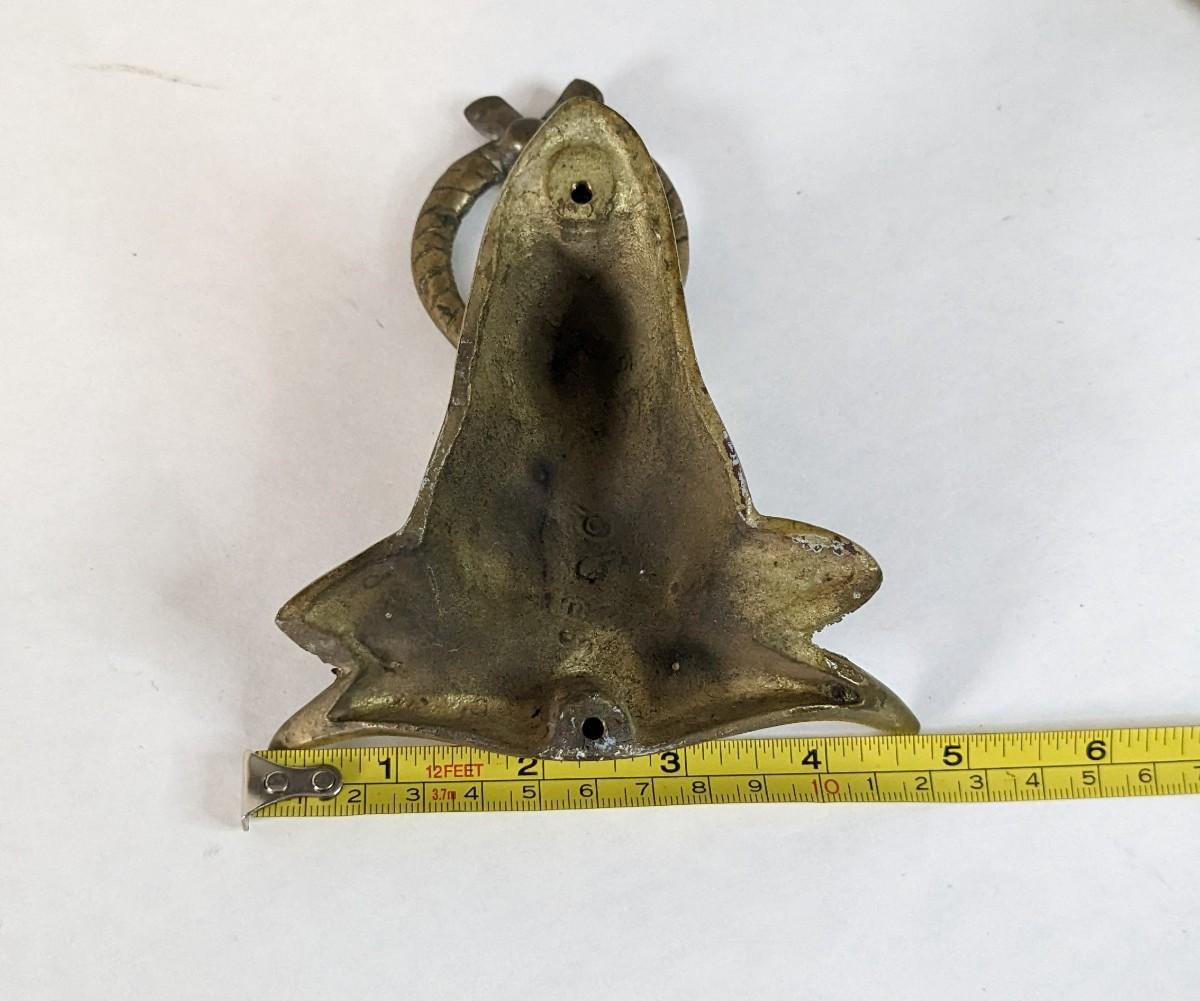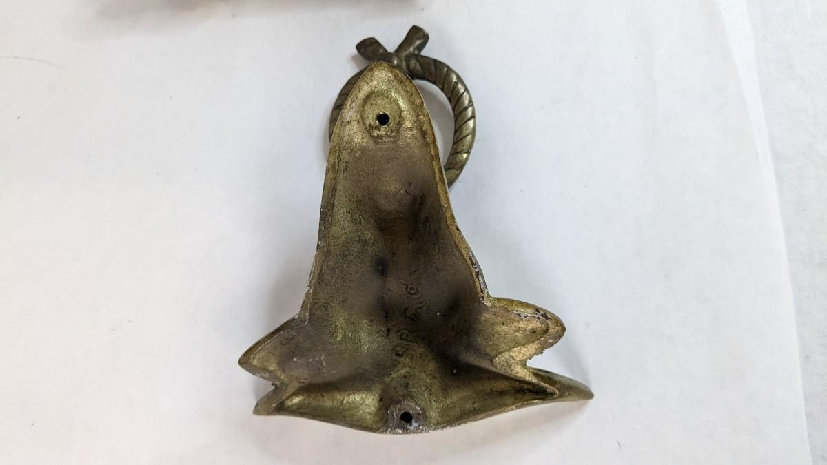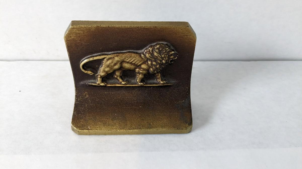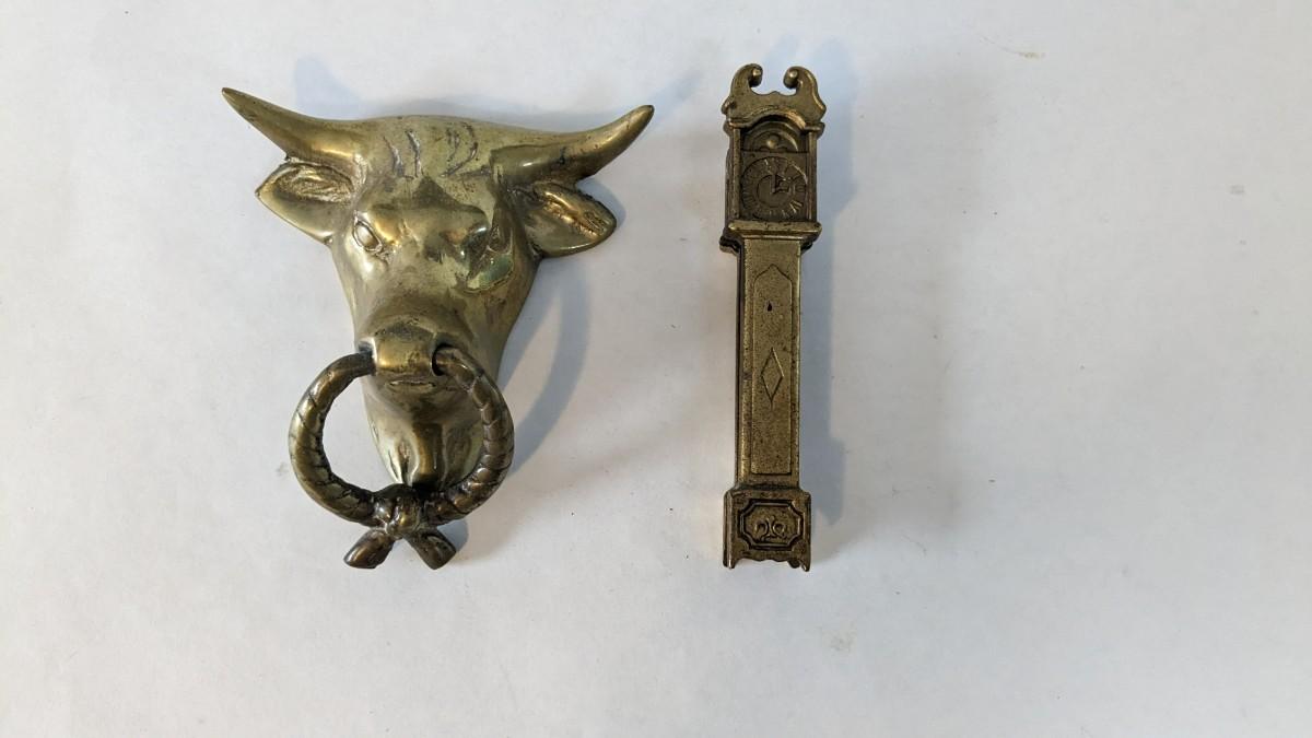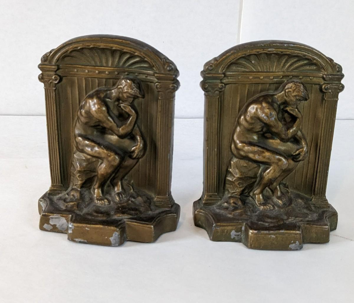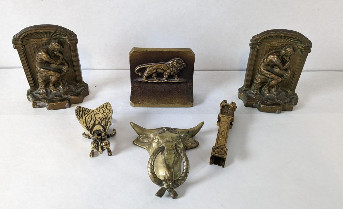 Includes two solid brass door knockers, brass fly ashtray, hollow cast "The Thinker" bookends by Geo Ck Co. NYC please note one of them has a crack and the other has bottom push among other various wear noted in photos, and heavy antique Bradley and Hubbard Lion bookend. Patina noted to all pieces.