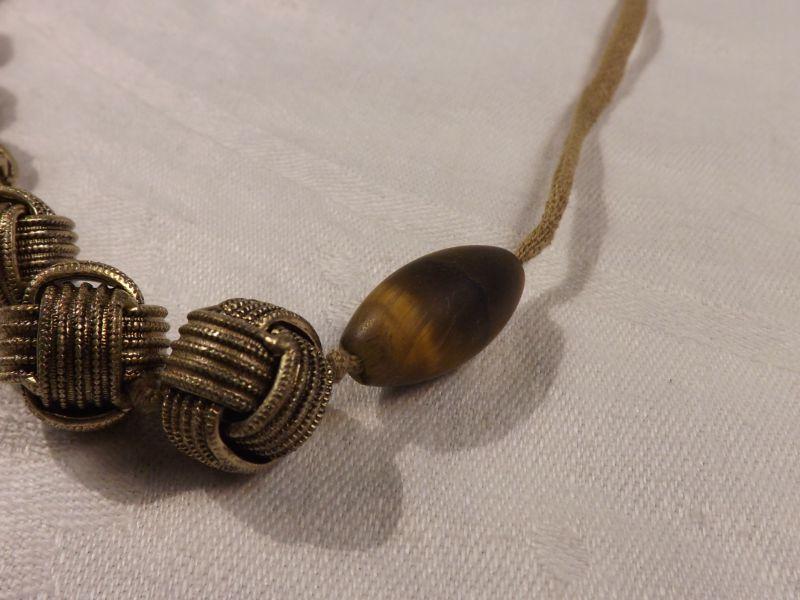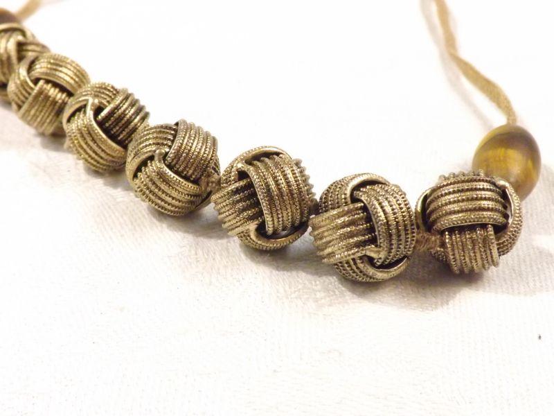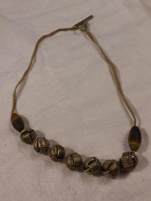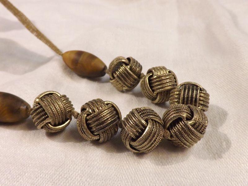 Knotted brass balls and wood bead strung on Fibre Necklace