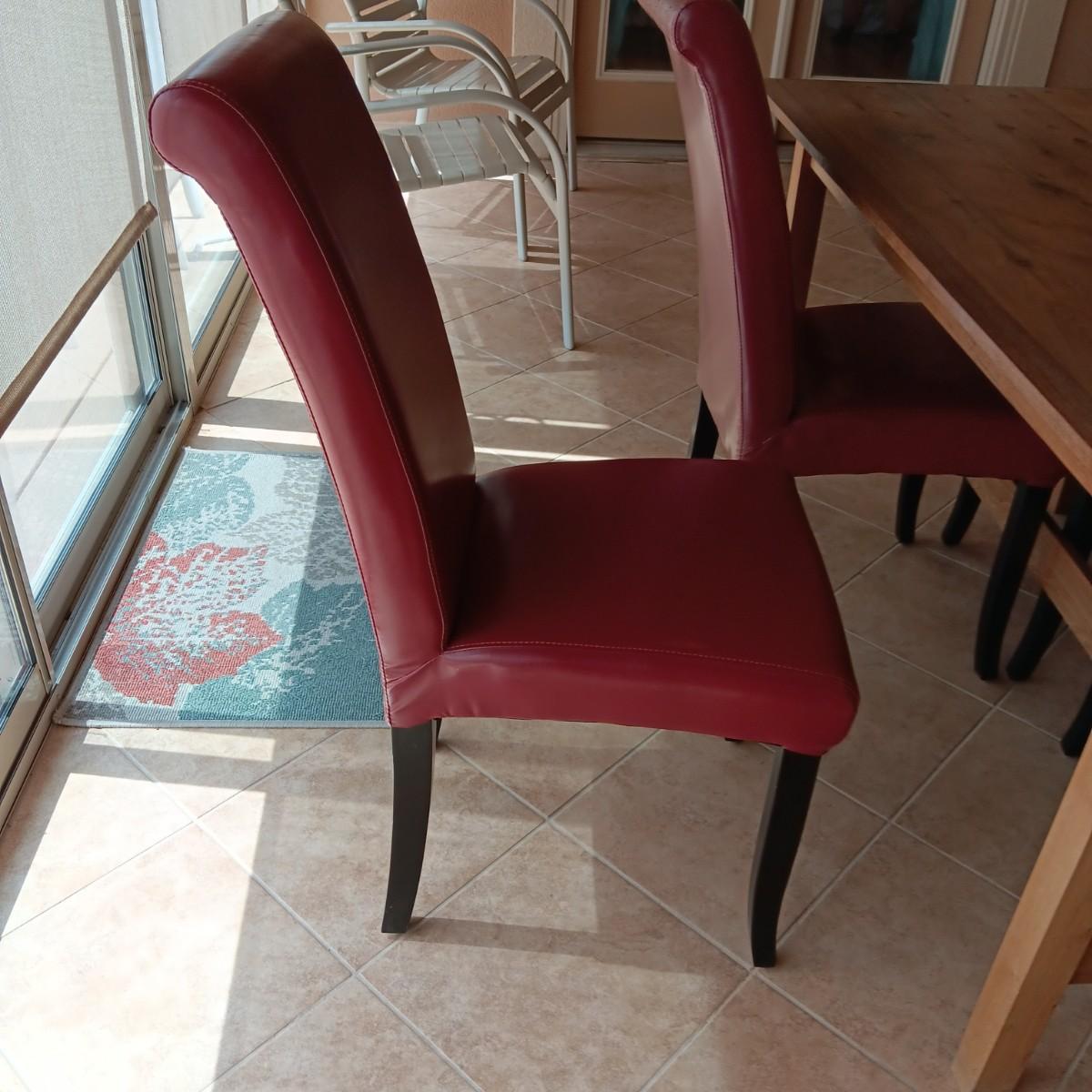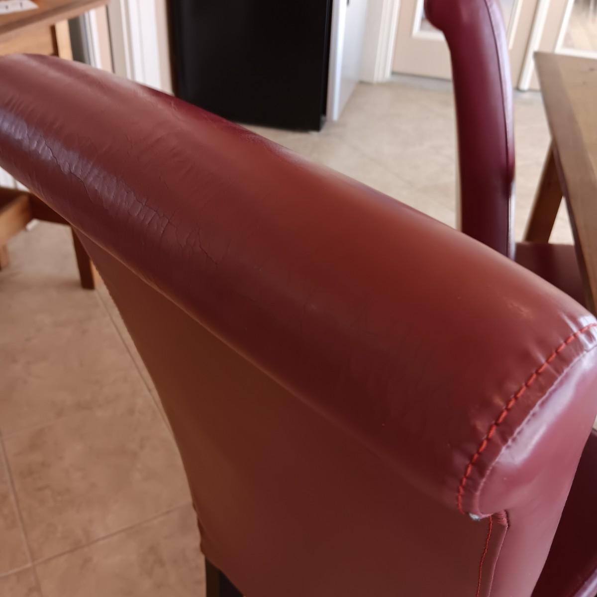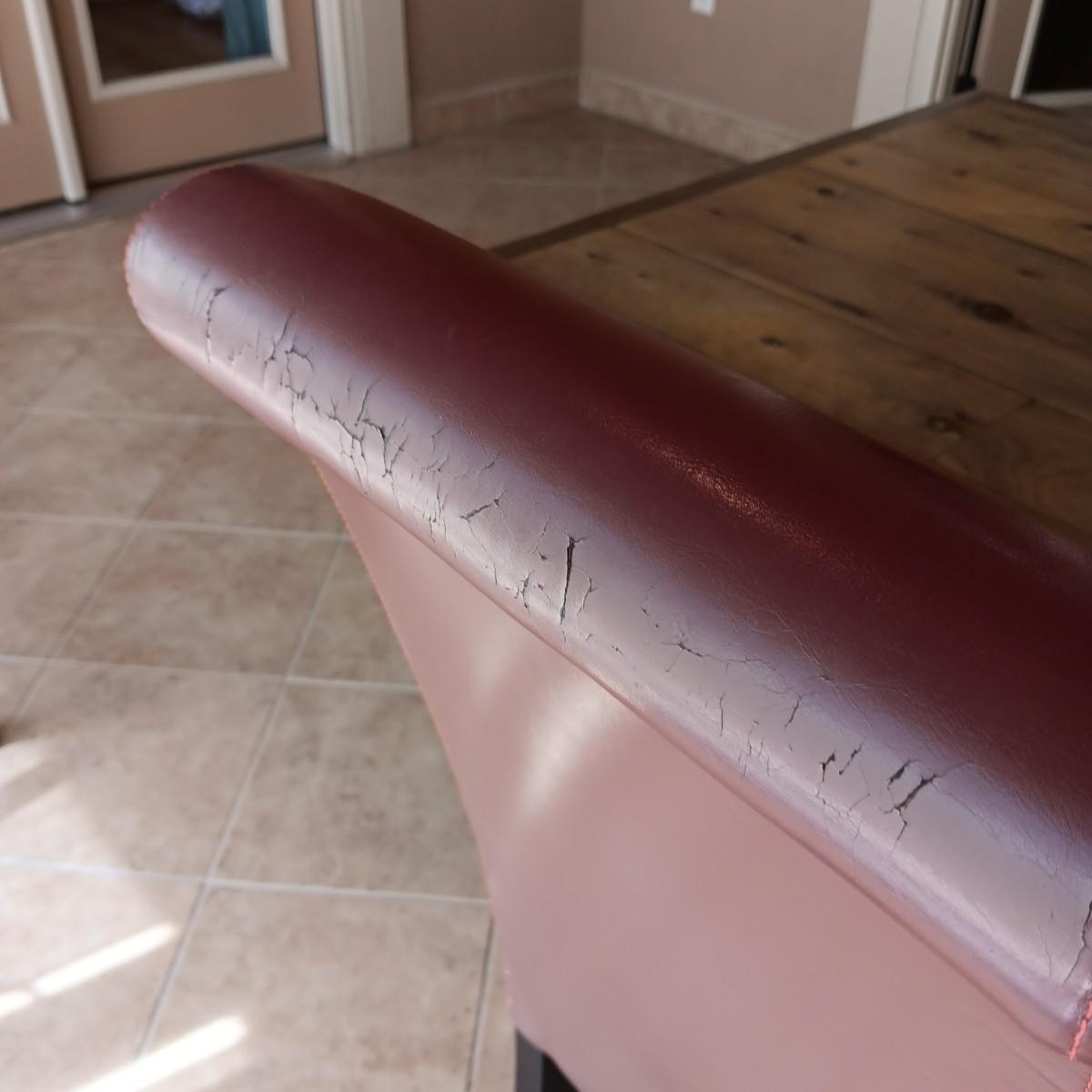 THE TABLE IS LOCATED IN THE SUN ROOM, WHICH GETS A LOT OF SUN. THEREFORE, THE CHAIR'S VINYL IS STARTING TO CRACK AS WELL AS OTHER SUN DAMAGE