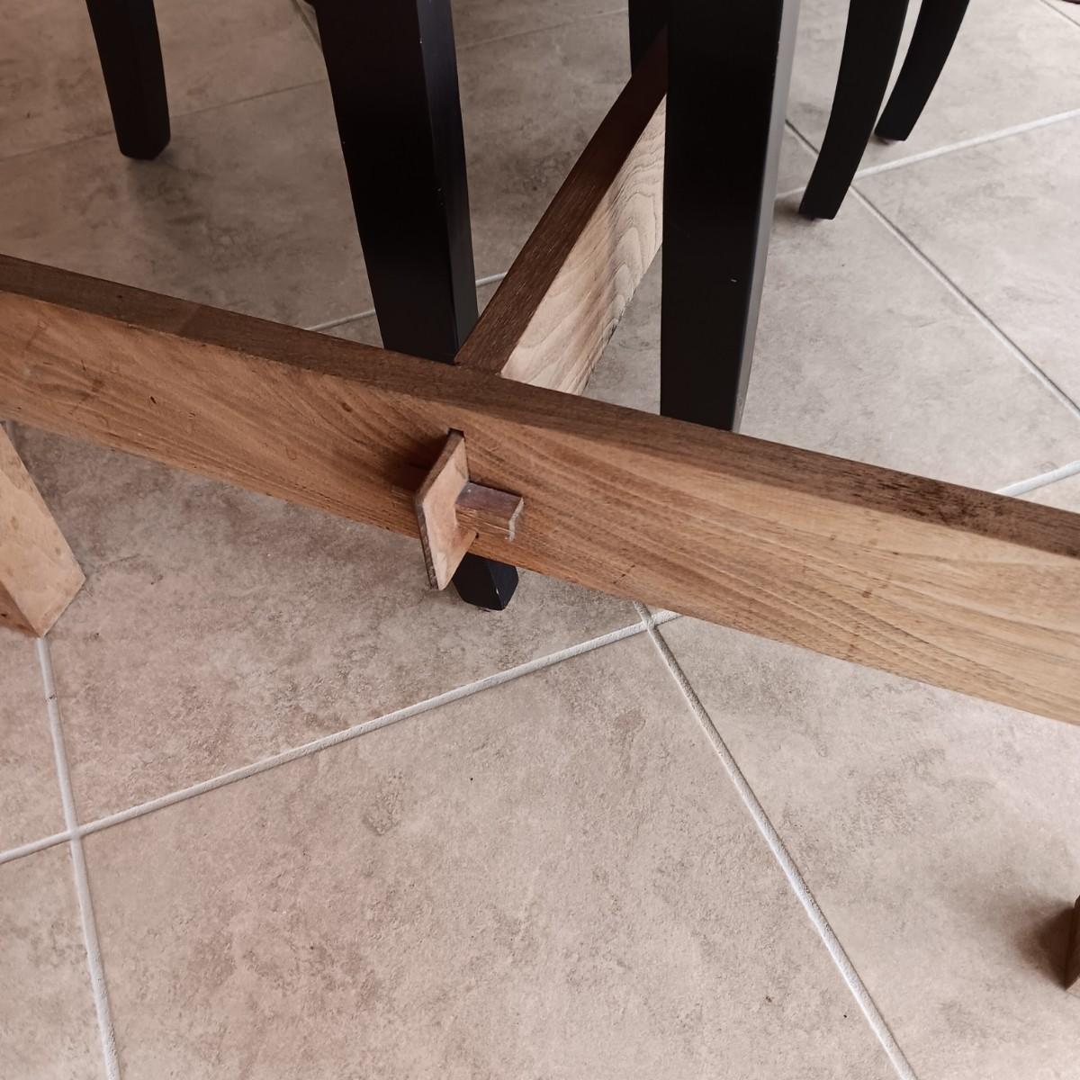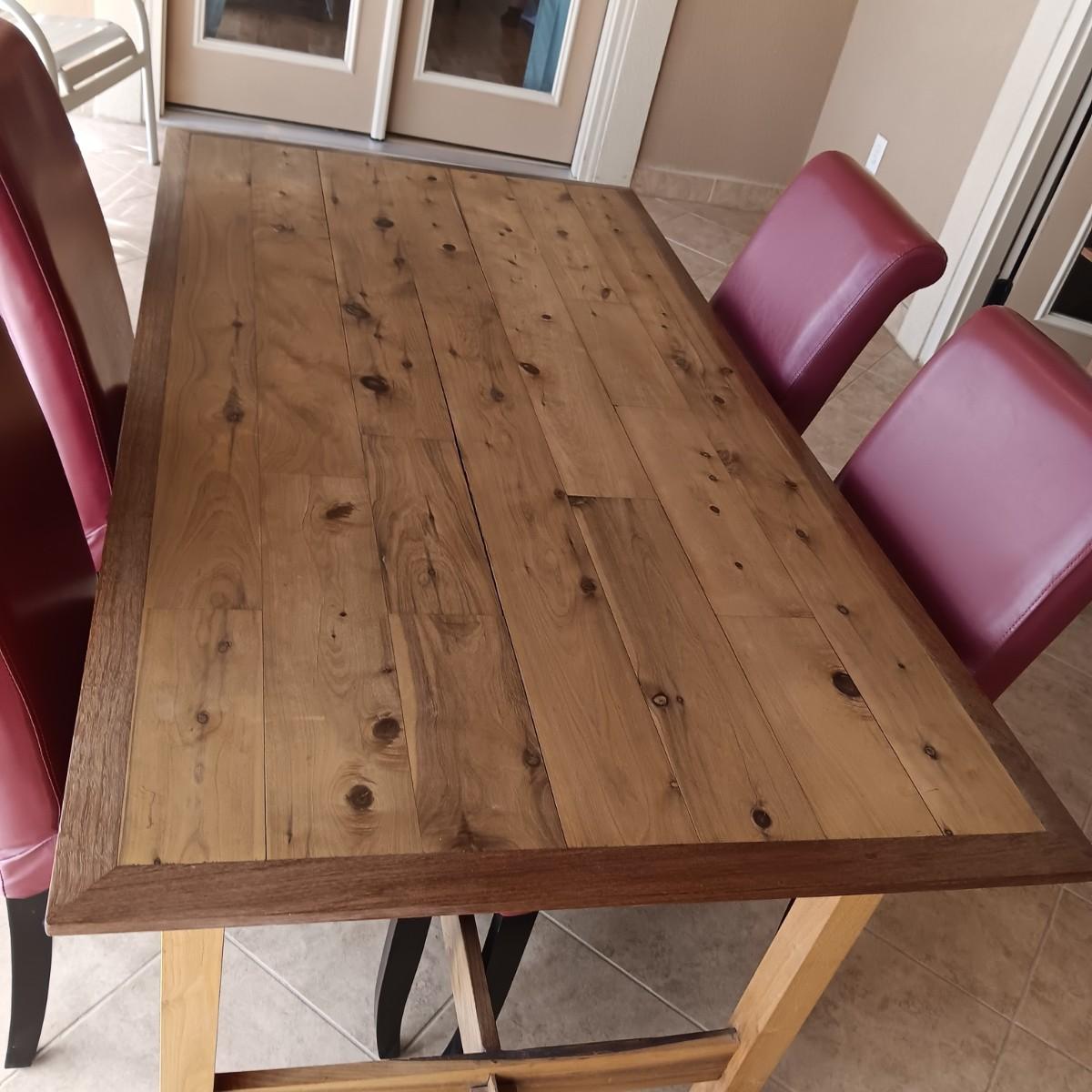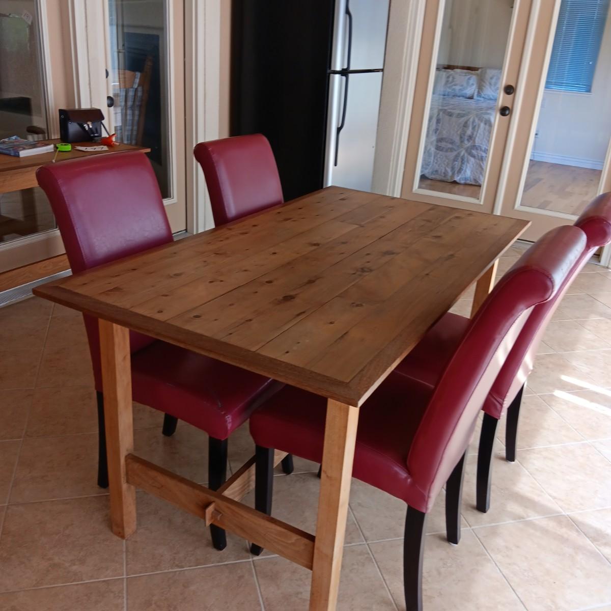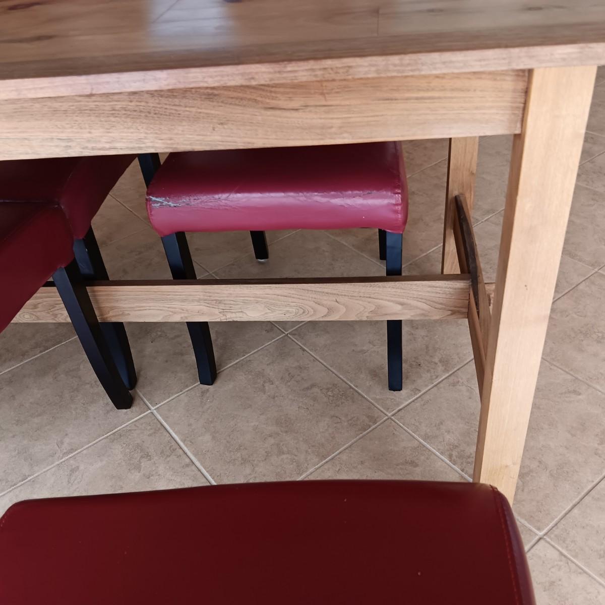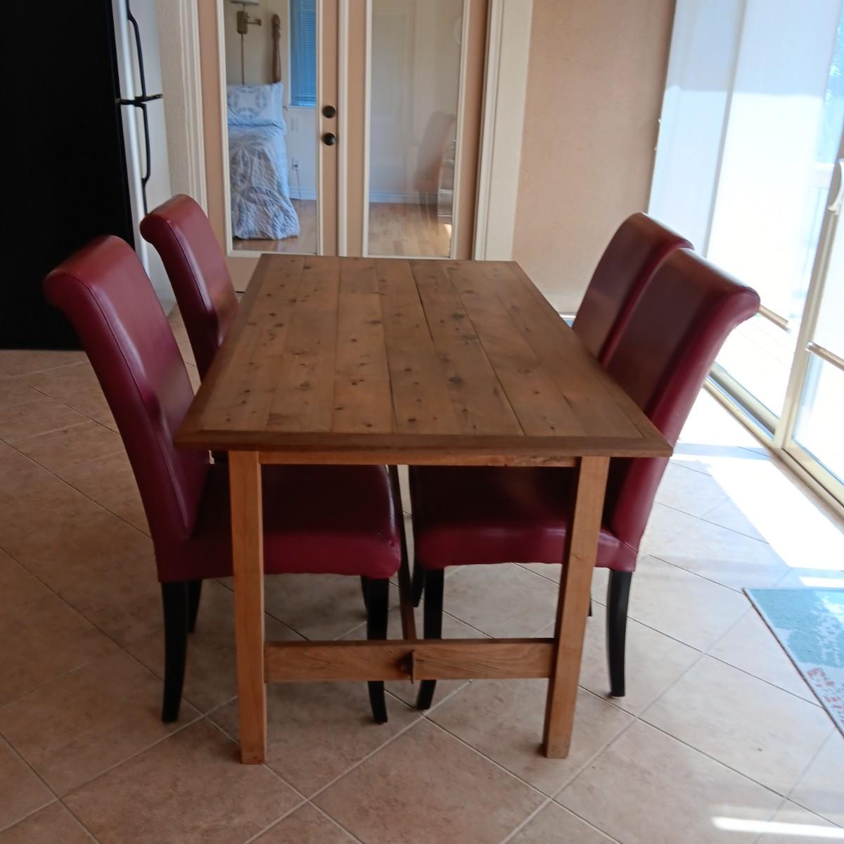 KNOTTY RUSTIC WOODEN TABLE WITH 4 VINYL COVERED CHAIRS