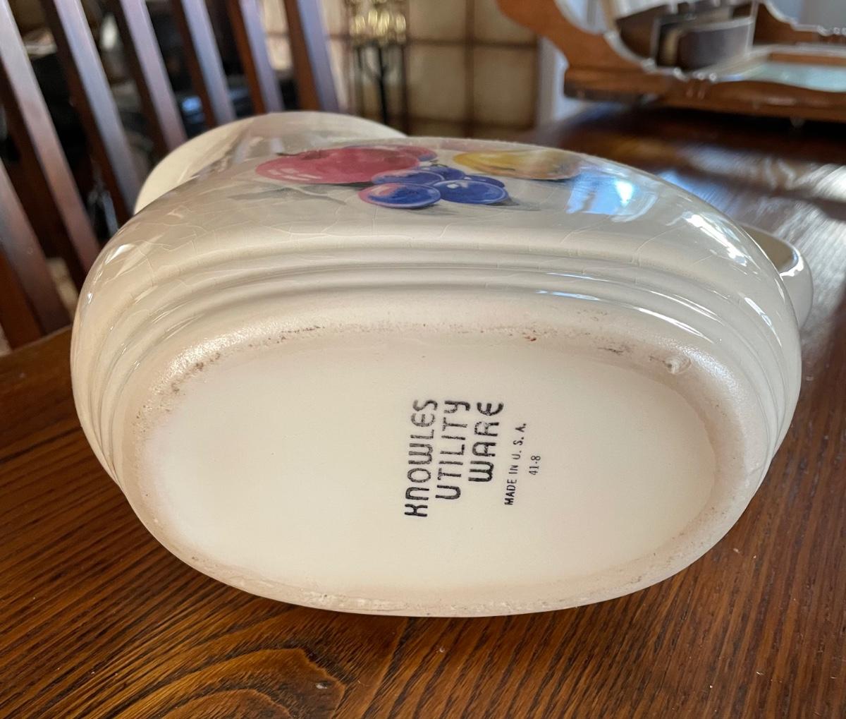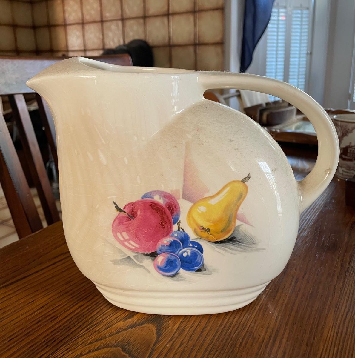 Vintage pitcher with fruit design. Crazing and wear.