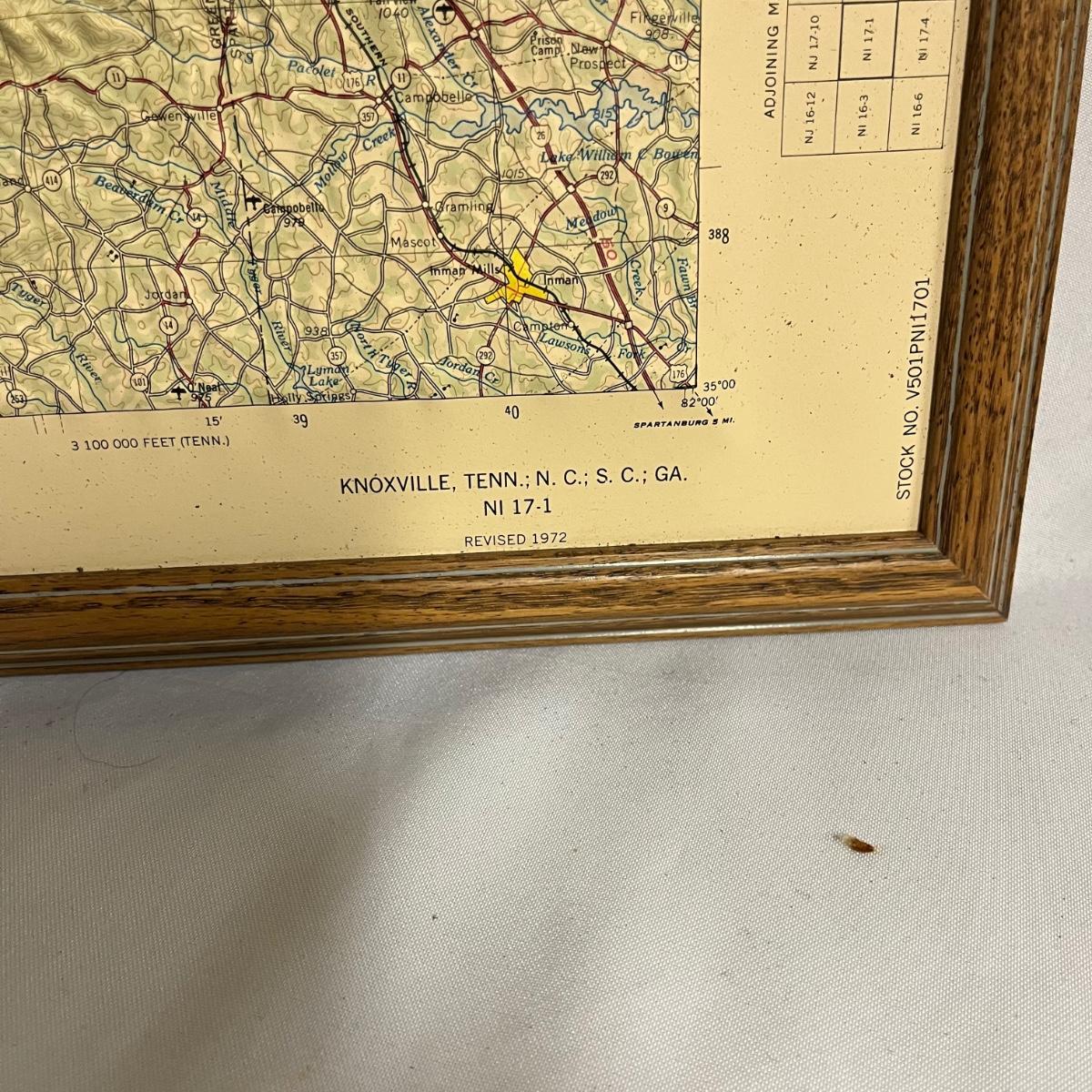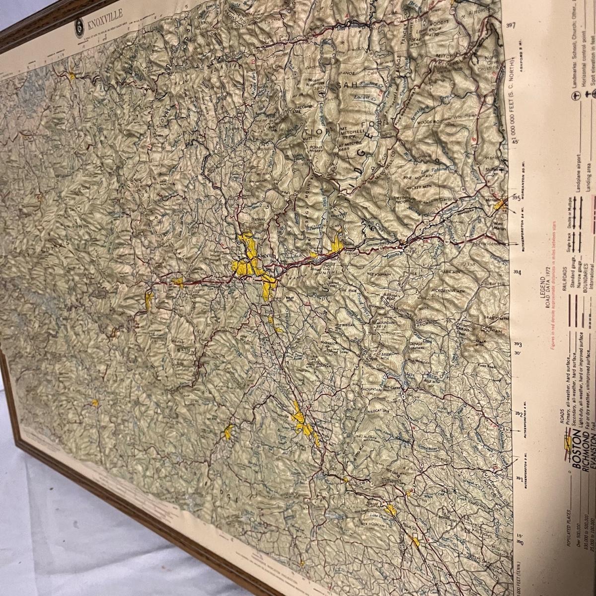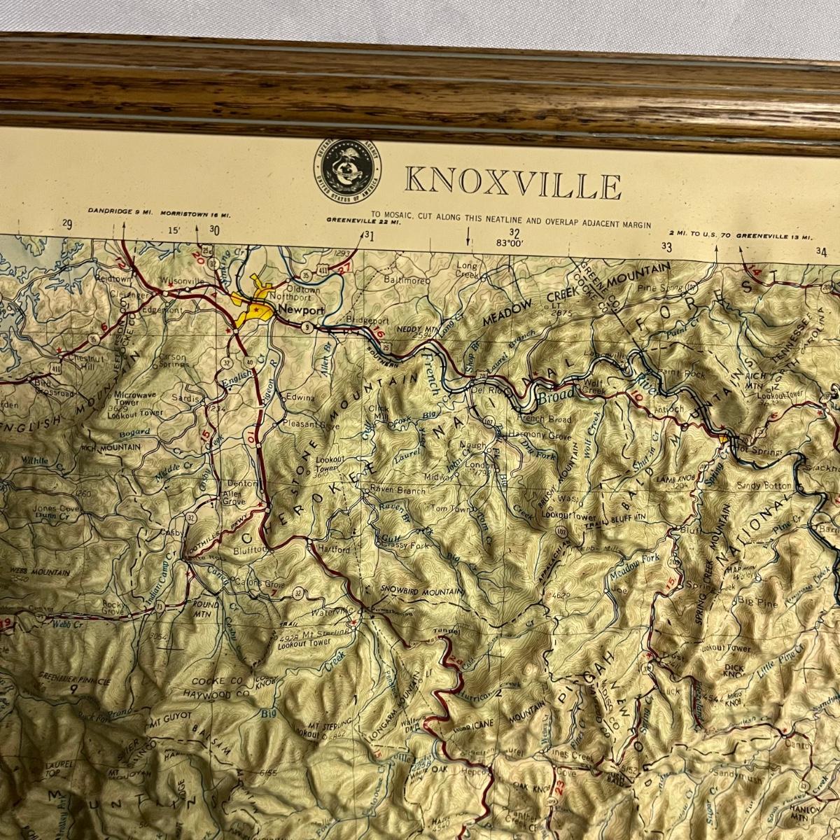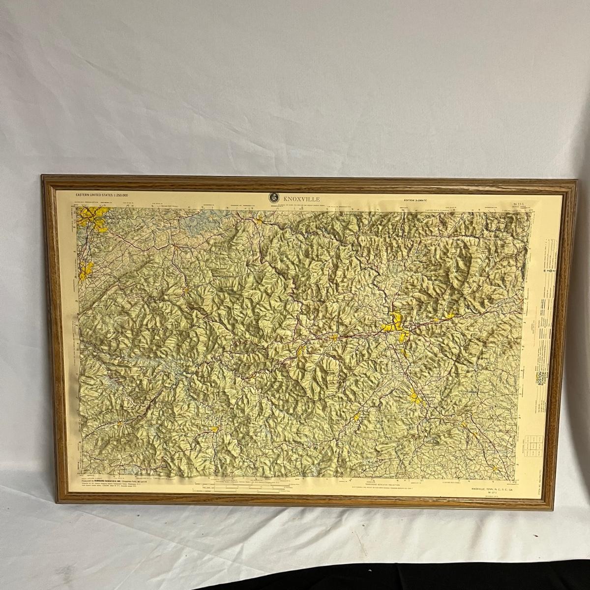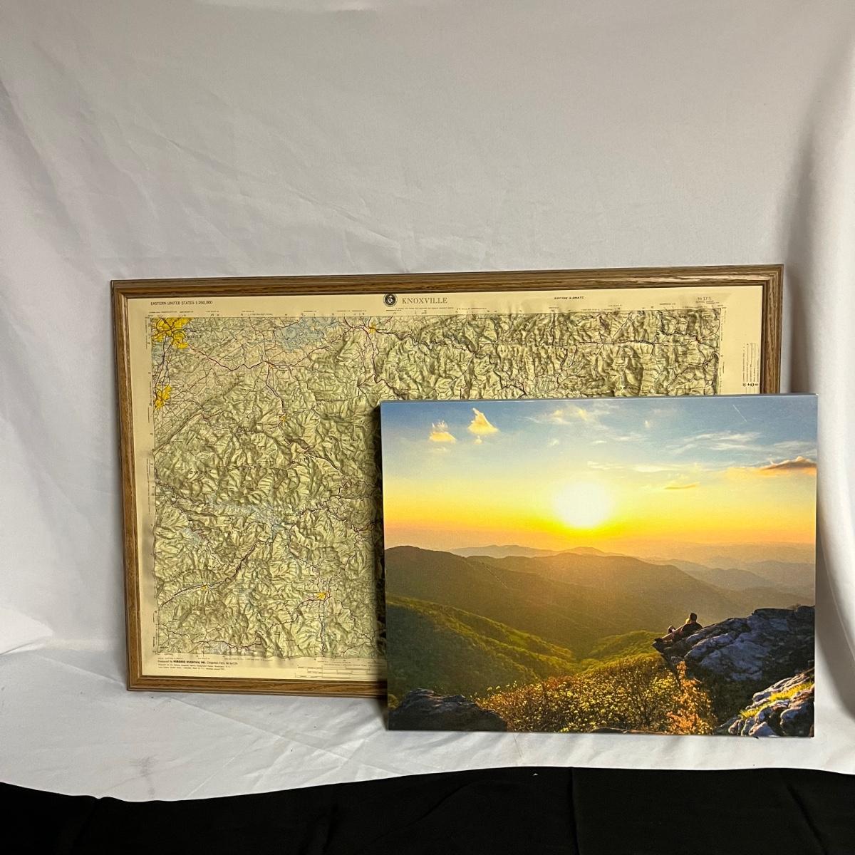Lot includes a 3D map of Knoxville and the surrounding areas that shows elevation. Also includes photo on canvas. Knoxville map Measures 22” x 33.5”.