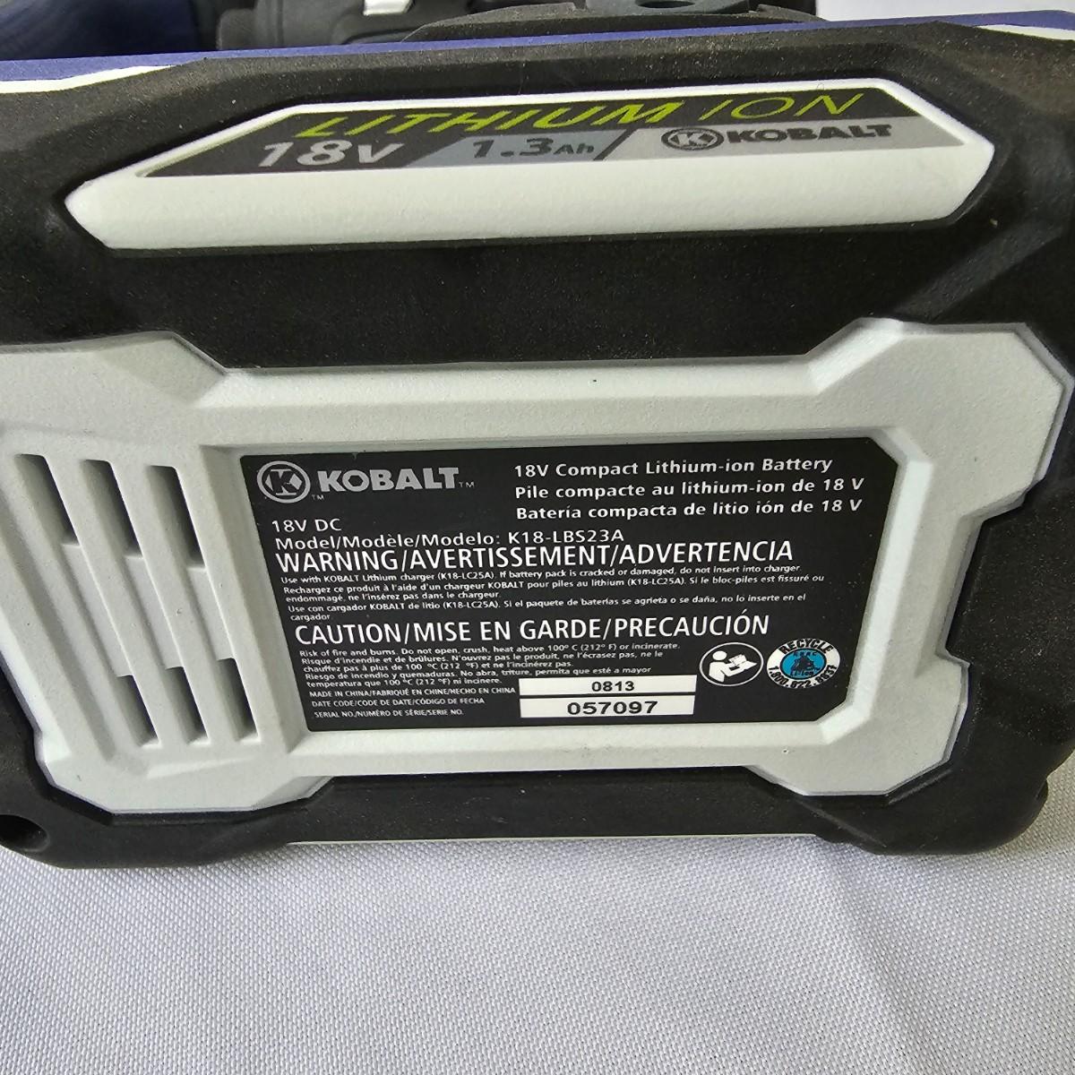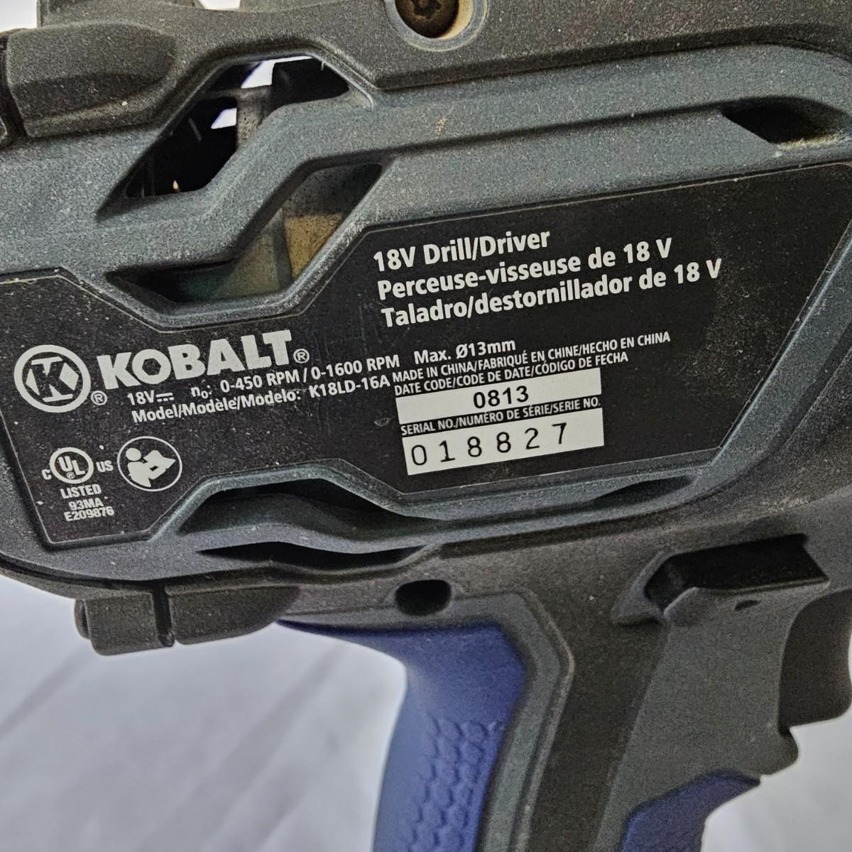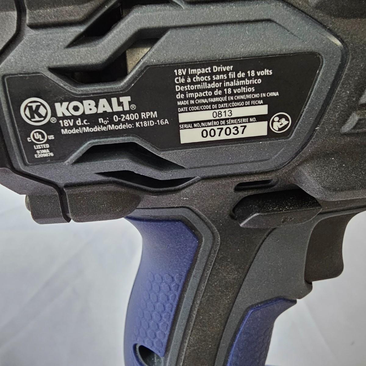 Kobalt brand tools with two 18v batteries and a charger that powered on when plugged in. Two speed drill/driver with light and one impact driver also with light. Both units powered on with batteries. Drill is 8" x 3.5" x 9"H, impact driver is 6" x 3" x 9"H. See photos for details. Shipping available.