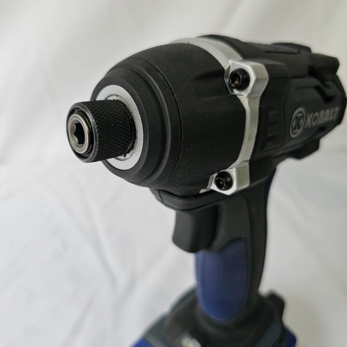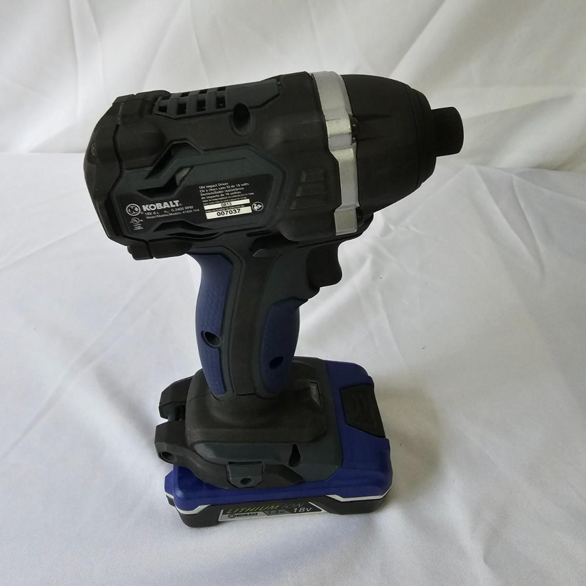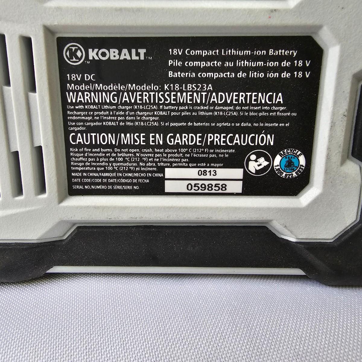 Kobalt brand tools with two 18v batteries and a charger that powered on when plugged in. Two speed drill/driver with light and one impact driver also with light. Both units powered on with batteries. Drill is 8" x 3.5" x 9"H, impact driver is 6" x 3" x 9"H. See photos for details. Shipping available.
