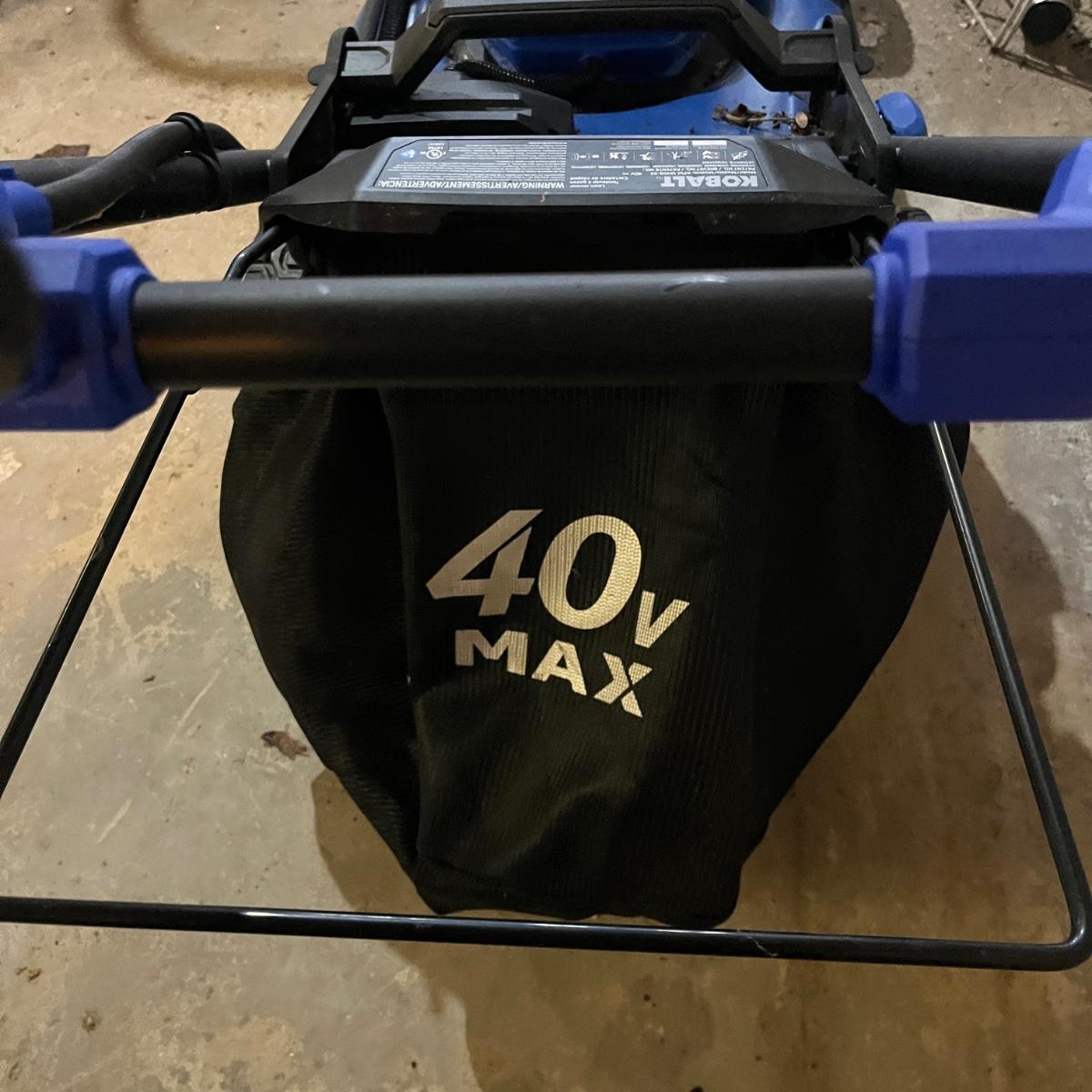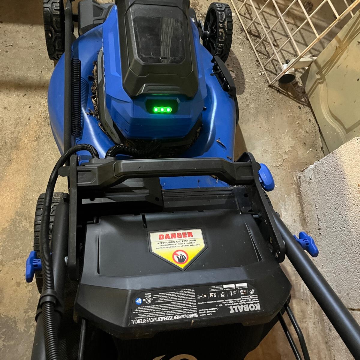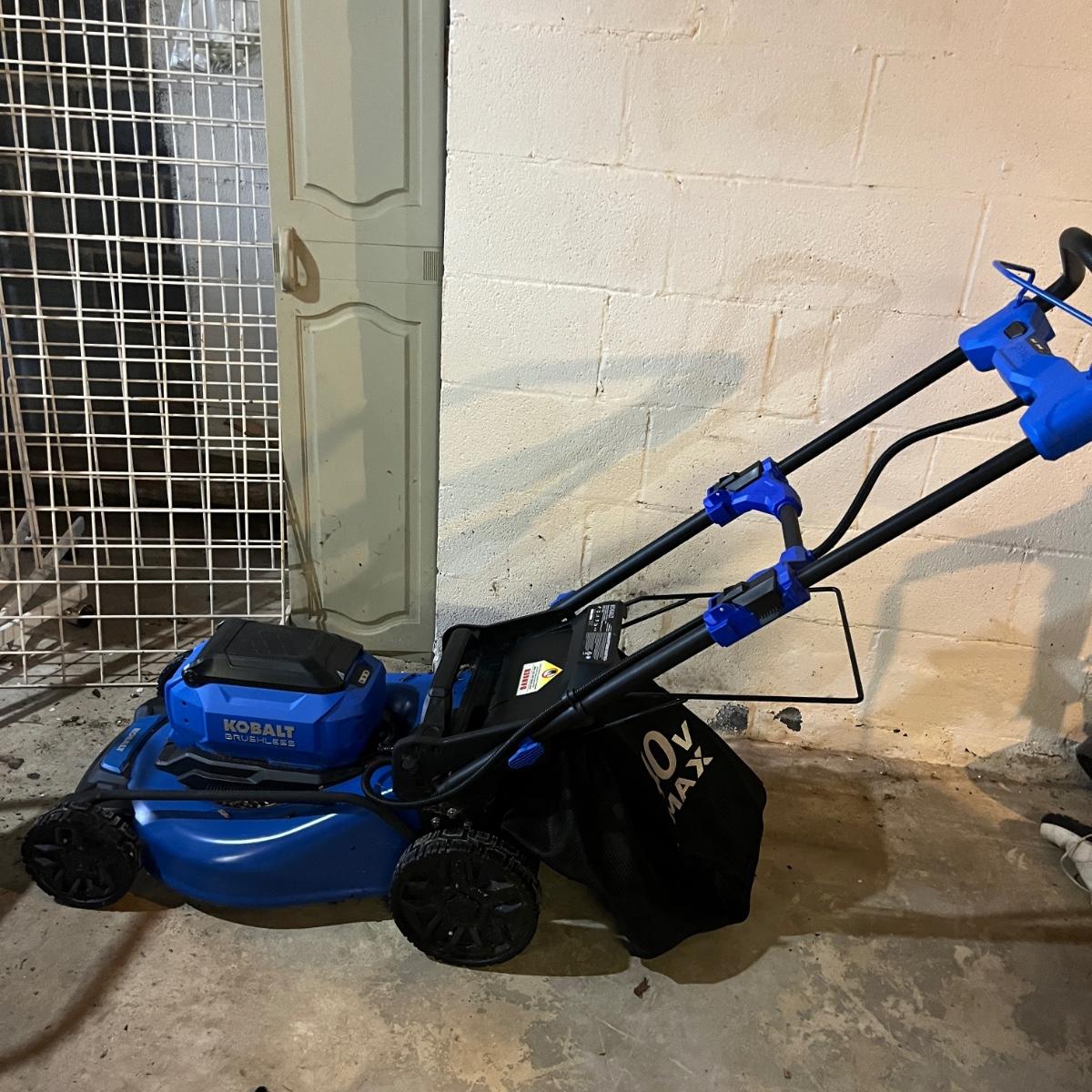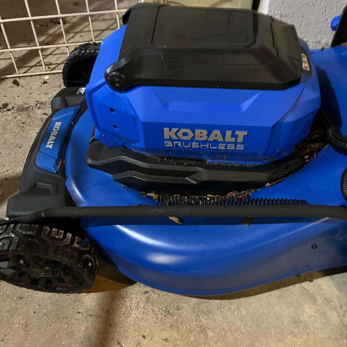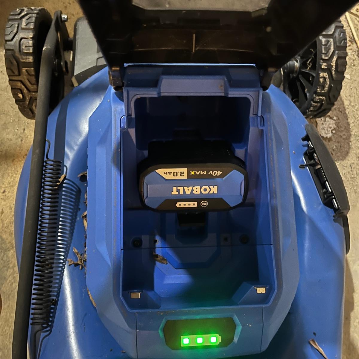 Lot includes a Kobalt 40V push mower with two batteries and charger. Mower powered on when lever pulled.