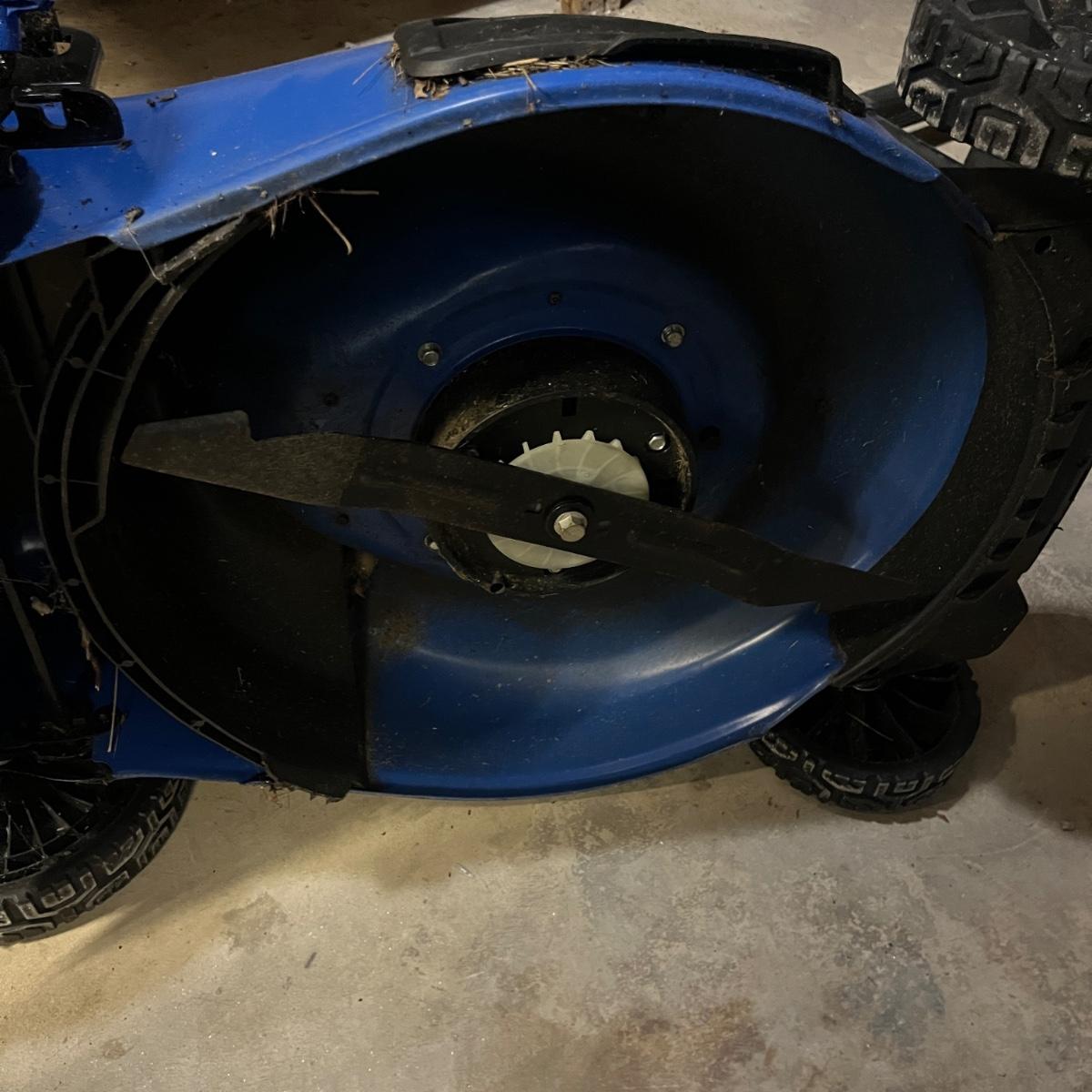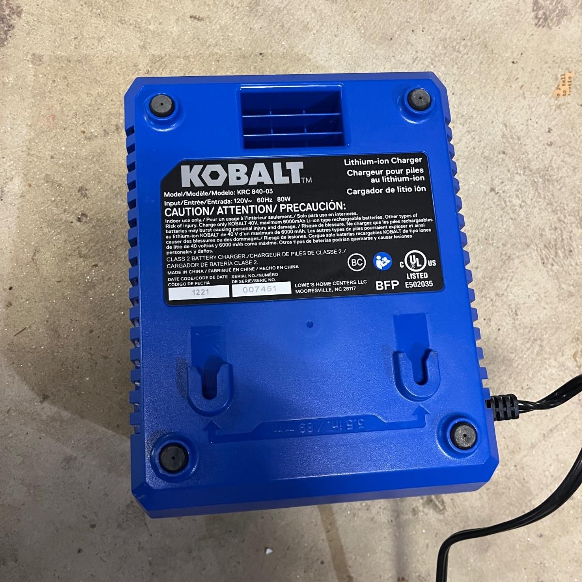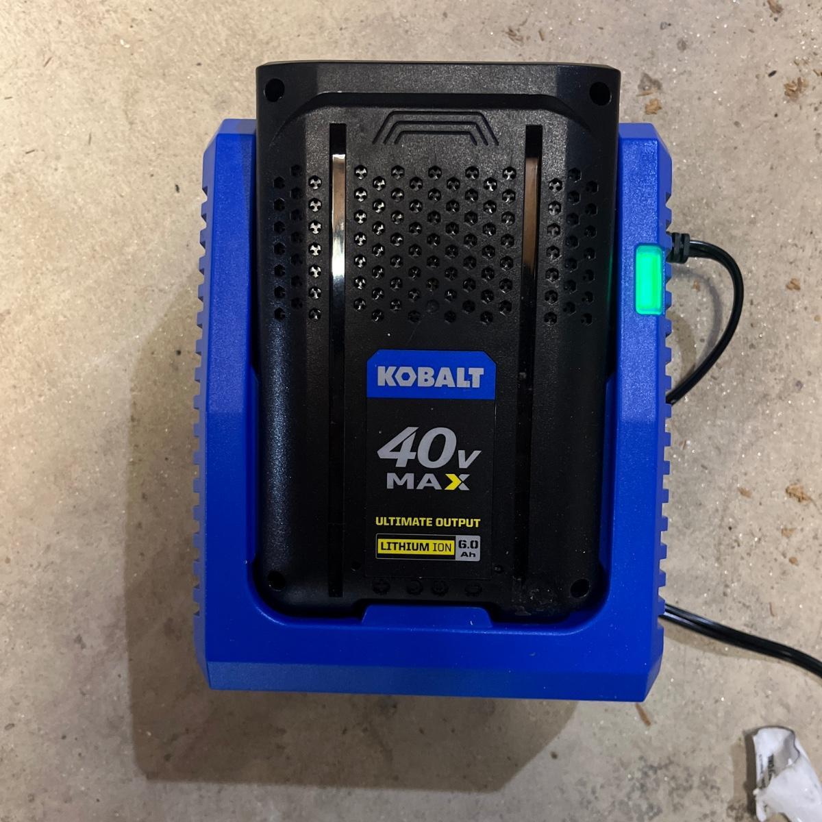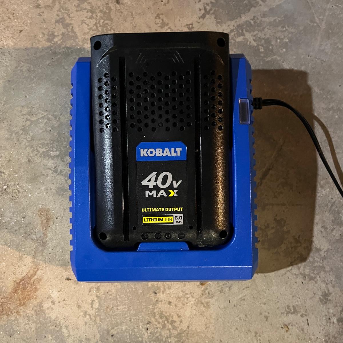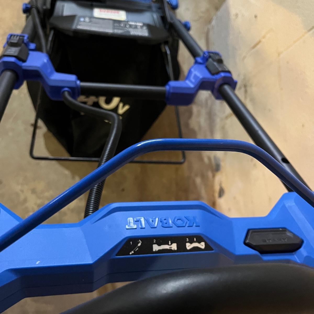 Lot includes a Kobalt 40V push mower with two batteries and charger. Mower powered on when lever pulled.