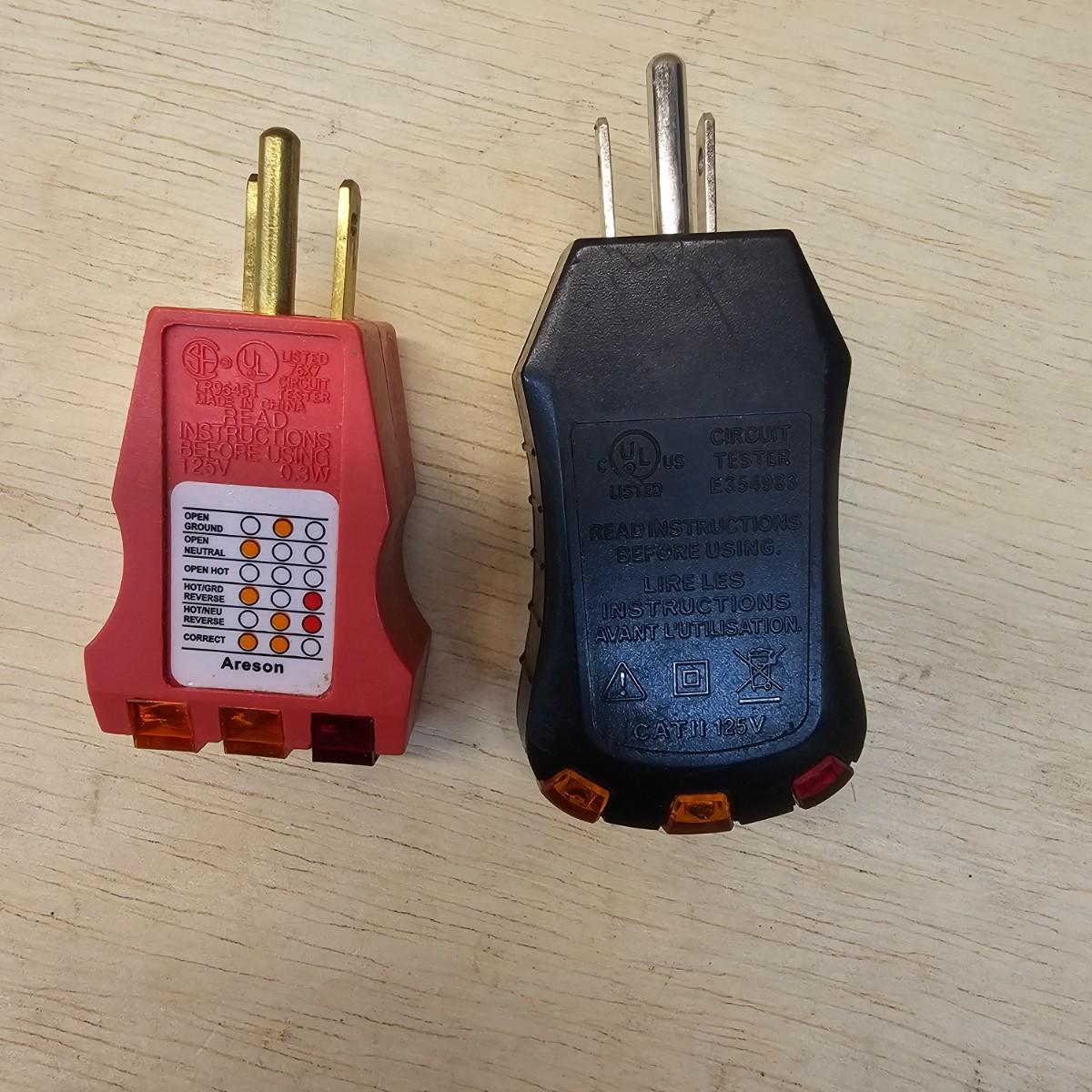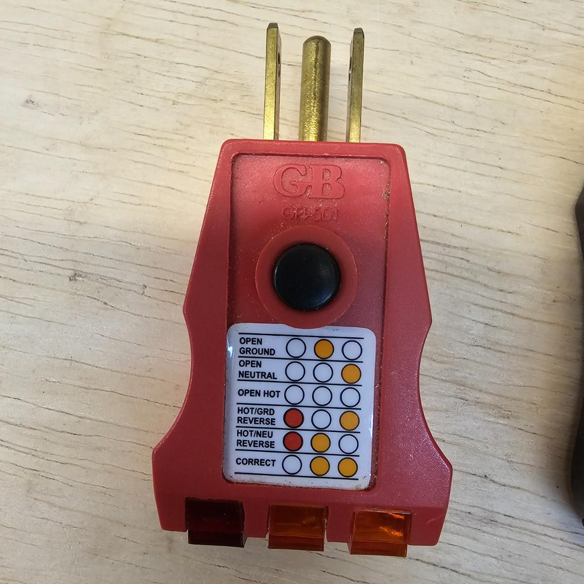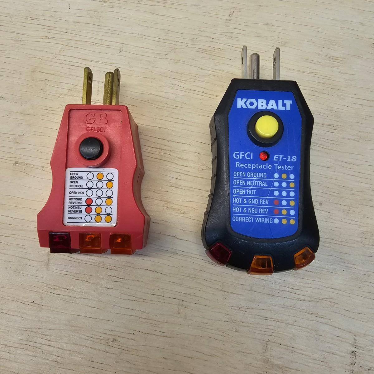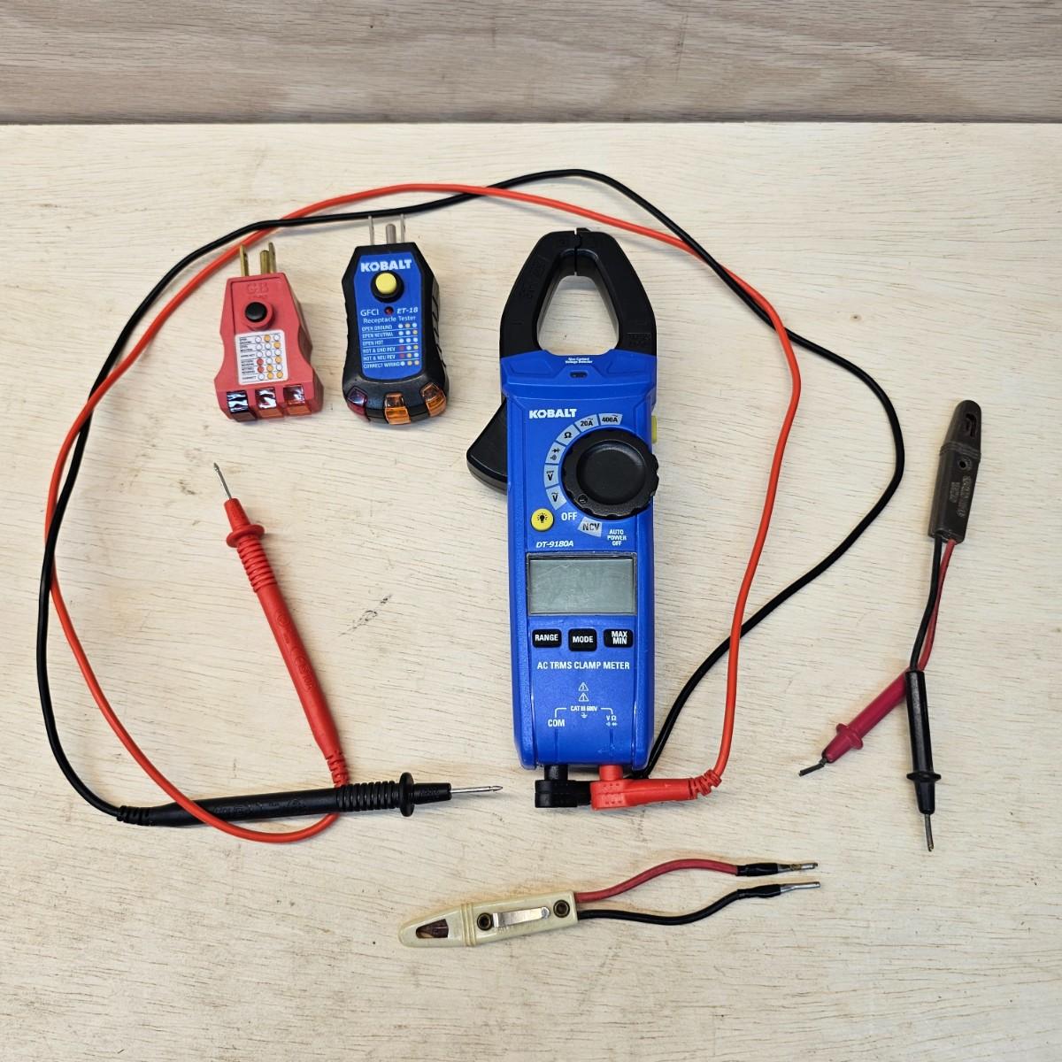 One Kobalt brand multi-tester with attached probes and clamp-on feature. Reads volts, amps, ohms and more. 3.5" x 9"H. Also includes a pair of receptacle testers, one Kobalt and one GB. And two older style voltage indicators with the little lights in the ends. All items tested working. See photos for details. Shipping available.