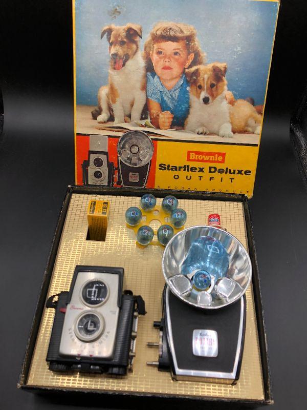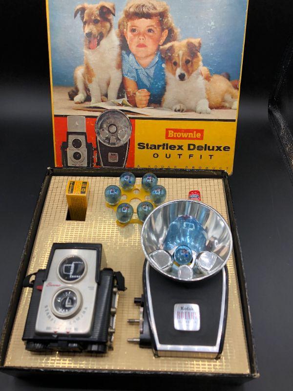 Vintage Kodak Brownie Starflex Deluxe Outfit boxed camera set. Comes as shown in photos. Working condition is unknown.