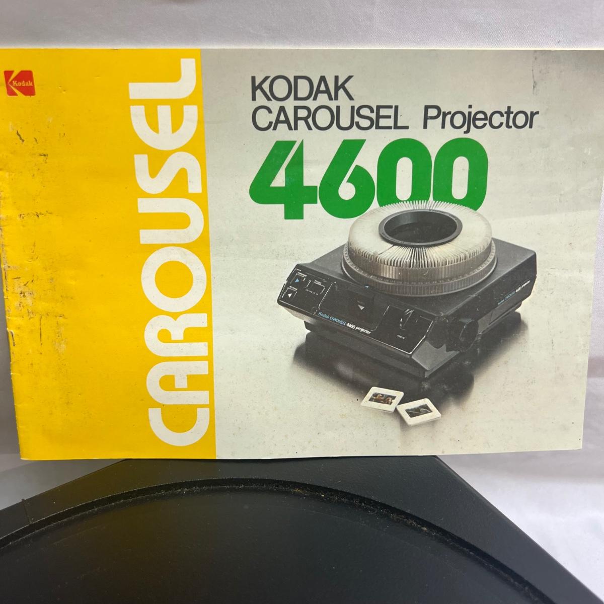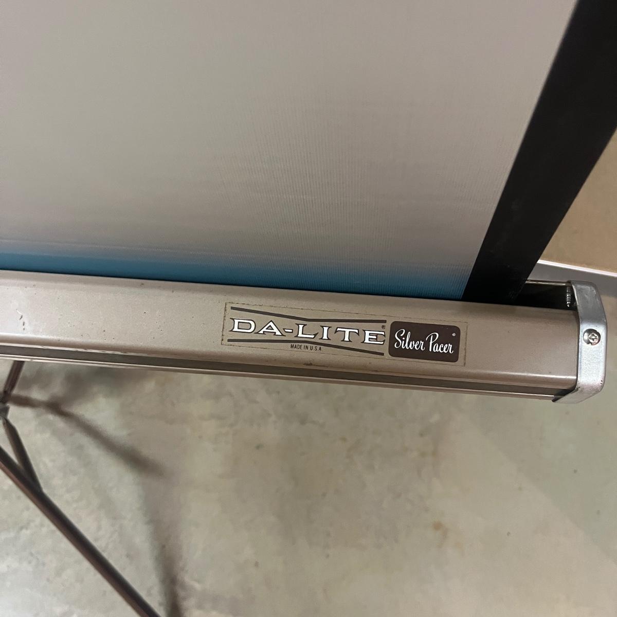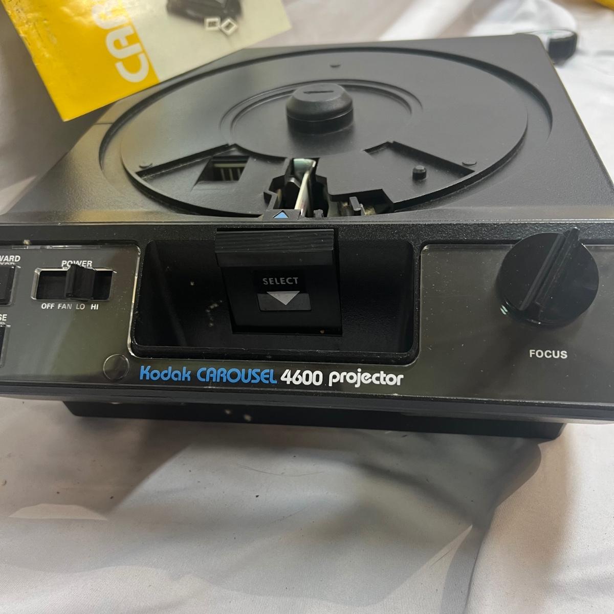 Kodak, carousel projector model 4600. The projector measures 13” X 11” X 4”H and fully powers on when plugged in including projecting light. The bulb is working. Also includes a Da-Lite projector screen that measures 52” x 27” x 76”H when open.