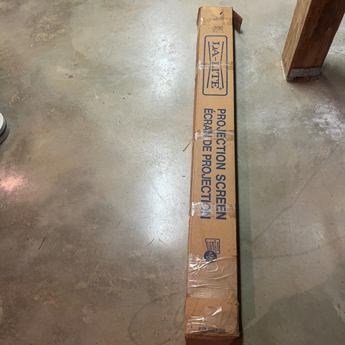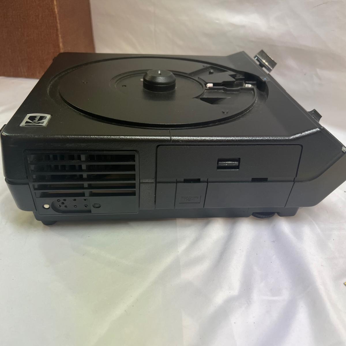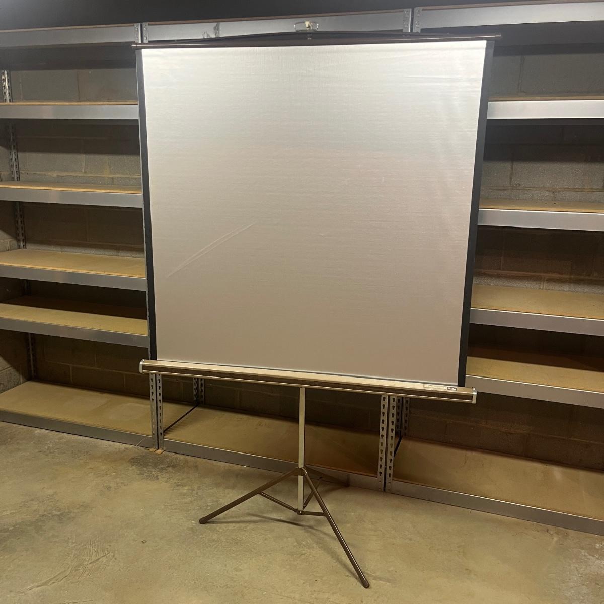 Kodak, carousel projector model 4600. The projector measures 13” X 11” X 4”H and fully powers on when plugged in including projecting light. The bulb is working. Also includes a Da-Lite projector screen that measures 52” x 27” x 76”H when open.