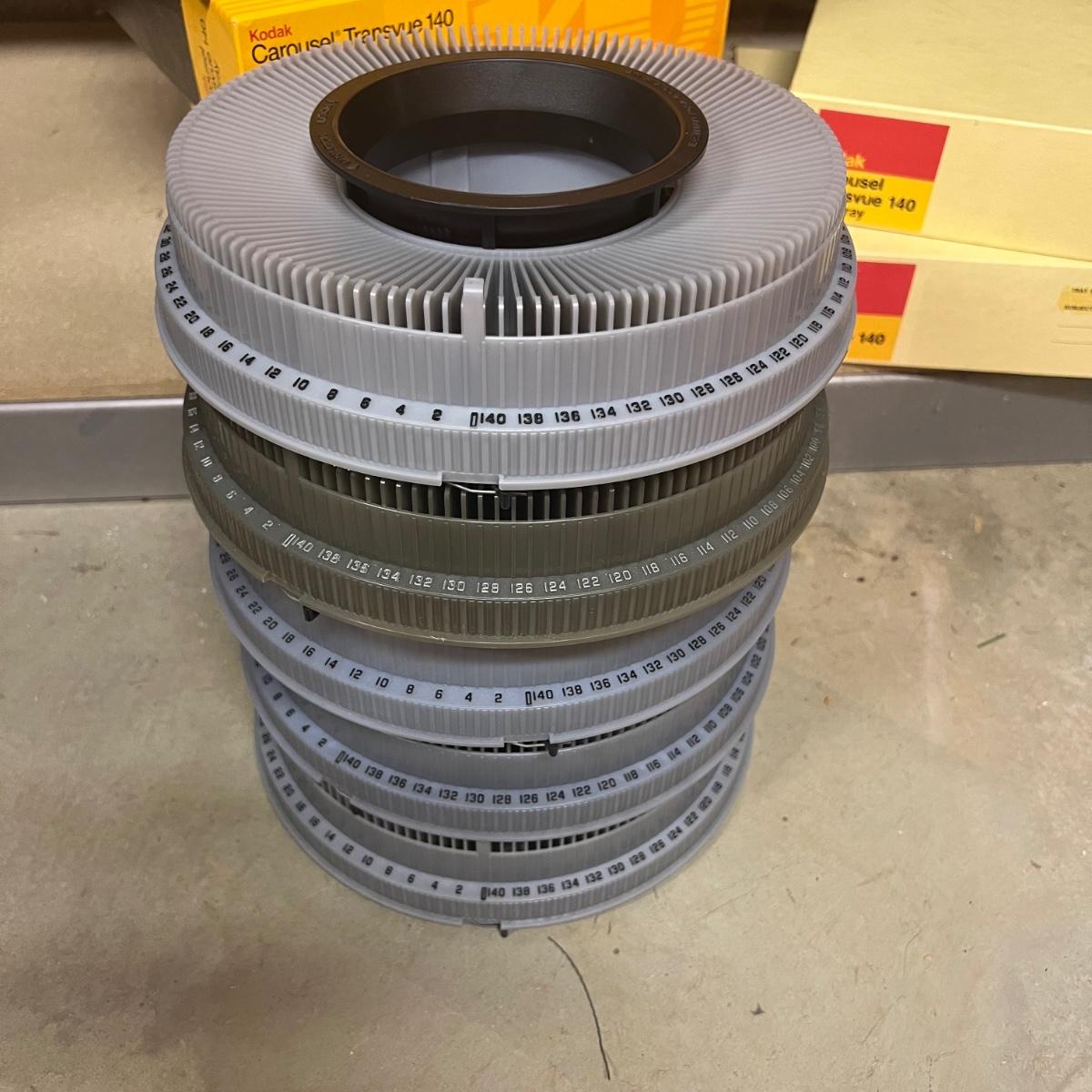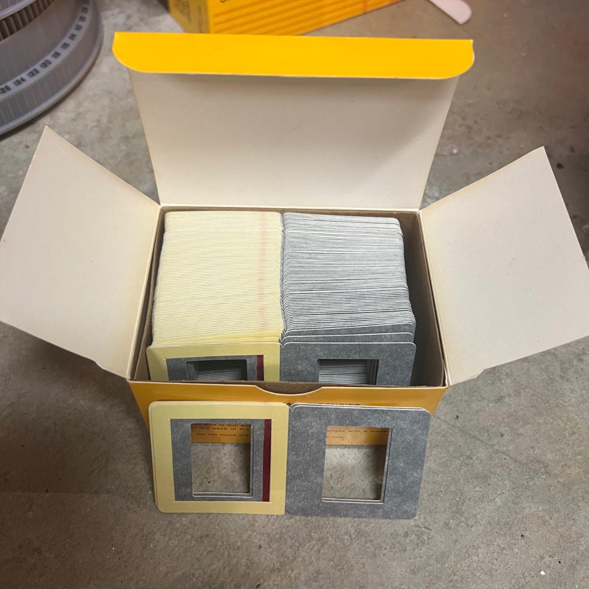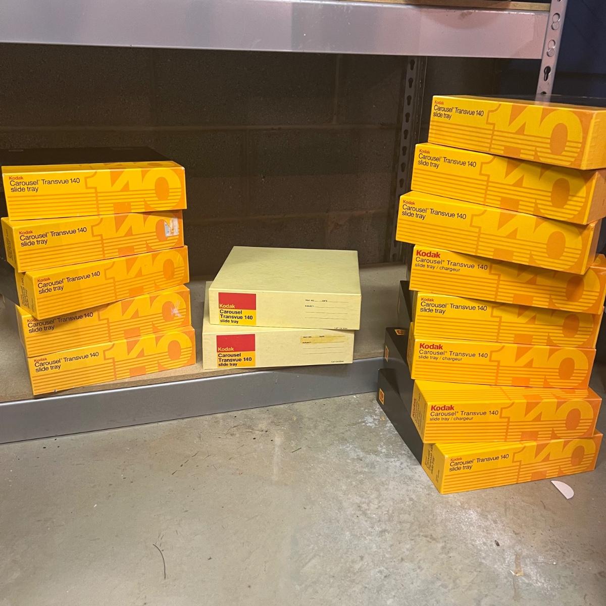 Twenty-nine Kodak carousels, Fifteen Transvue 140 carousels in boxes and five without boxes. Nine Carousel Transvue 80 slide trays in boxes. One box of ready mount transparencies labeled 100.