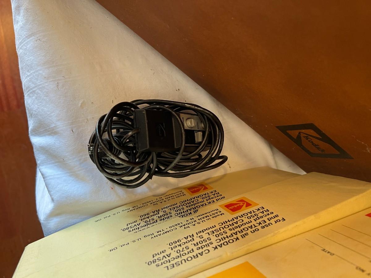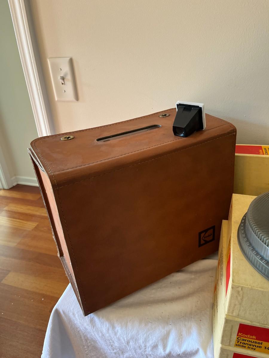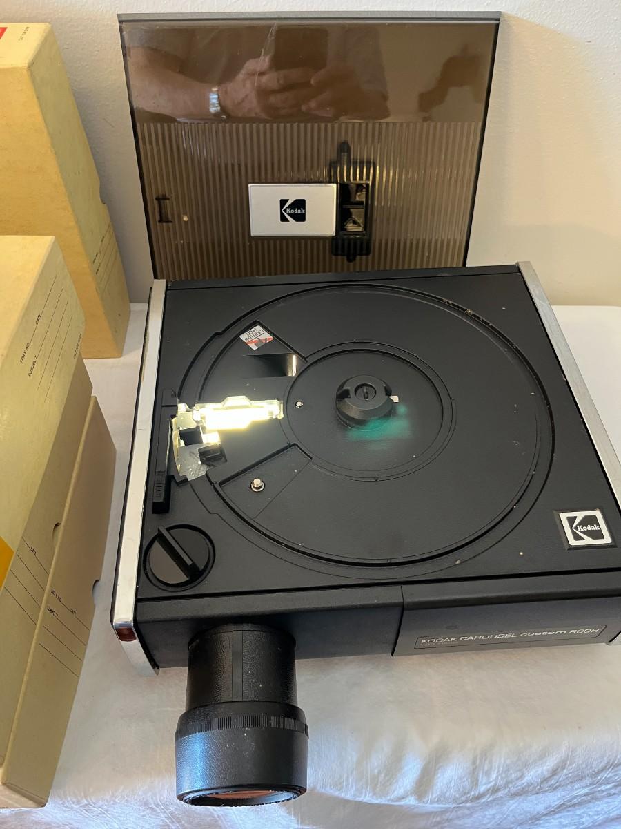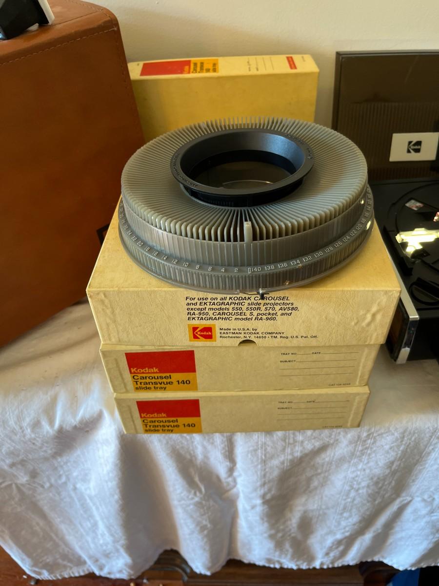 Kodak Slide Carousel Projector Model 960H and 4- 140 Unit Carousels, Remote Control and Carry Case. Tested Bulb and fan in working order. Includes Da-Lite Screen