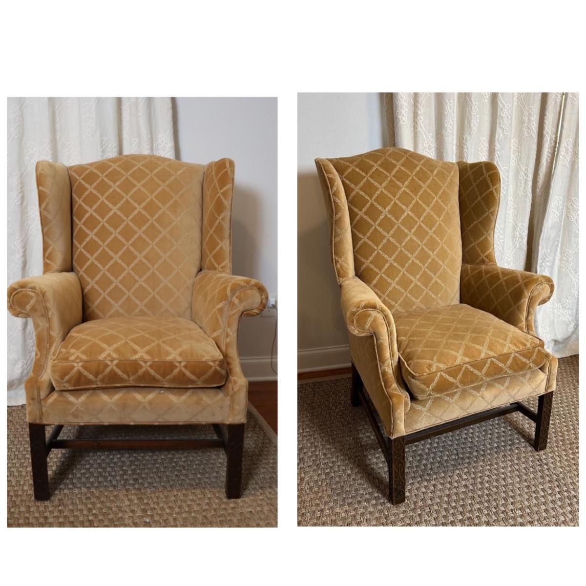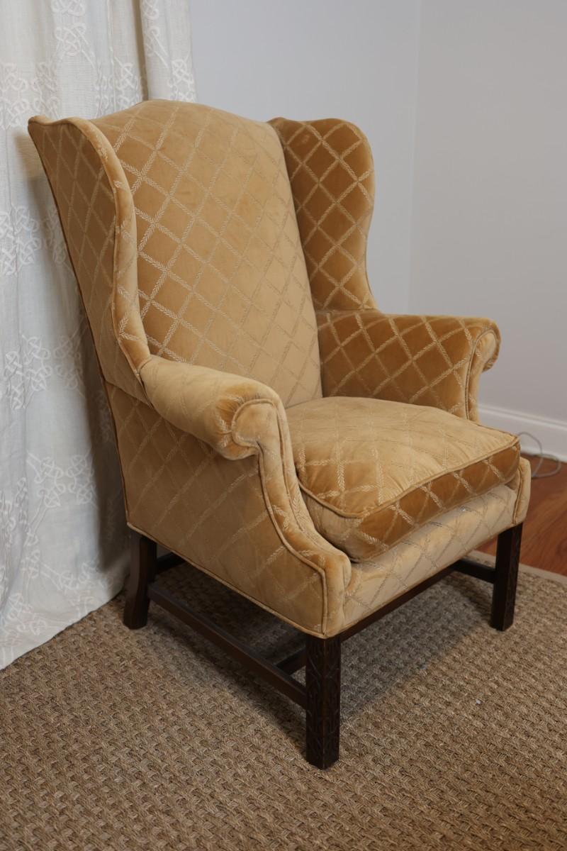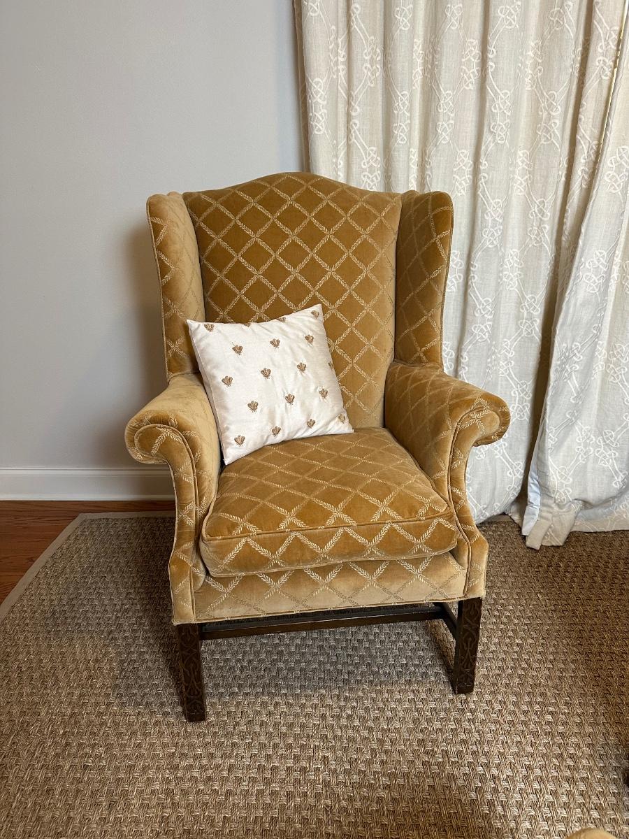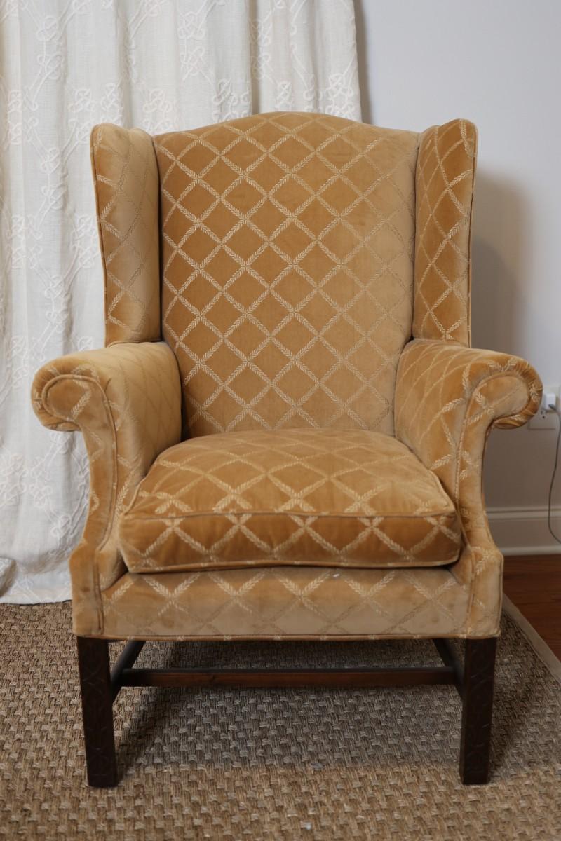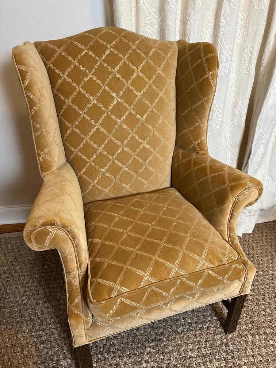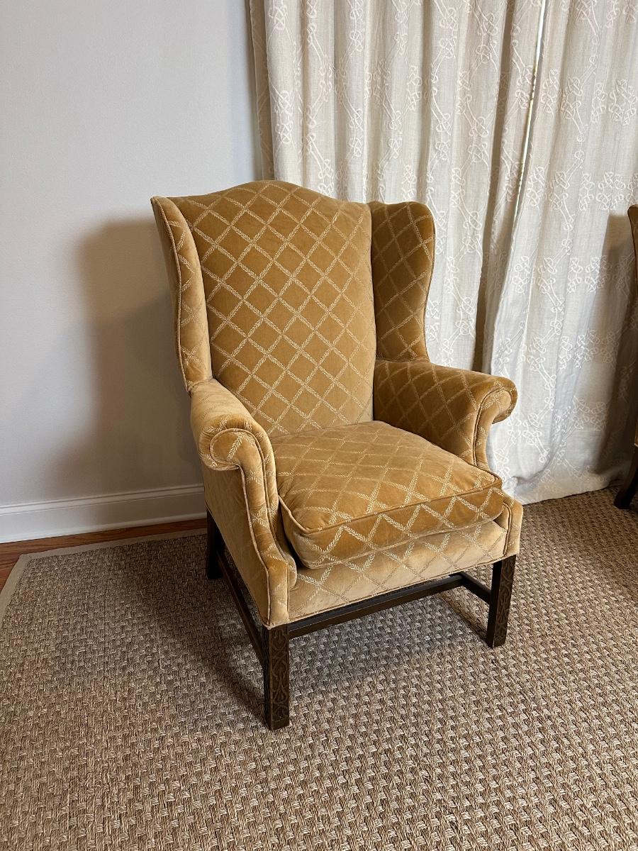 TWO elegant custom-upholstered wingback chairs by Kohlmaier of New Orleans. Features gold diamond-patterned embroidered velvet, rolled arms, and carved dark wood legs. High-quality craftsmanship with timeless style. In excellent condition with minimal wear.