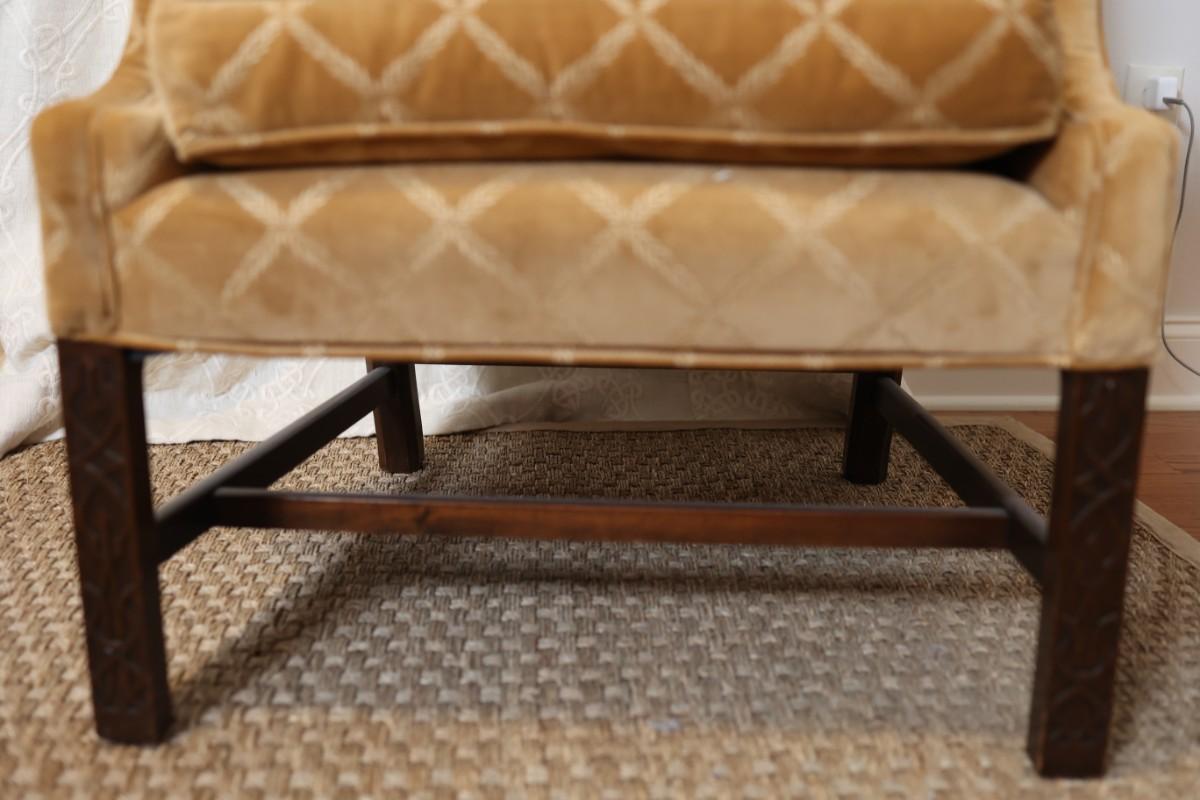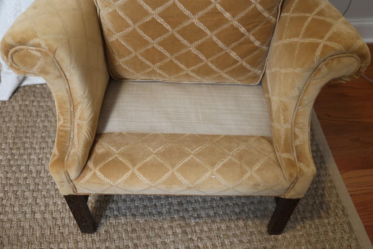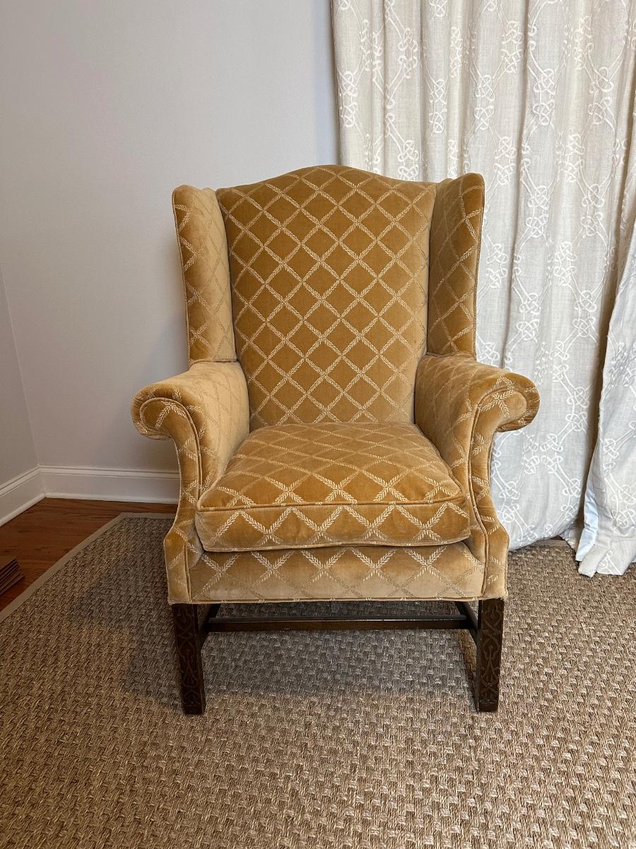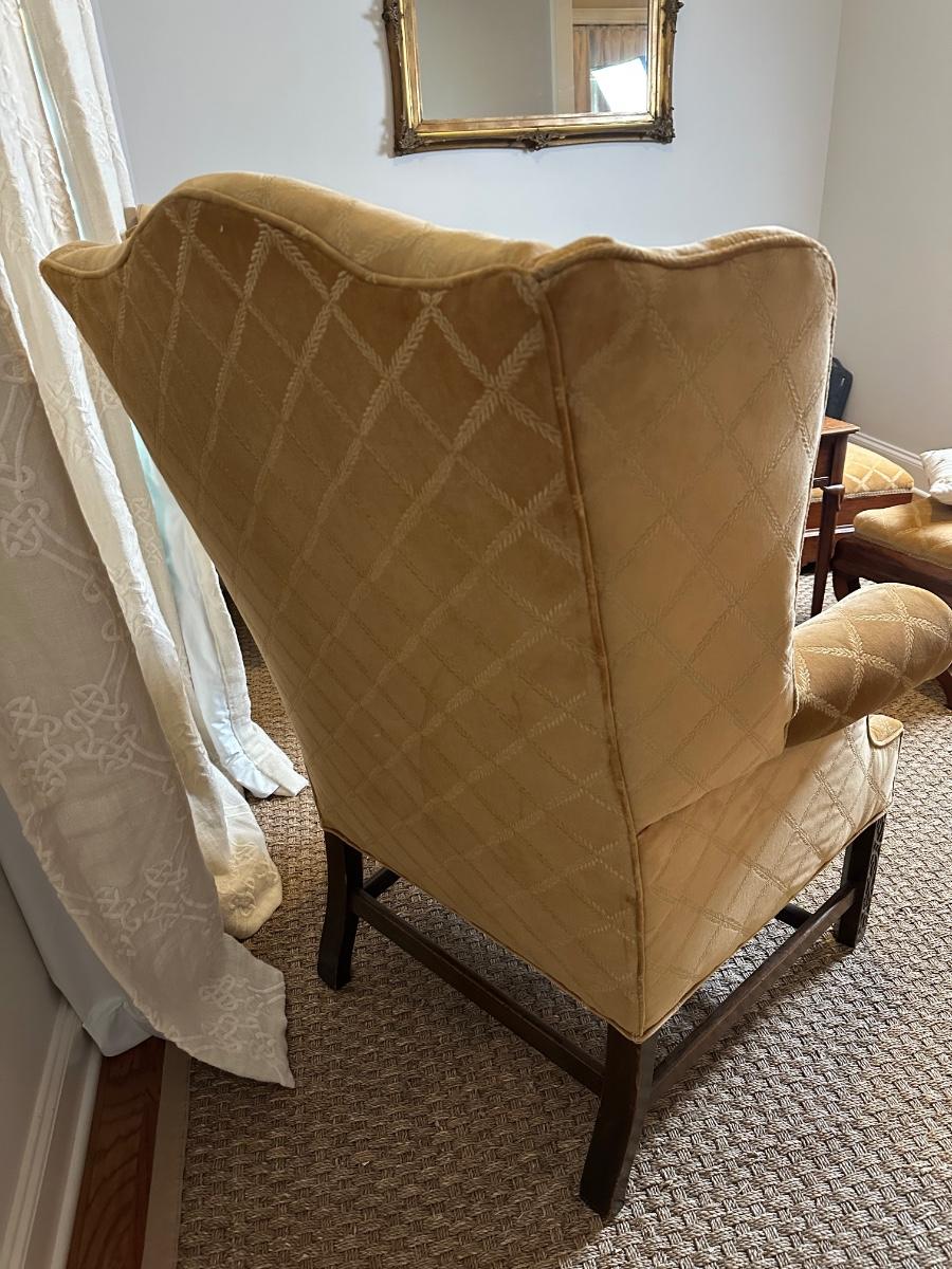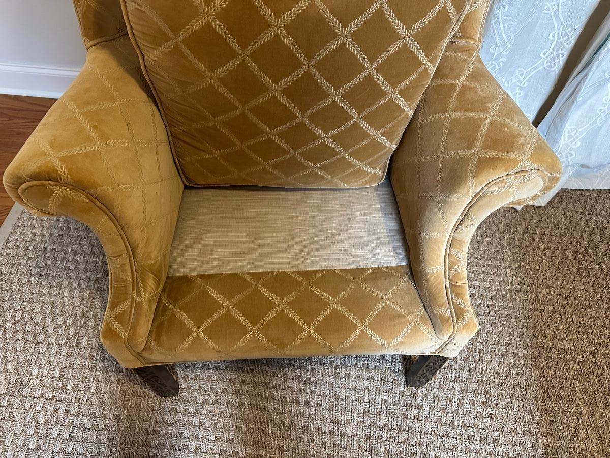 TWO elegant custom-upholstered wingback chairs by Kohlmaier of New Orleans. Features gold diamond-patterned embroidered velvet, rolled arms, and carved dark wood legs. High-quality craftsmanship with timeless style. In excellent condition with minimal wear.