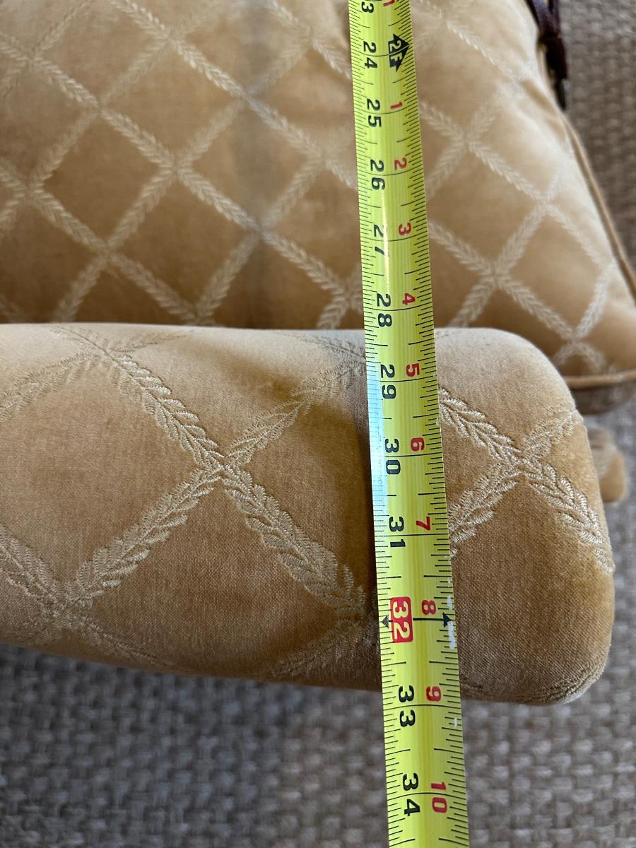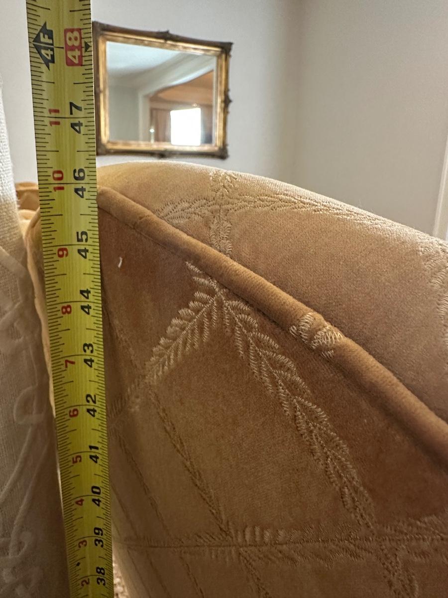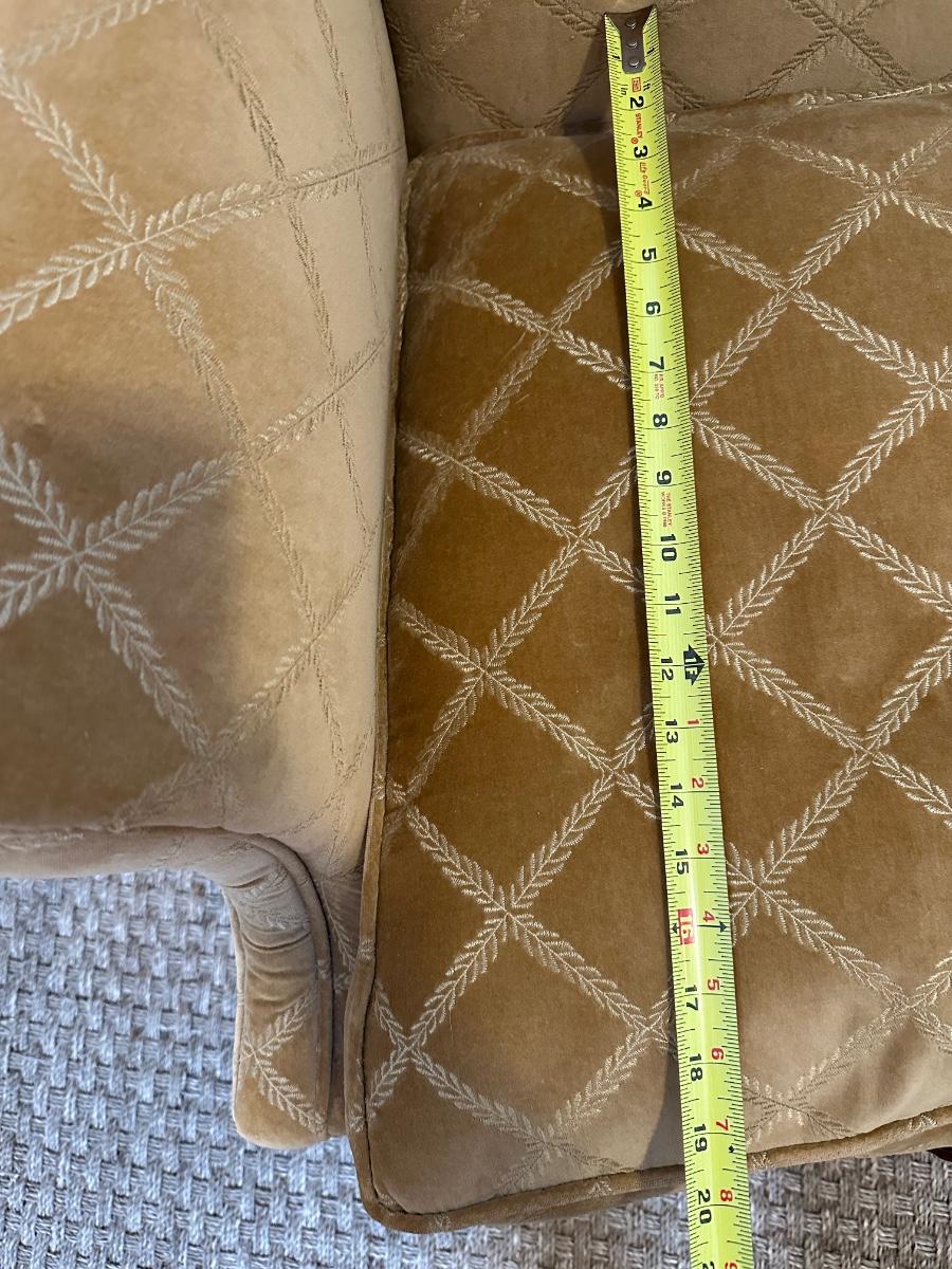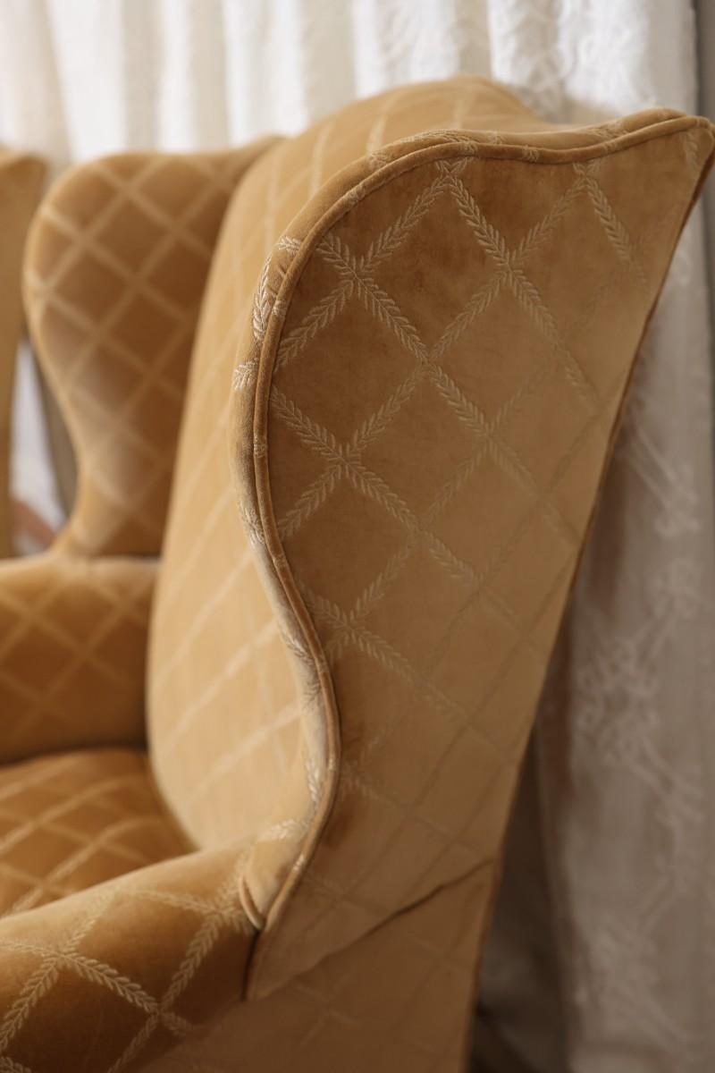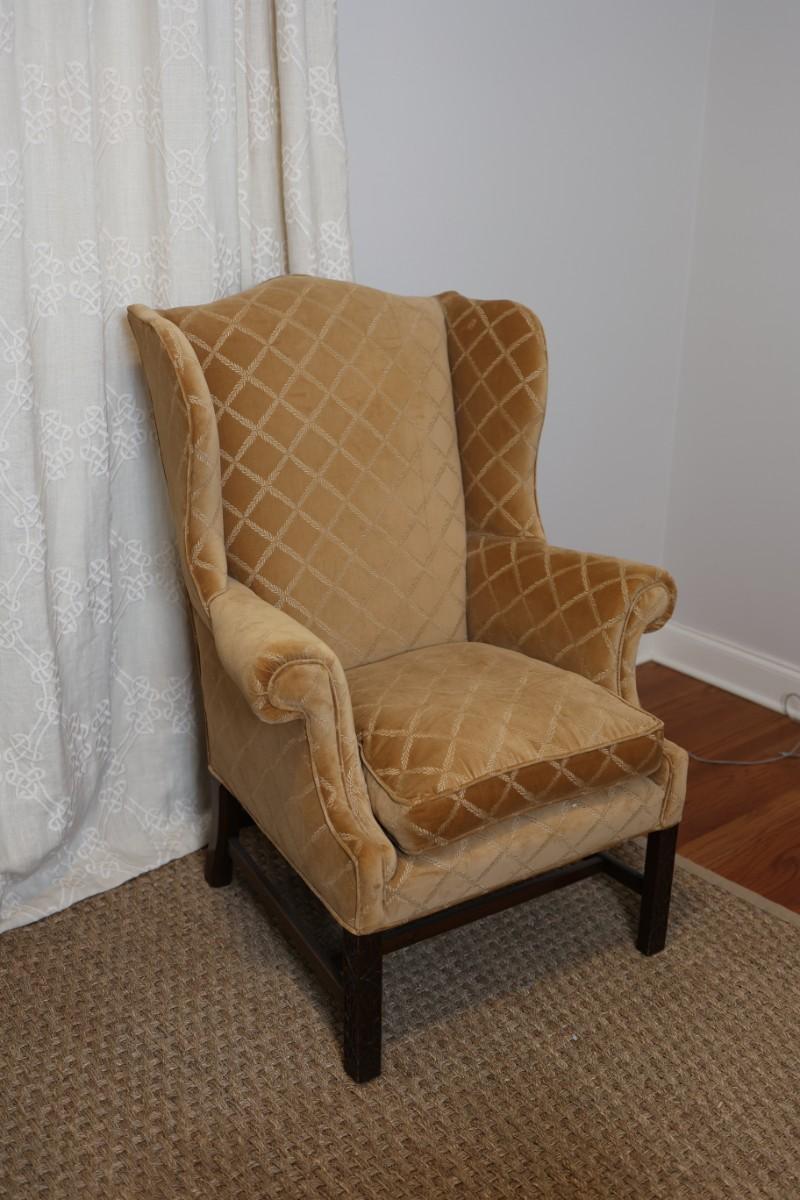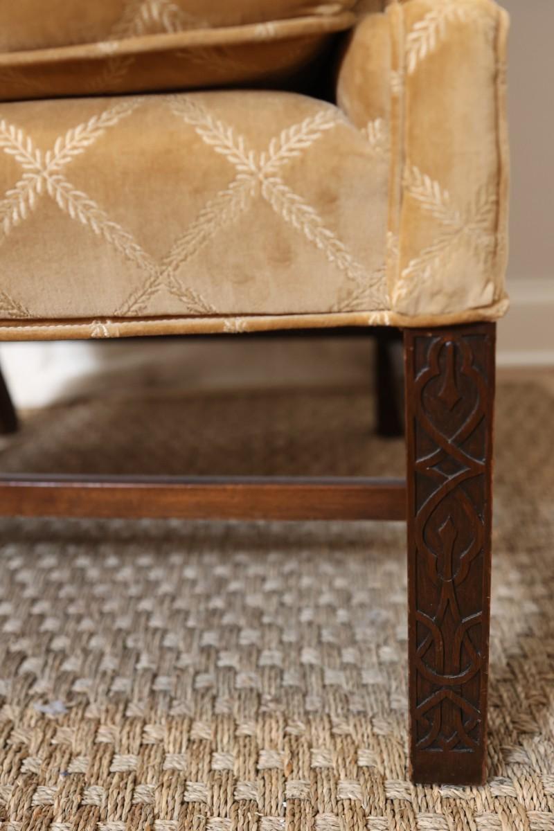 TWO elegant custom-upholstered wingback chairs by Kohlmaier of New Orleans. Features gold diamond-patterned embroidered velvet, rolled arms, and carved dark wood legs. High-quality craftsmanship with timeless style. In excellent condition with minimal wear.