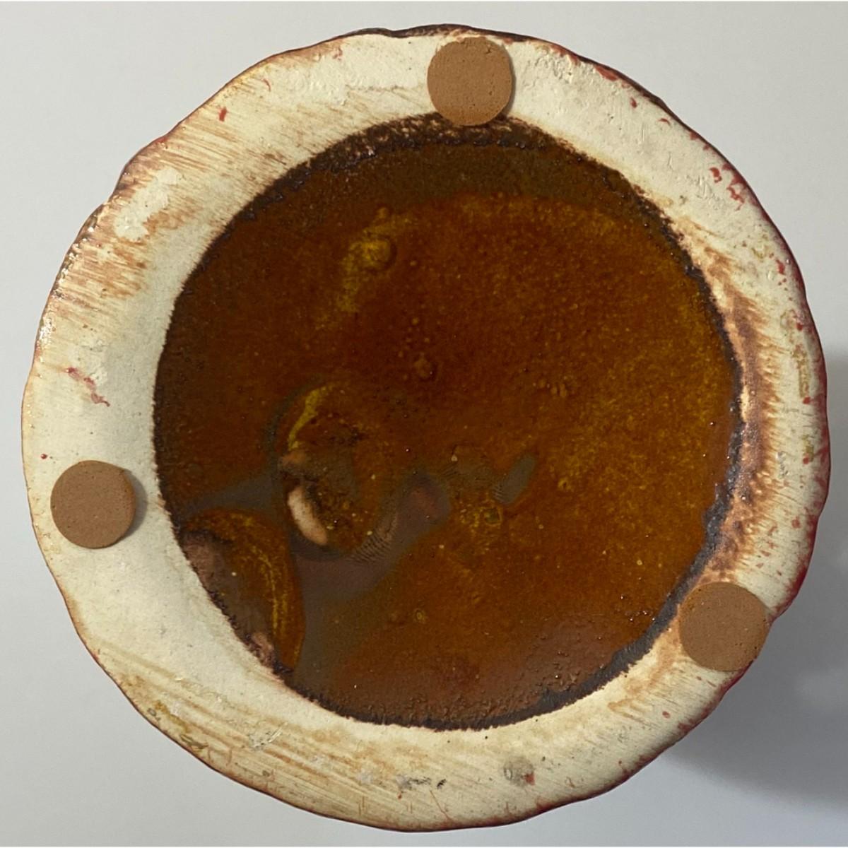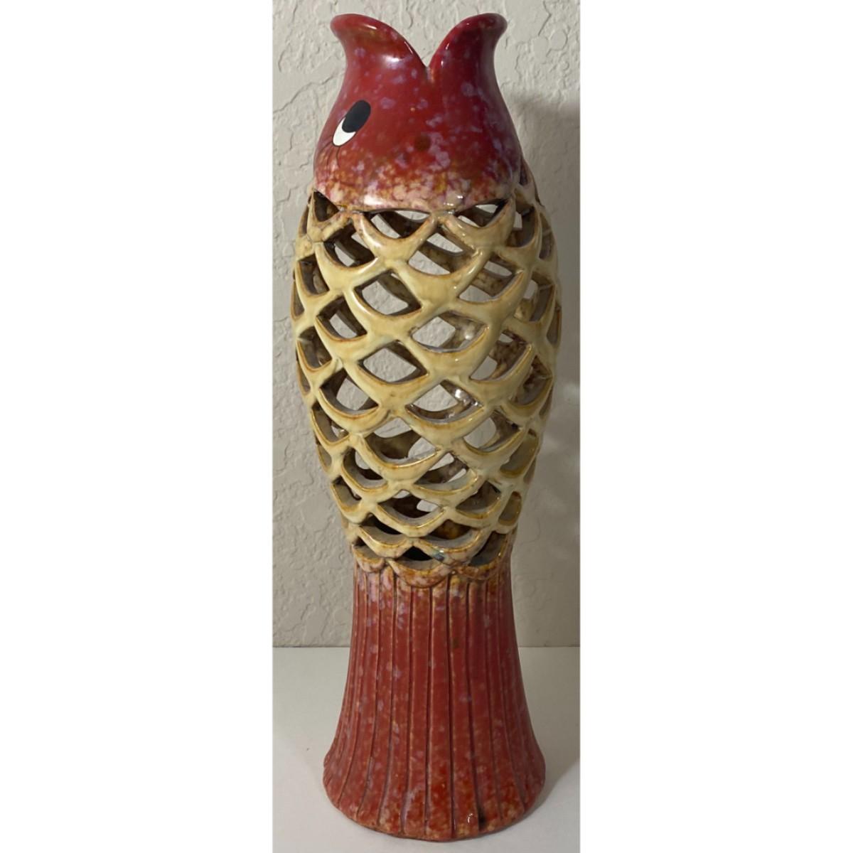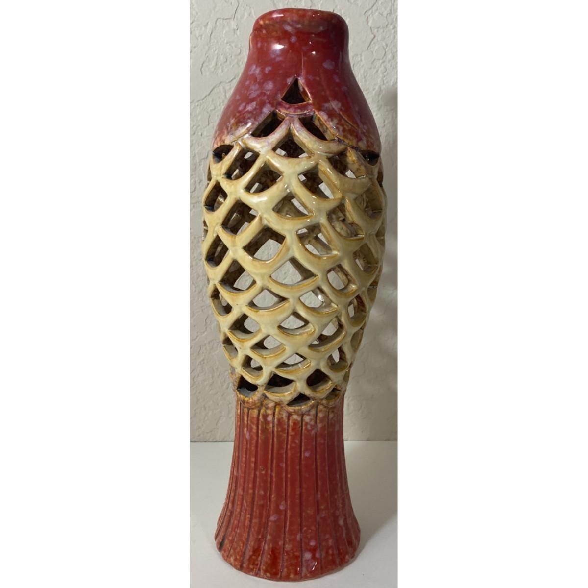 Koi Fish Laced Ribbed Ceramic Vase Red Tan